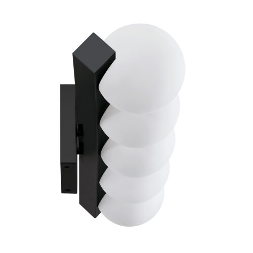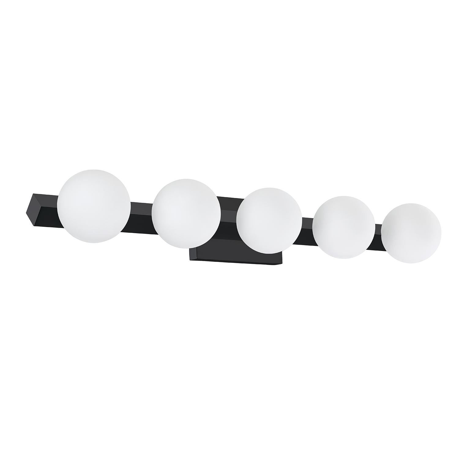 Elevate your bathroom decor with the ORBITRON 5-Light Black Vanity, a stunning blend of modern elegance and functional design. Featuring a sleek black finish and adorned with exquisite opal white glass globes, this vanity light offers a stylish illumination solution that enhances any space. With a compact extension of 6.7 inches and an overall height of 4.7 inches, it seamlessly integrates into various room sizes while providing ample lighting with its five G9 bulb capacity. Crafted from durable steel, the ORBITRON is not only built to last but also adds a touch of sophistication to your vanity area.