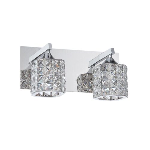 Elevate your bathroom or vanity space with the SHIMERA 2-Light Chrome Vanity Light, a stunning blend of modern design and timeless elegance. Featuring a sleek chrome finish, this exquisite fixture is adorned with cubic shades that are encrusted with dazzling Optic Crystal Jewels, adding a touch of sophistication to any decor. Designed to accommodate two G9 bulbs, the SHIMERA vanity light ensures ample illumination while creating a warm and inviting ambiance. The durable construction of this fixture is complemented by its eye-catching aesthetic, making it a perfect choice for both contemporary and classic interiors.