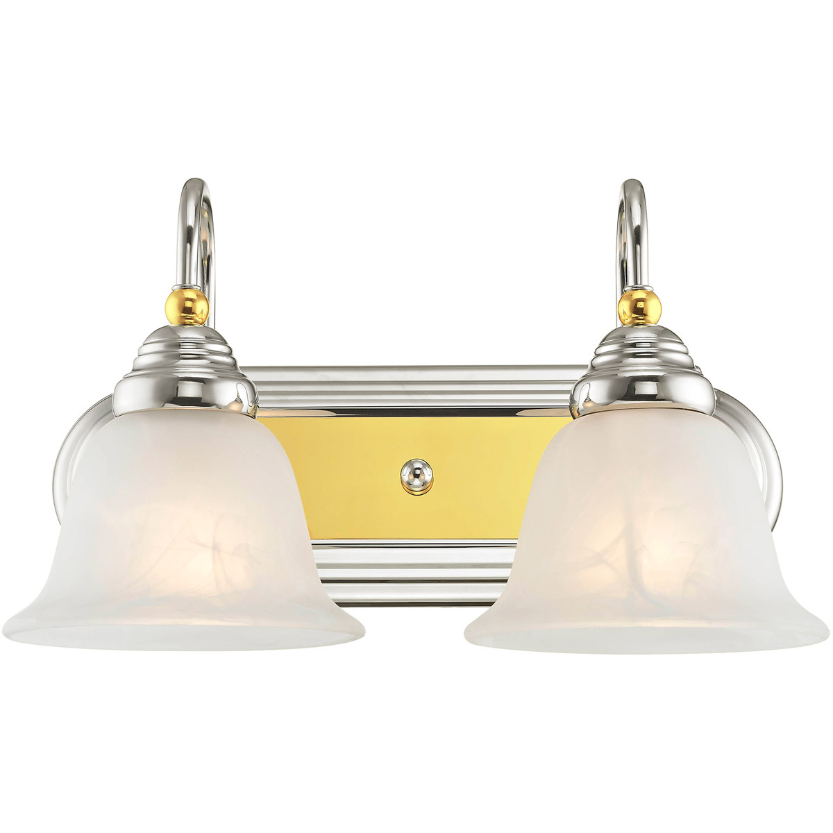 The Belmont bath bracket with polished brass accents & sweeping polished chrome arcs framing elegant, alabaster swirl glass. The Belmont collection is warm and traditional and will easily become the focal point of your special room.