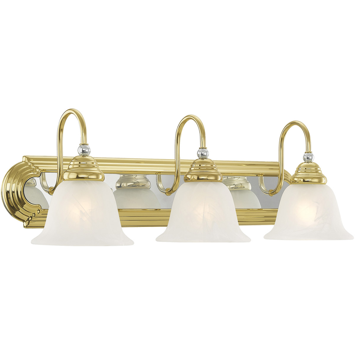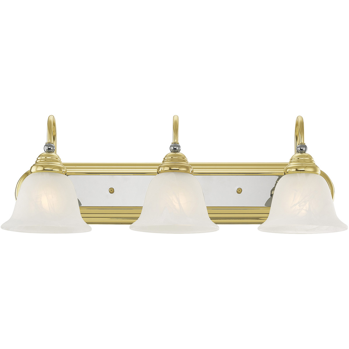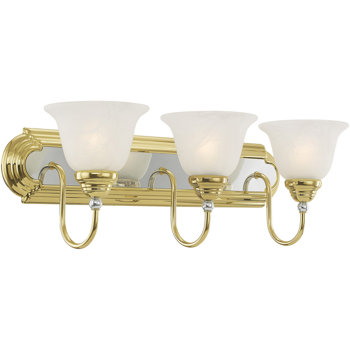 The Belmont bath bracket with polished chrome accents & sweeping polished brass arcs framing elegant, alabaster swirl glass. The Belmont collection is warm and traditional and will easily become the focal point of your special room.