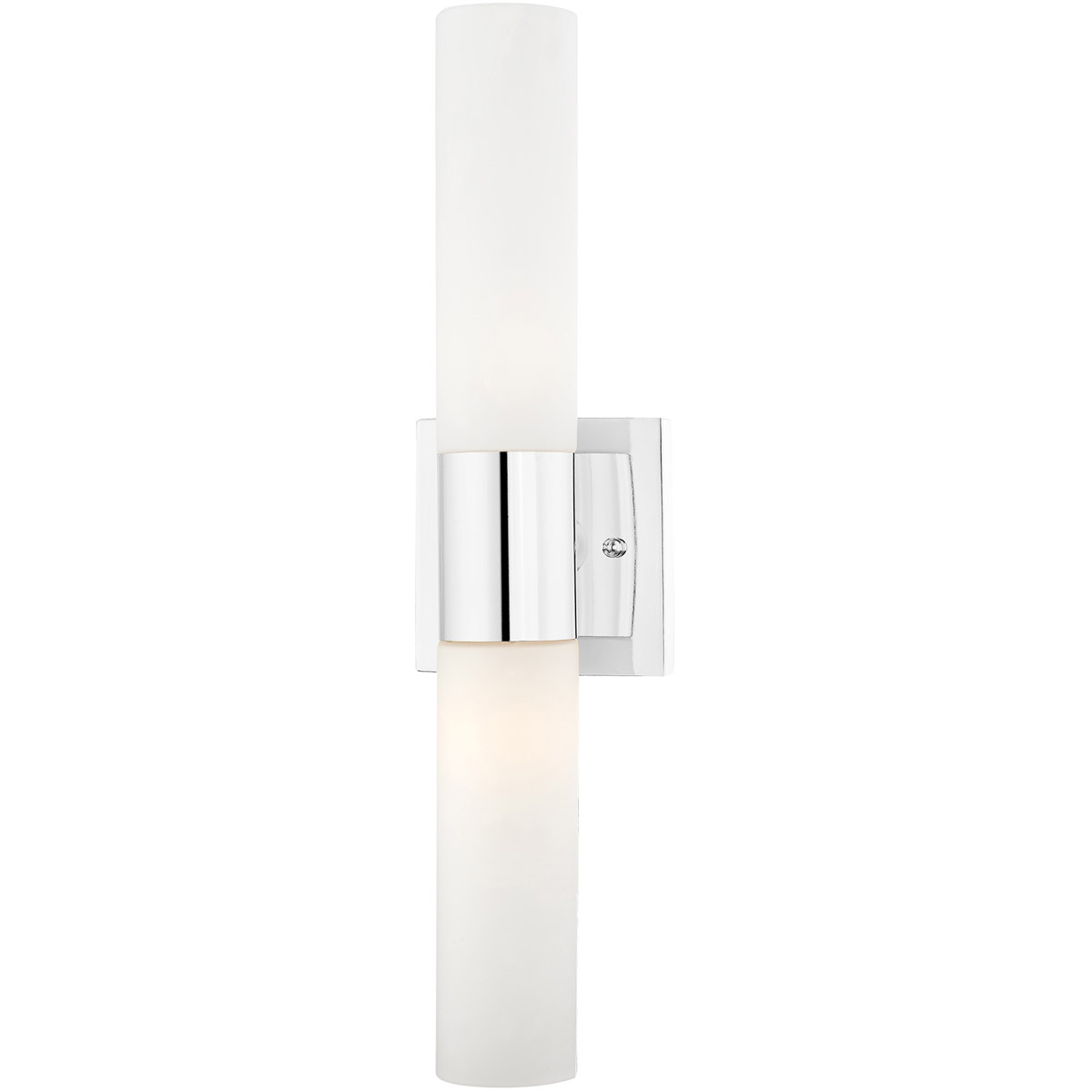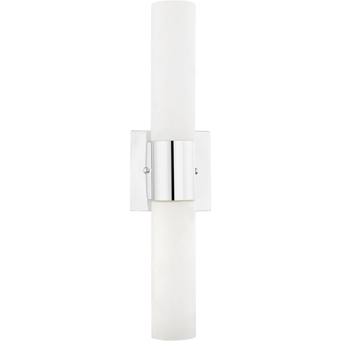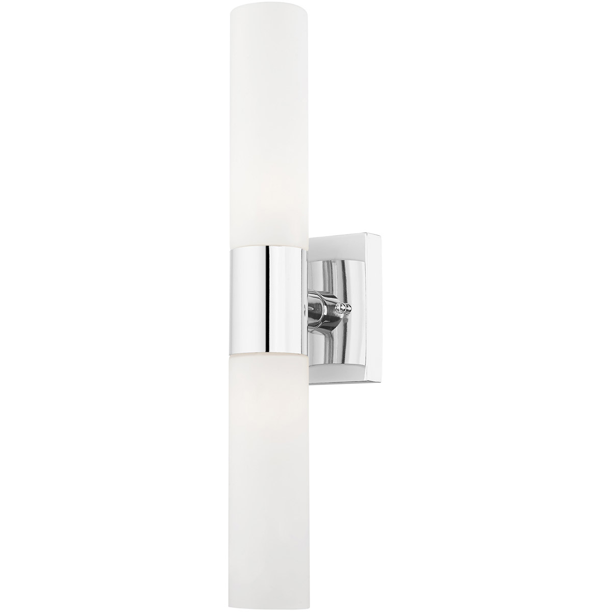 With the sleek contemporary design, the Aero bath bar casts a soft, flattering light which can be mounted horizontal or vertical. The tubular etched opal glass diffuses the light of two lamps. Available in brilliant polished chrome or a subdued brushed nickel.