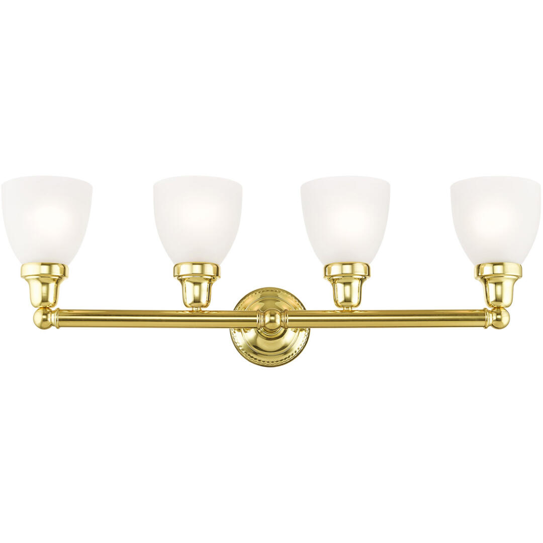 In a polished brass finish, this four light bath fixture features a timeless torchiere design. Topped with satin glass shades which provide a clean and classic look that will complete any space. This fixture is the perfect finishing touch to your bathroom!