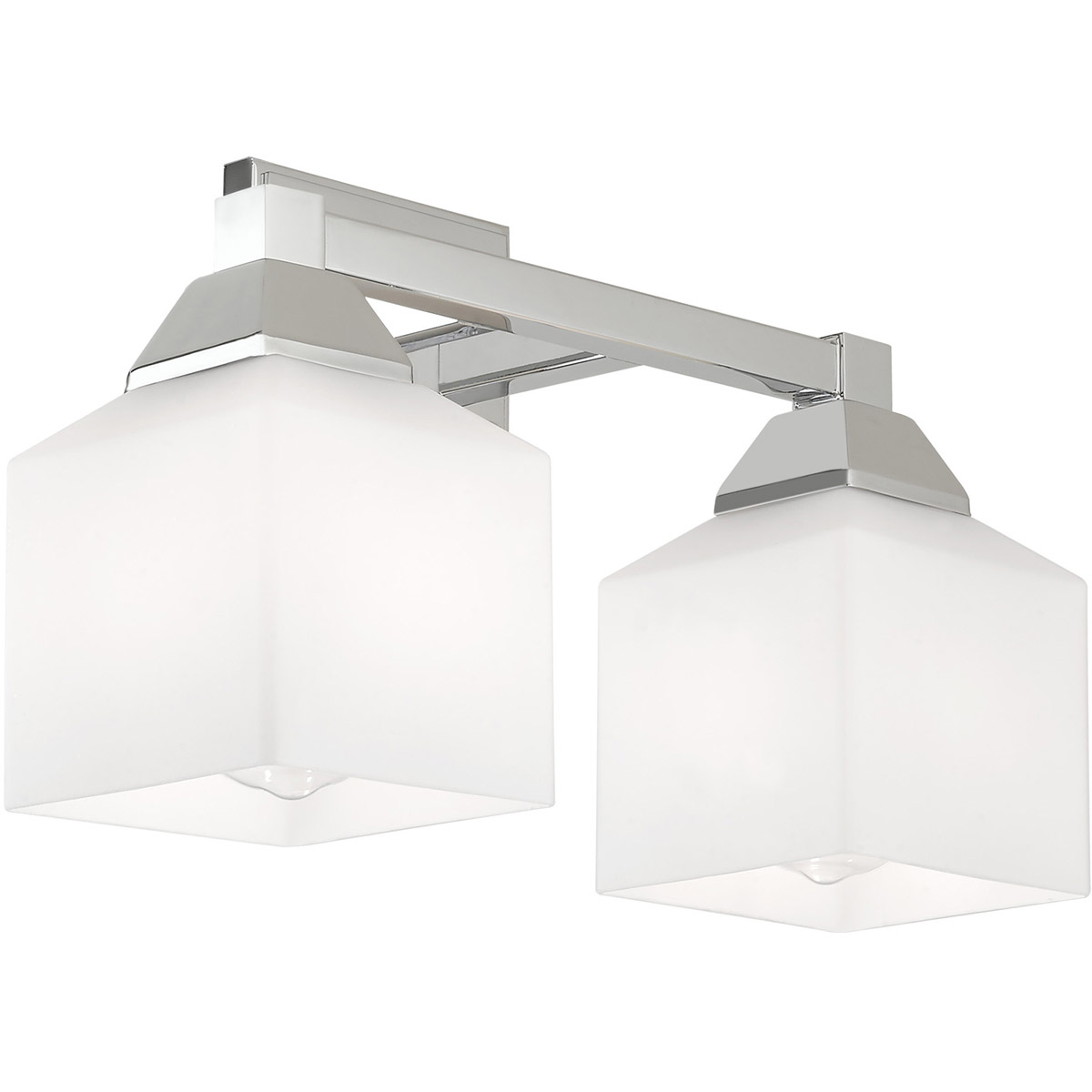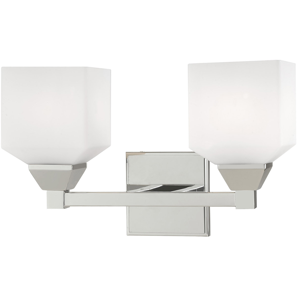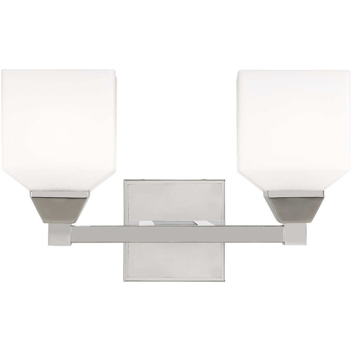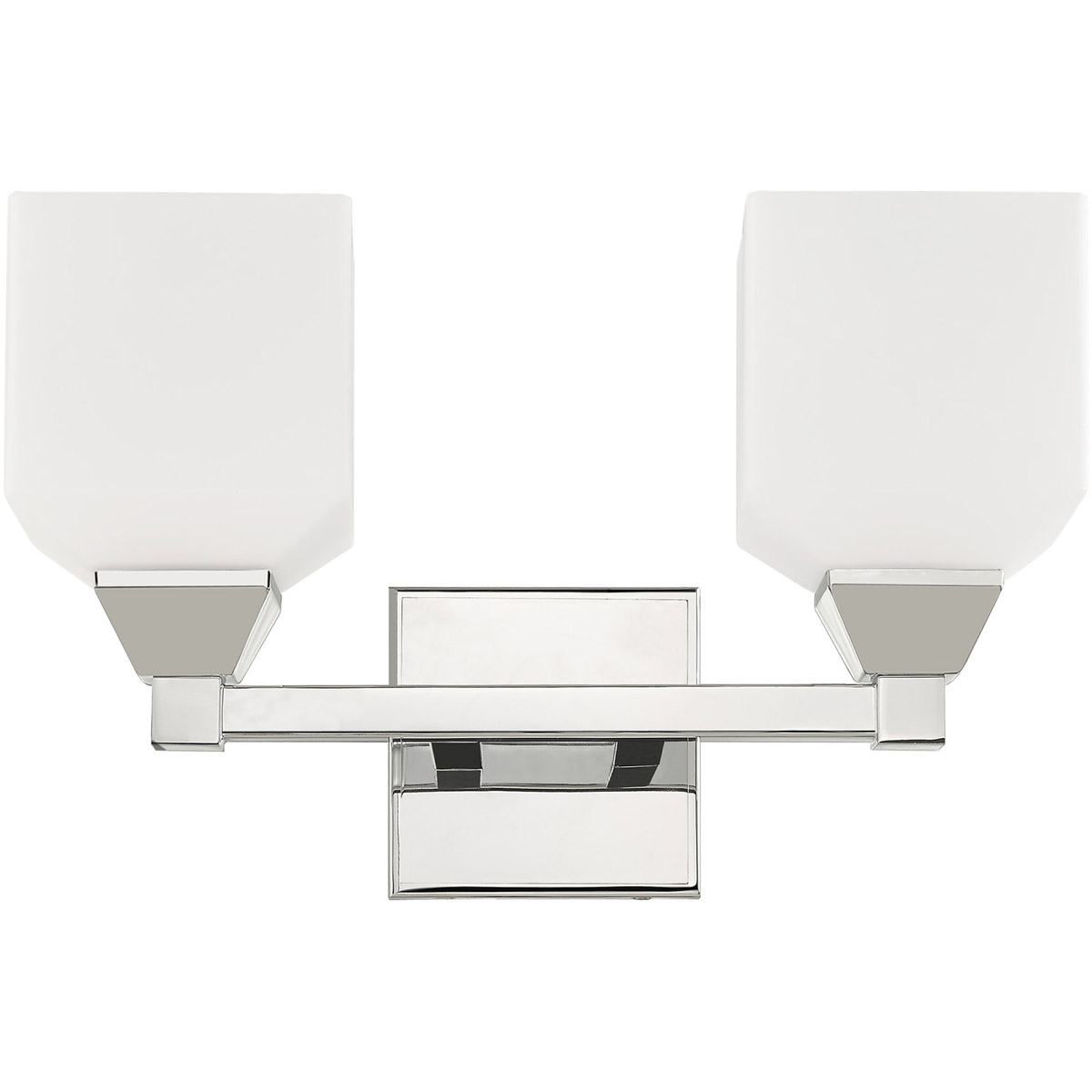 This bath vanity light is sure to provide reliable illumination without sacrificing style. It features two satin opal white glass shades with an open bottom, exposing the bulbs inside. A polished chrome finish covers the backplate and accents the light.