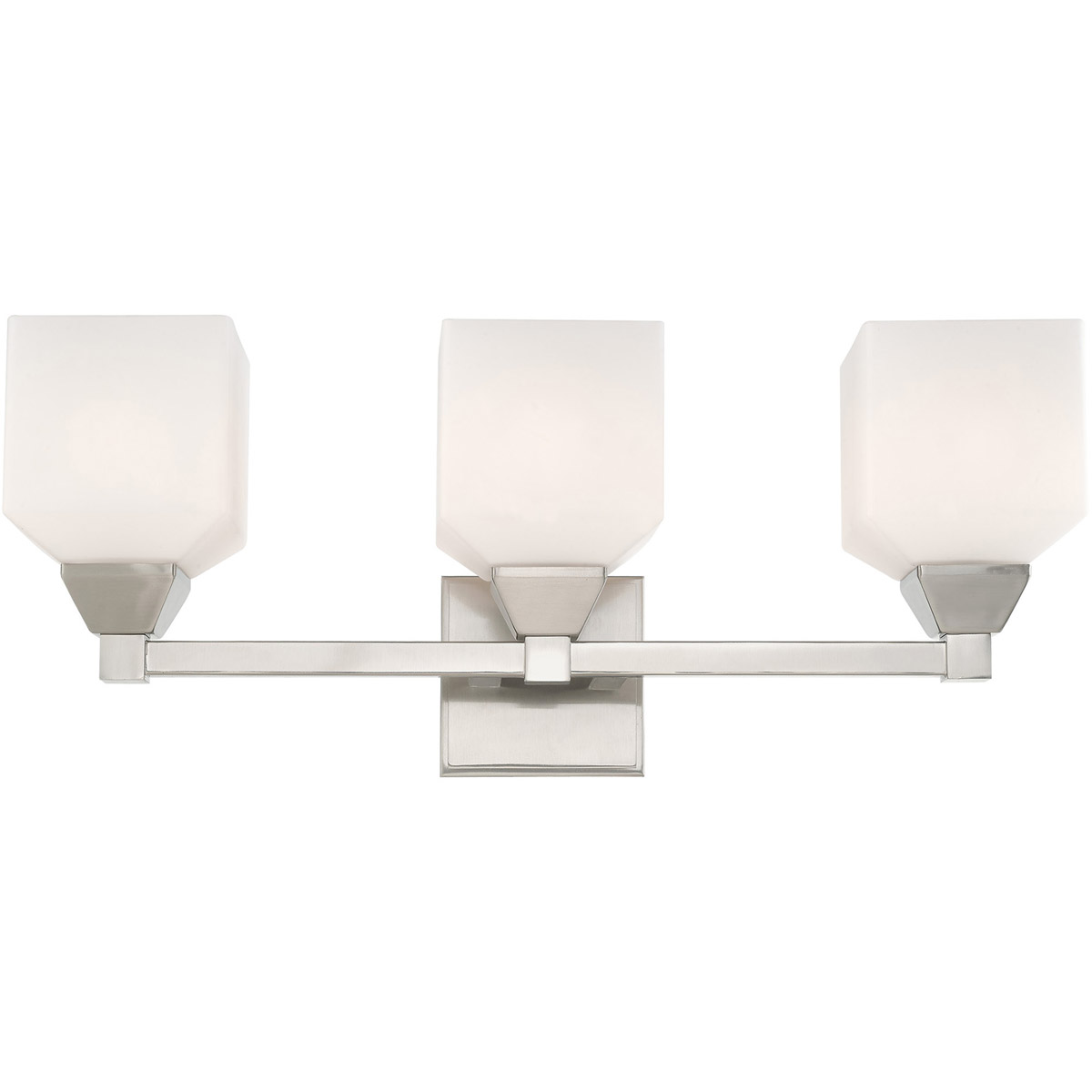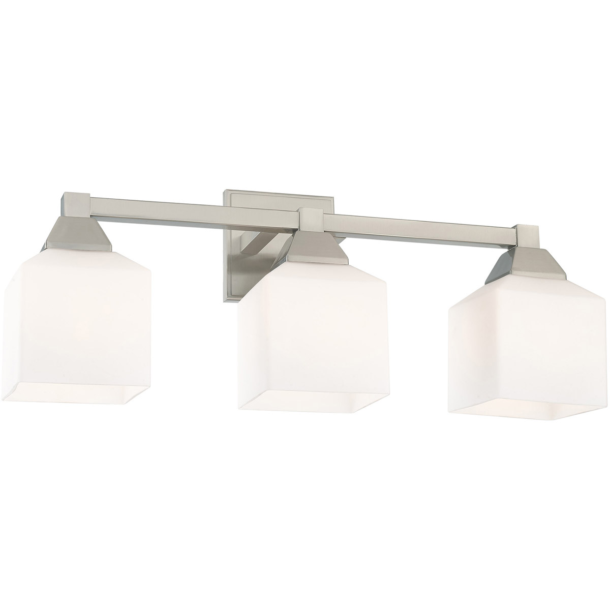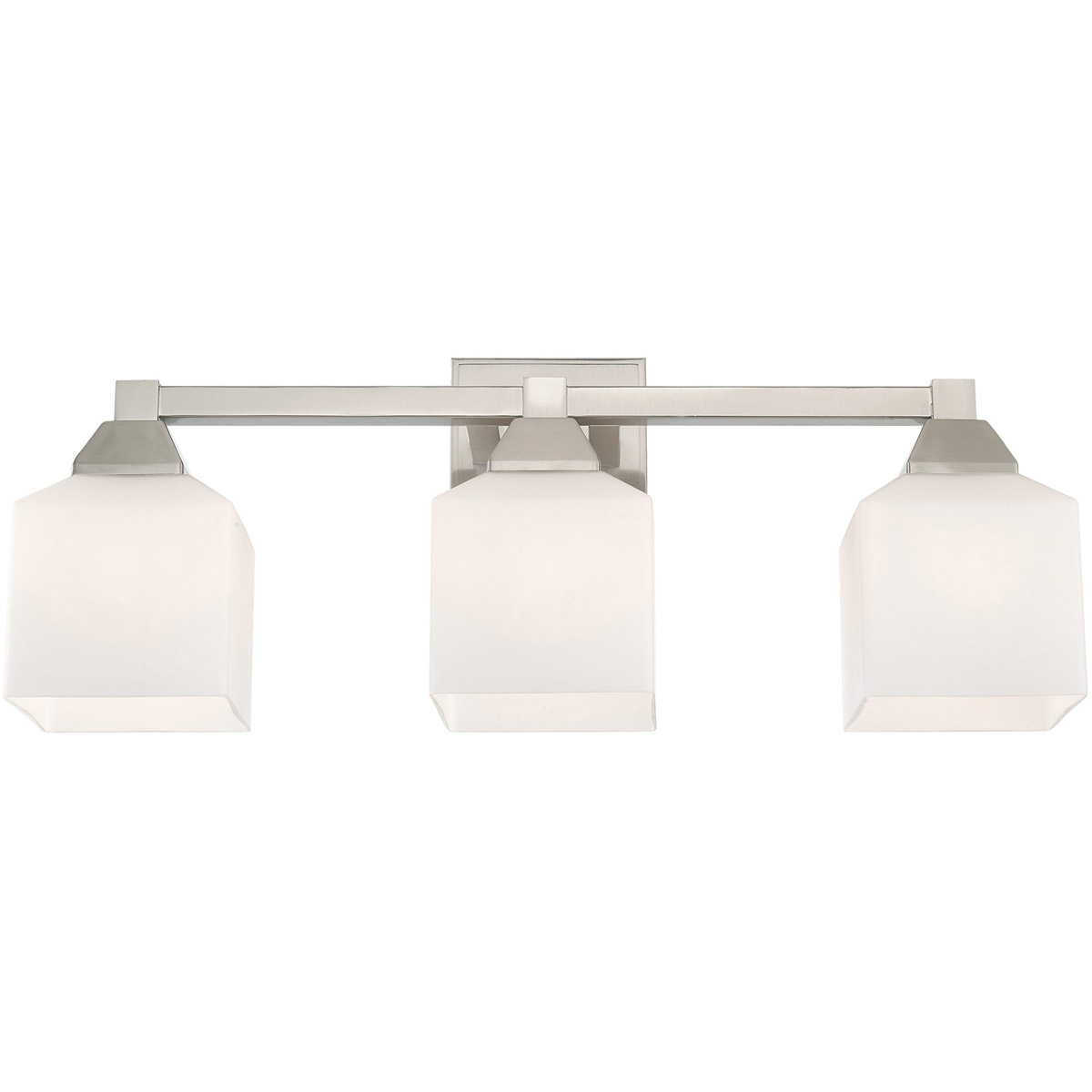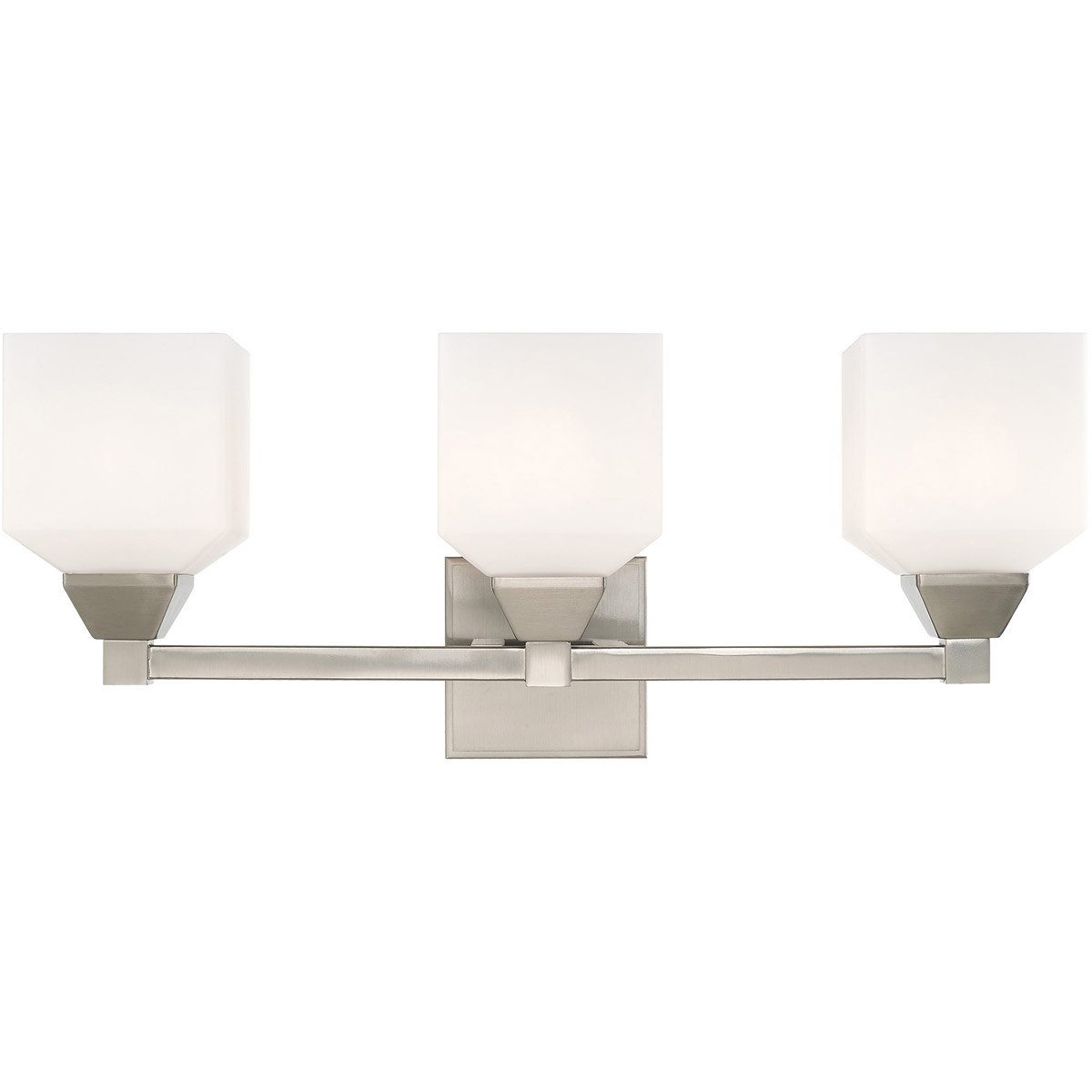 This bath vanity light is sure to provide reliable illumination without sacrificing style. It features three satin opal white glass shades with an open bottom, exposing the bulbs inside. A brushed nickel finish covers the backplate and accents the light.