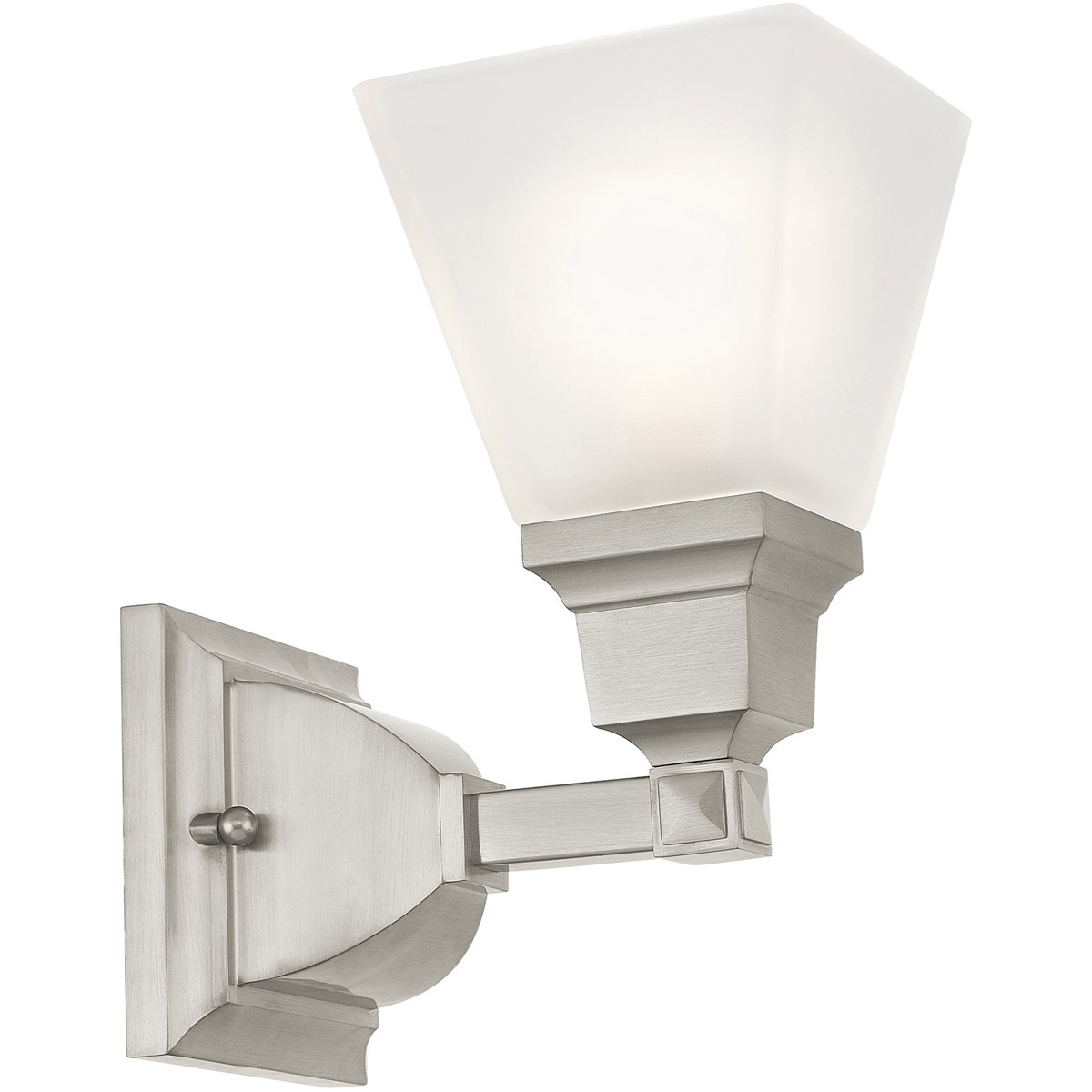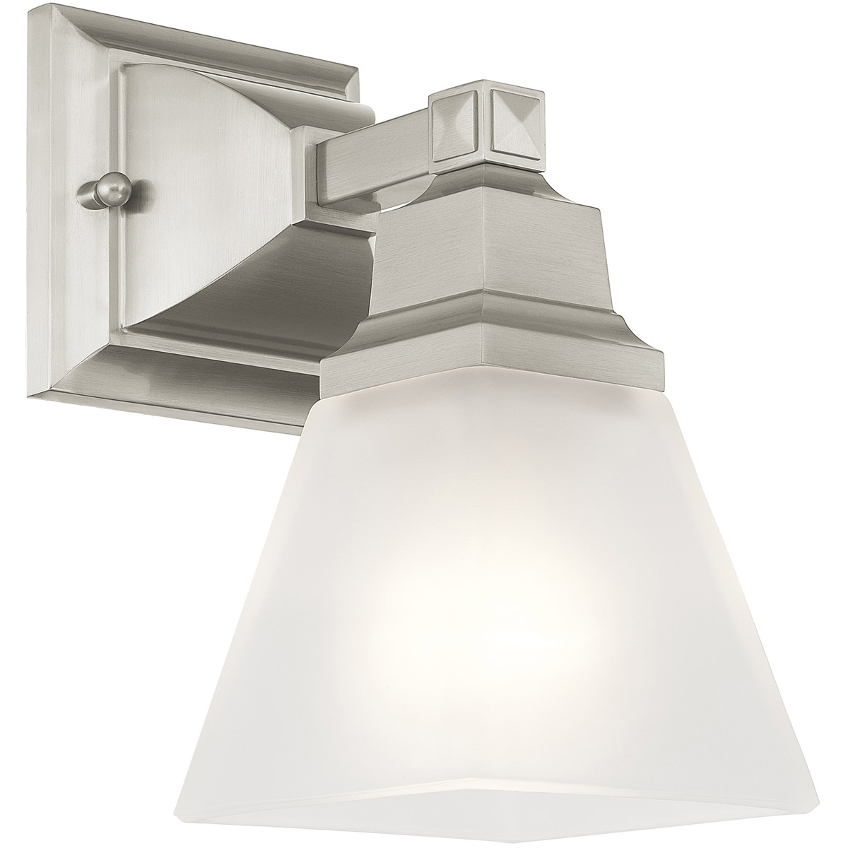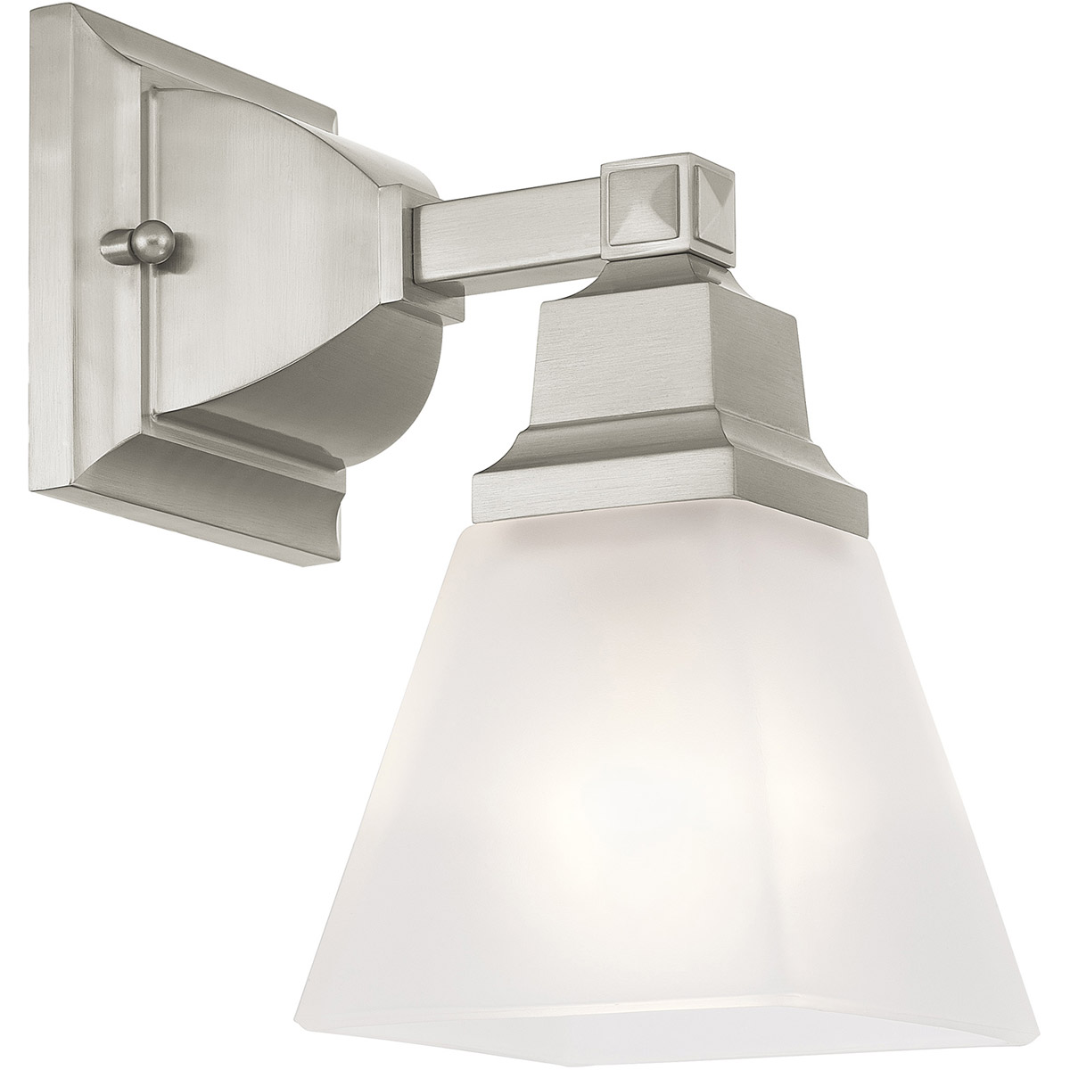 The Mission collection has clean lines with geometric forms. This one light bath fixture with satin glass is finished in brushed nickel. Square bar style arms elevate the glass.