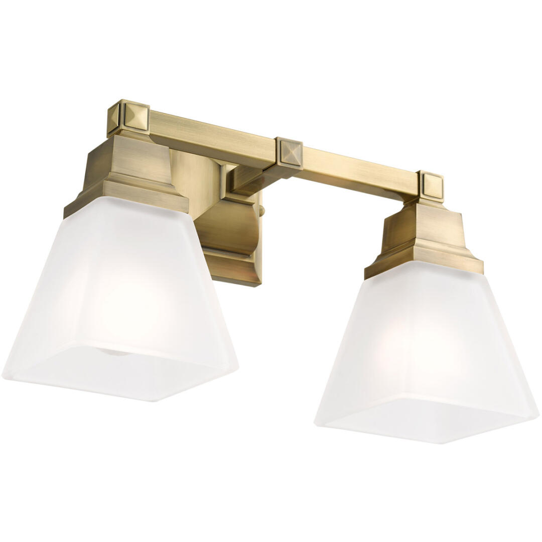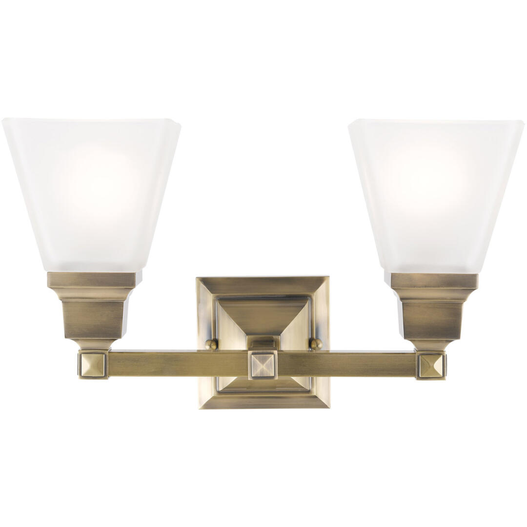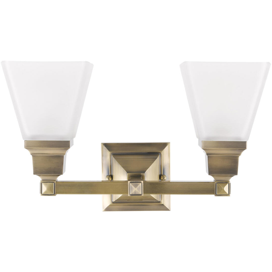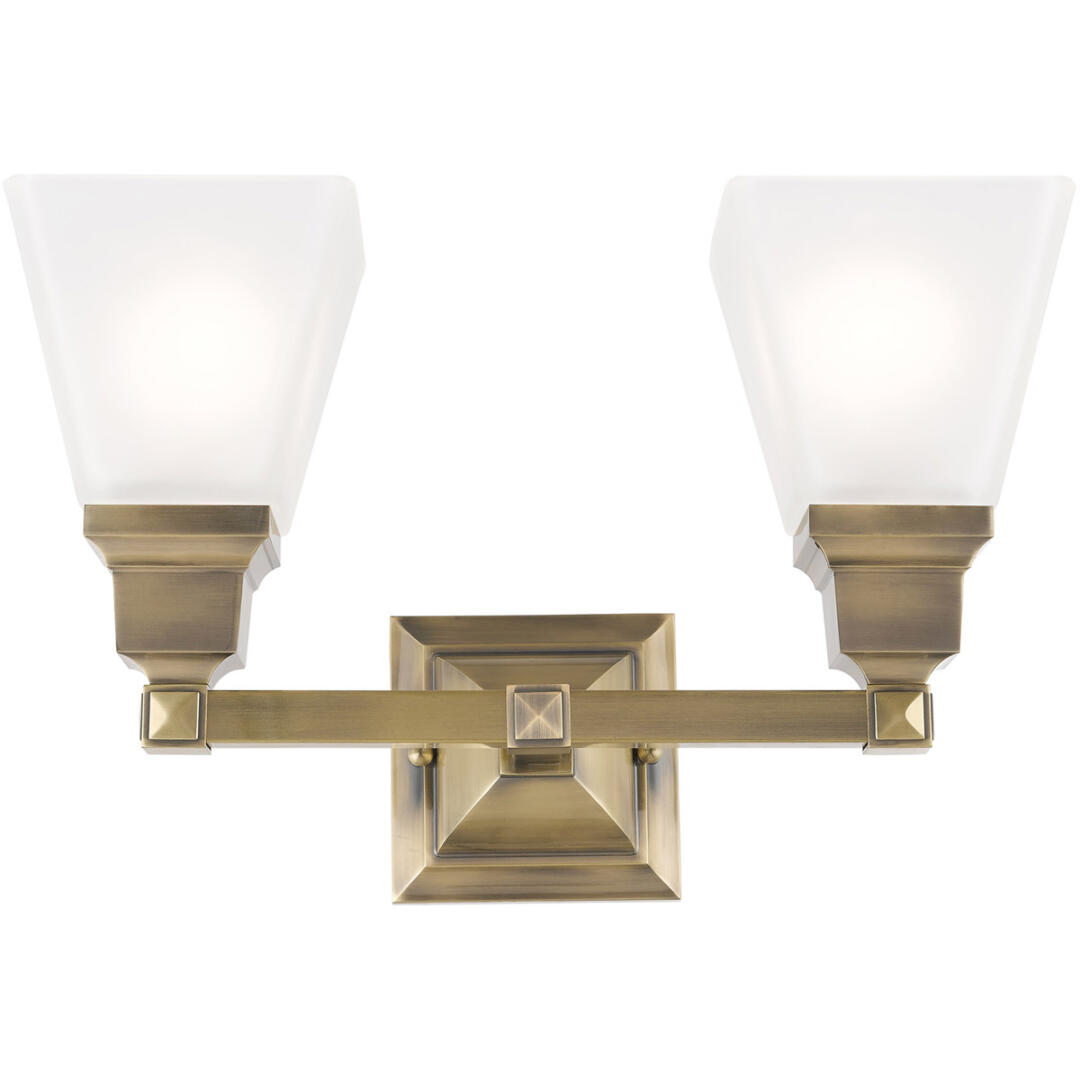 The Mission collection has clean lines with geometric forms. This two light bath fixture with satin glass is finished in antique brass. Square bar style arms elevate the glass.