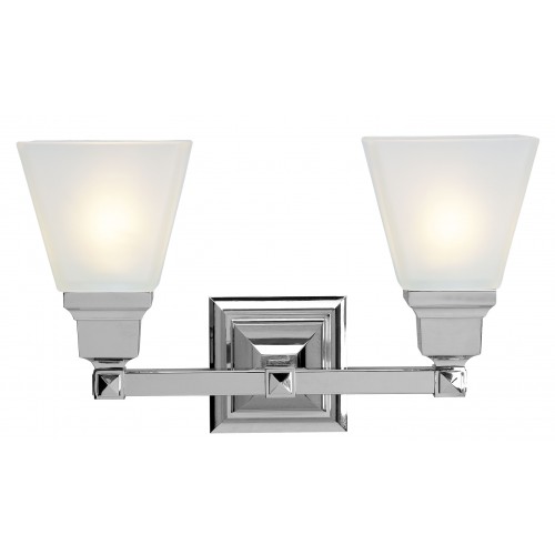 The Mission collection has clean lines with geometric forms. This two light bath fixture with satin glass is finished in polished chrome. Square bar style arms elevate the glass.