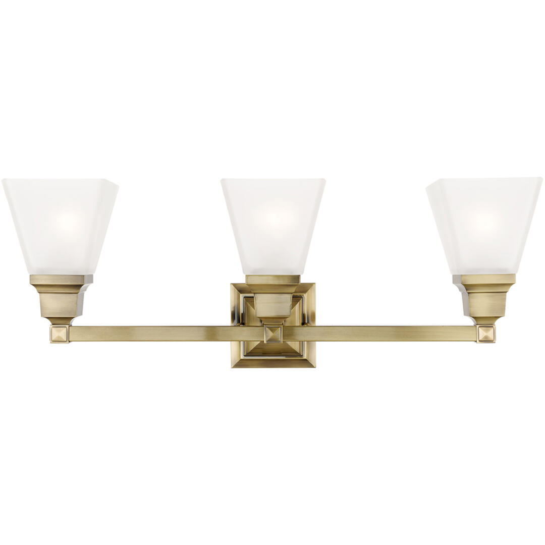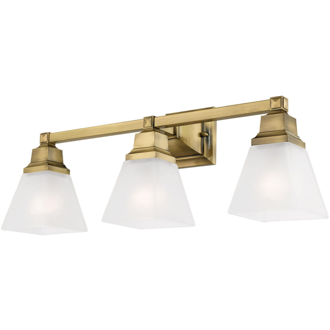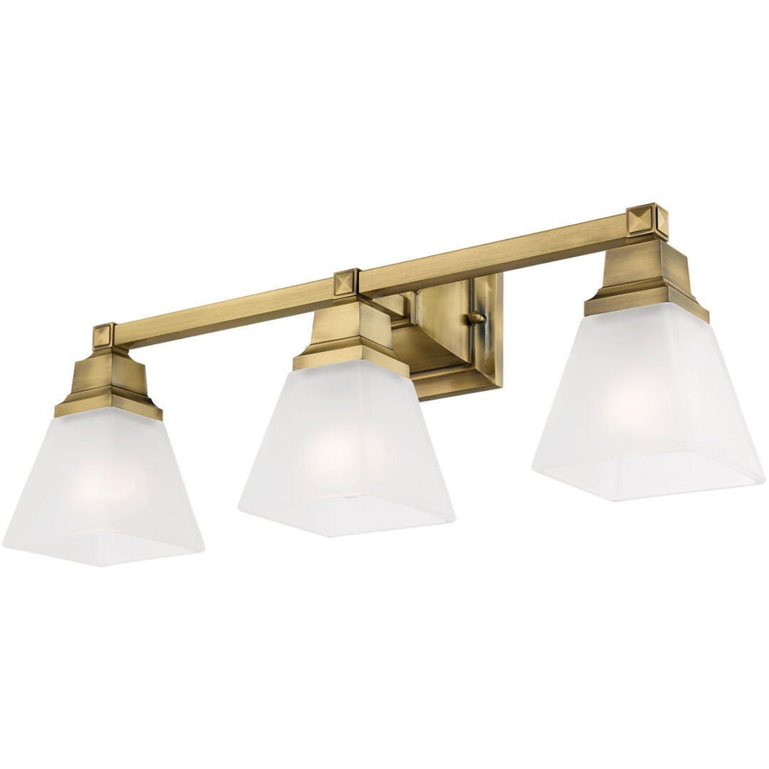 The Mission collection has clean lines with geometric forms. This three light bath fixture with satin glass is finished in antique brass. Square bar style arms elevate the glass.