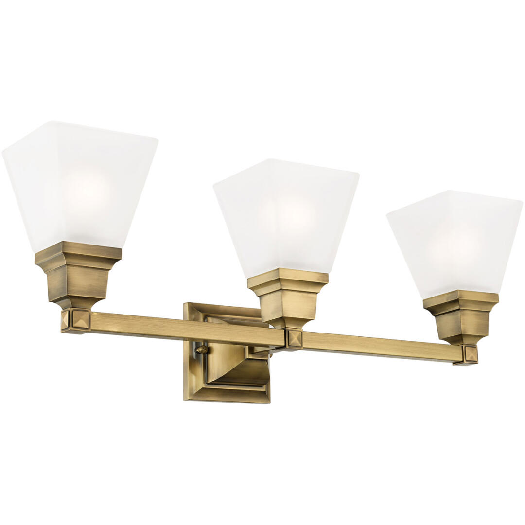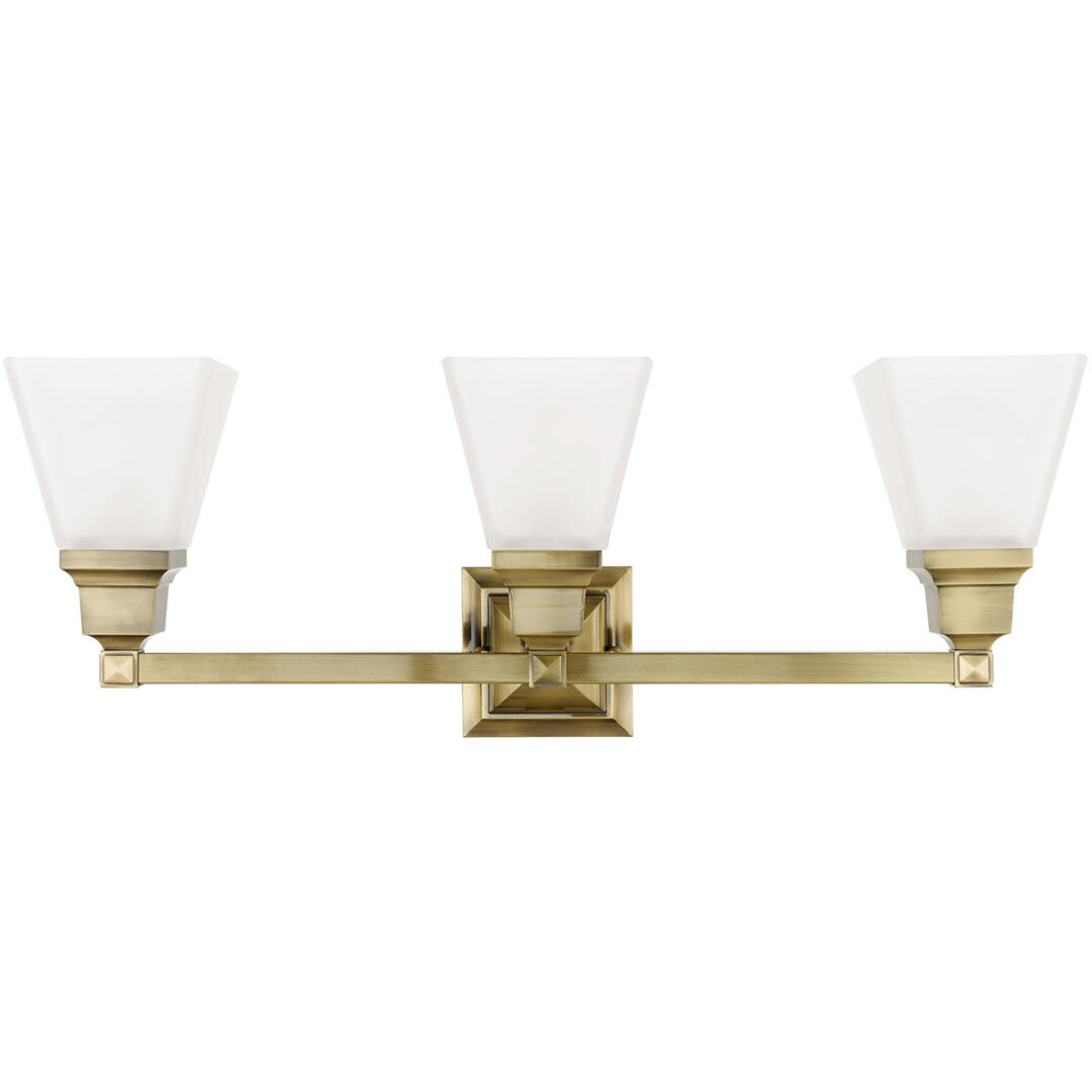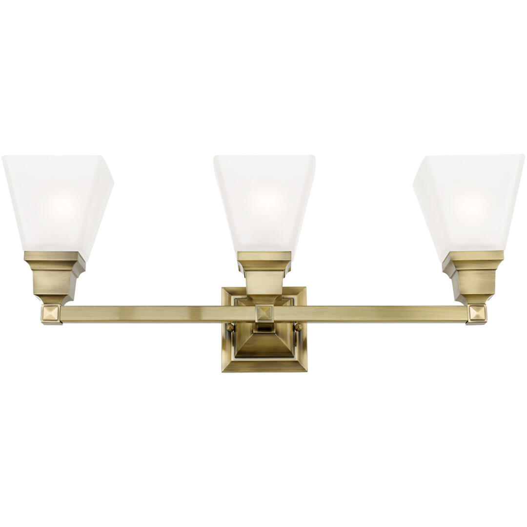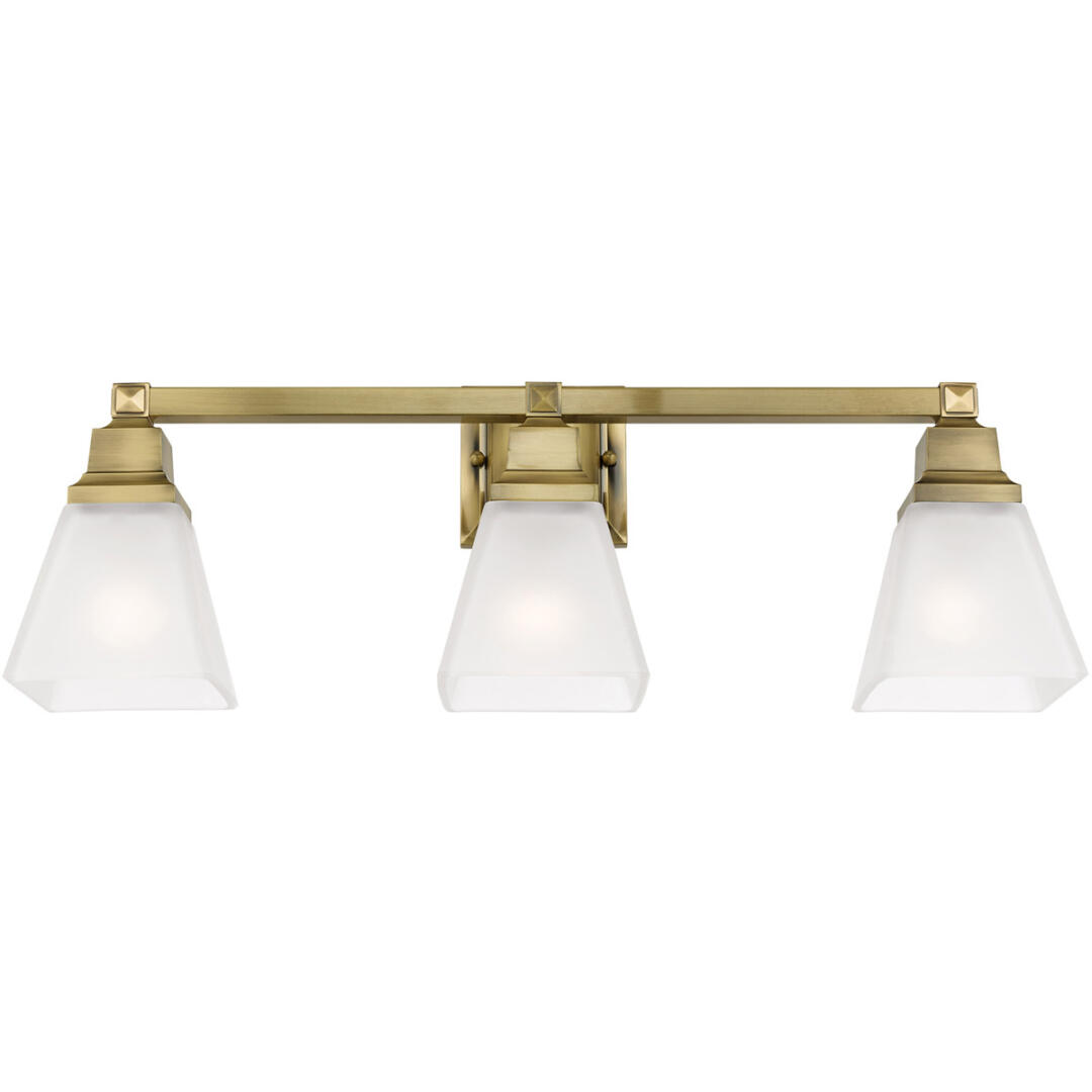 The Mission collection has clean lines with geometric forms. This three light bath fixture with satin glass is finished in antique brass. Square bar style arms elevate the glass.