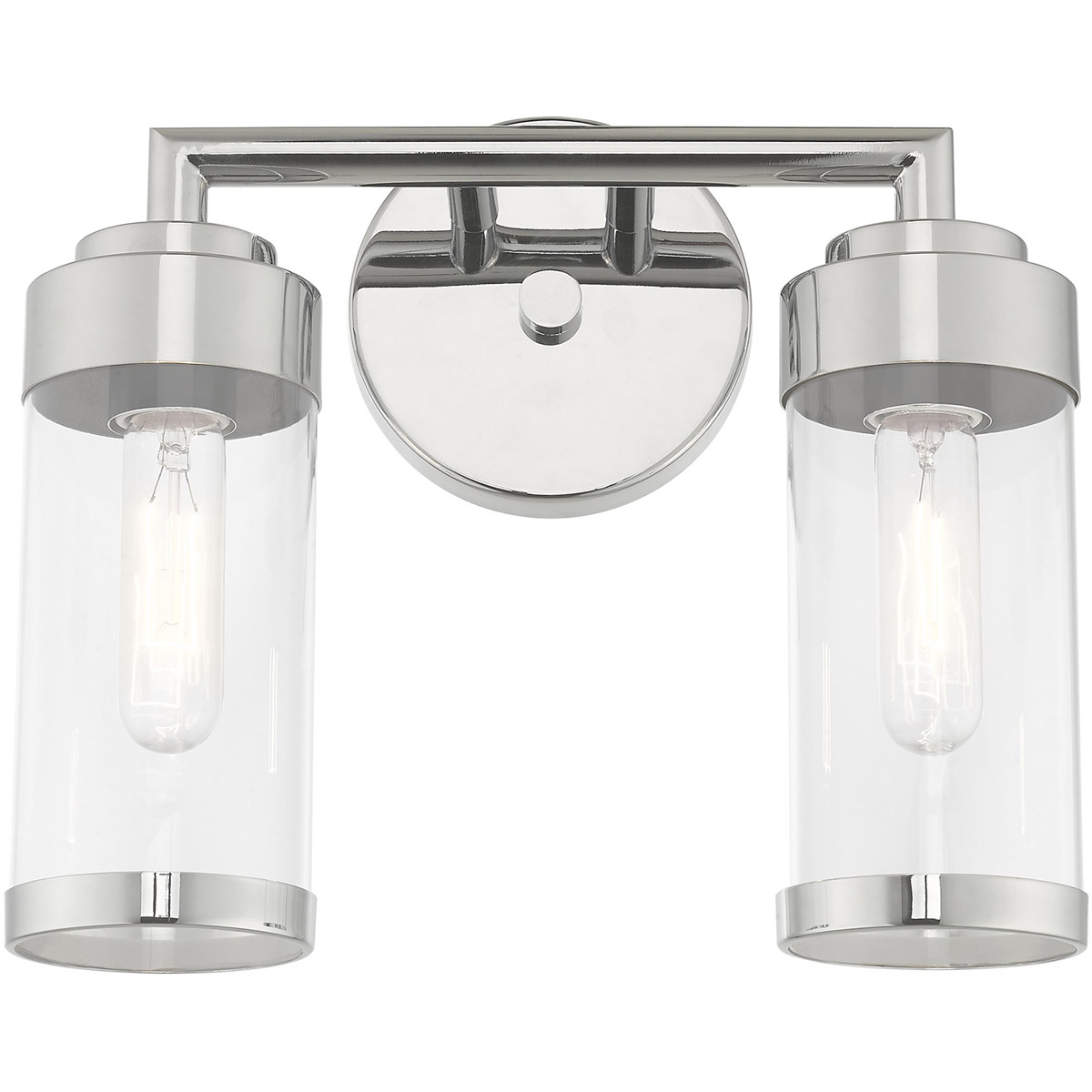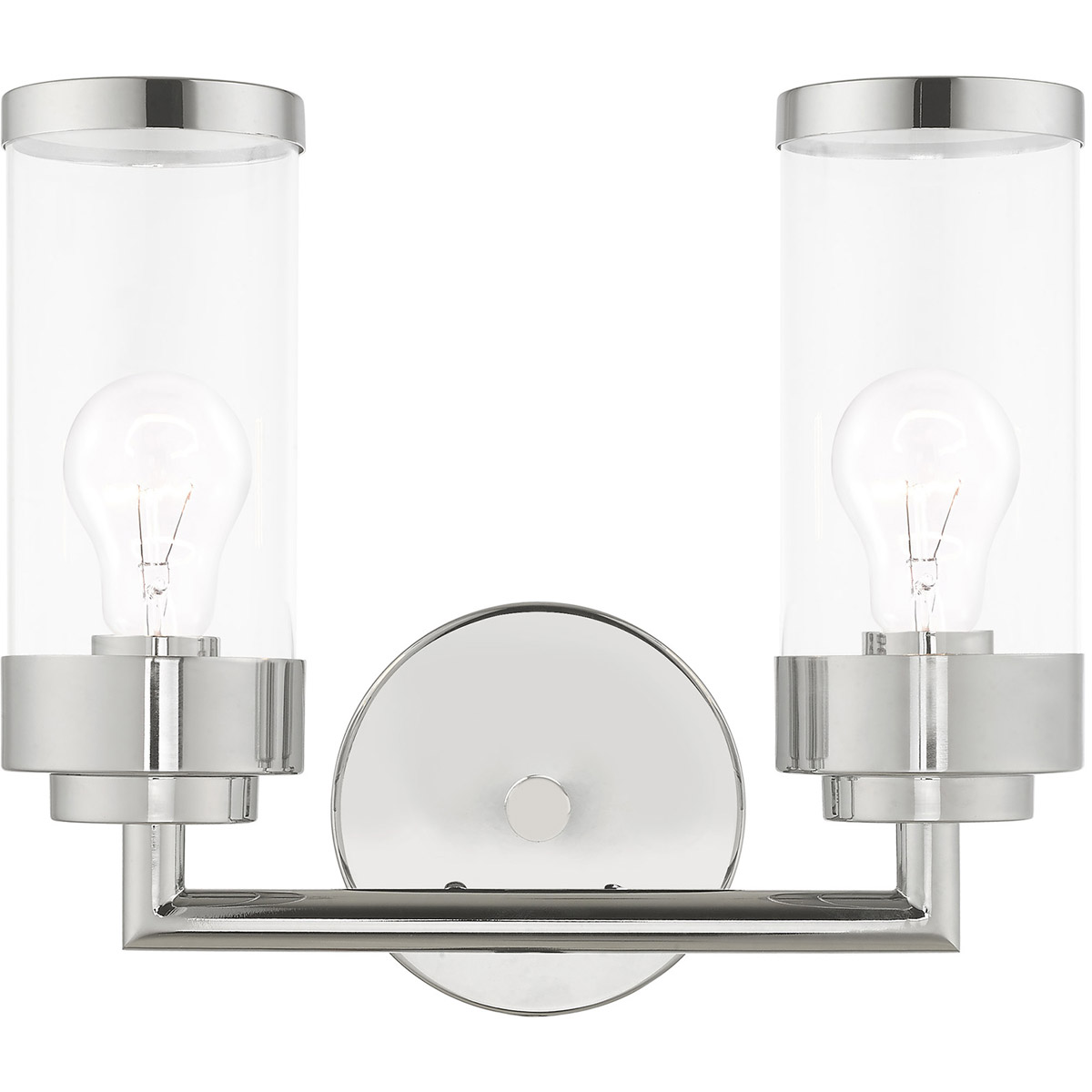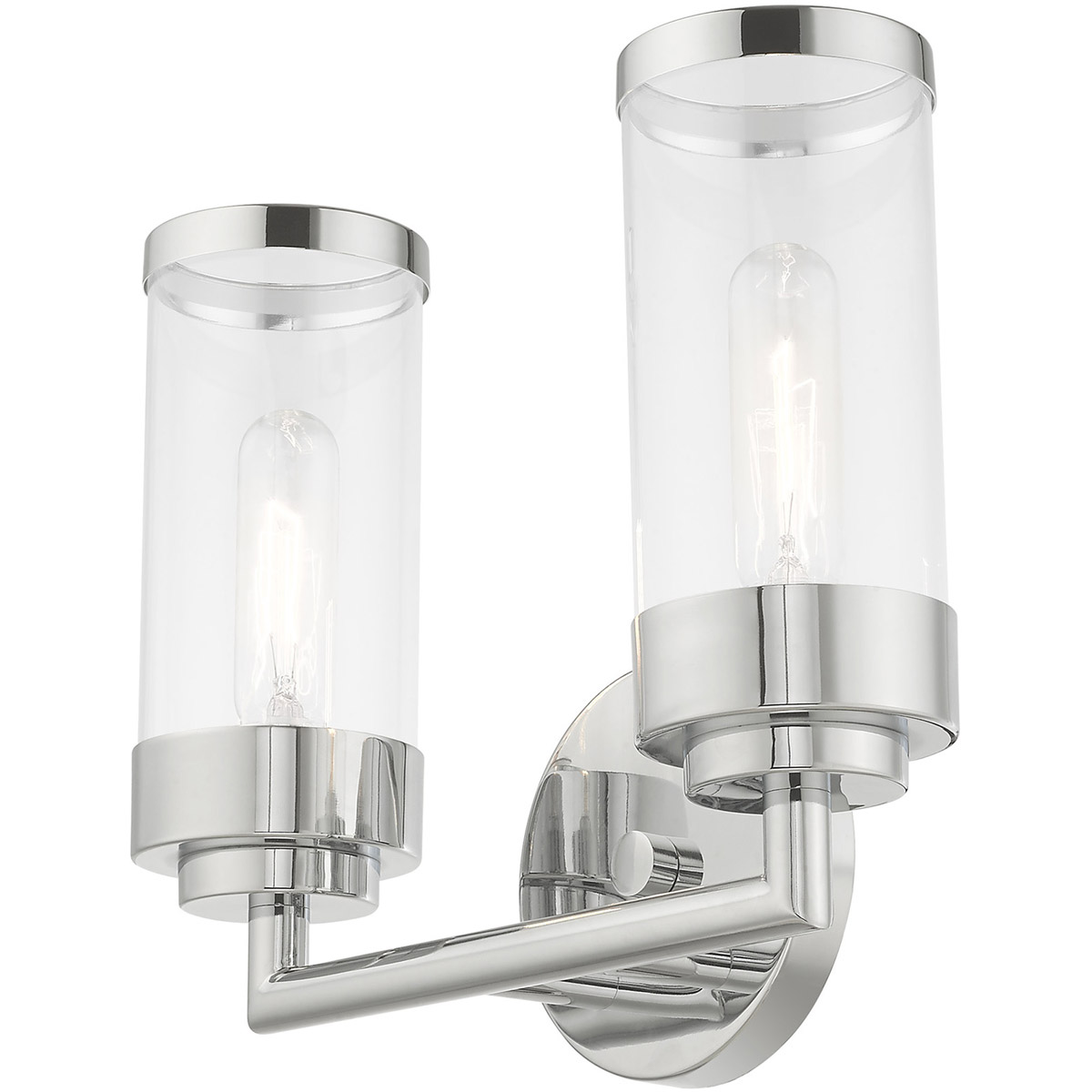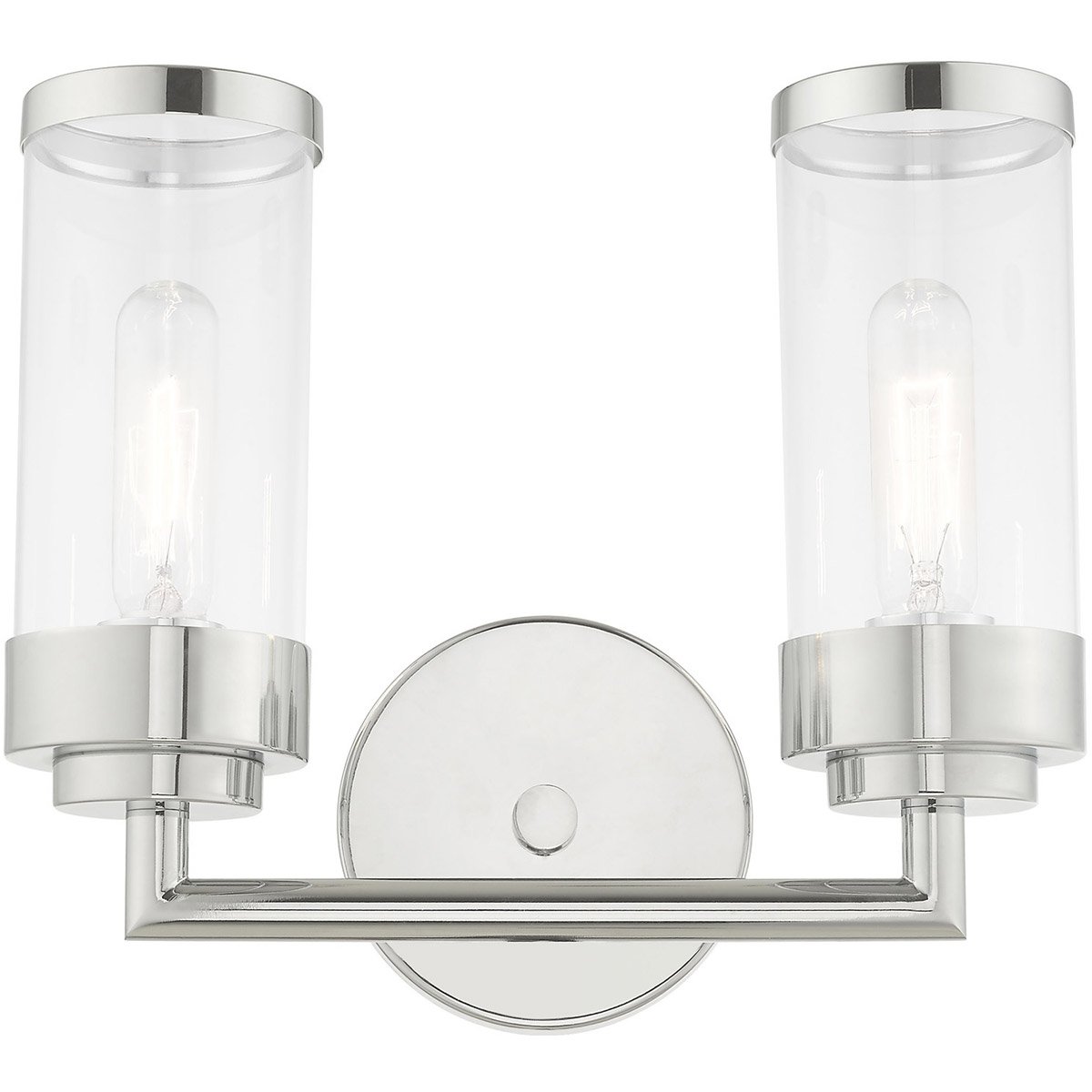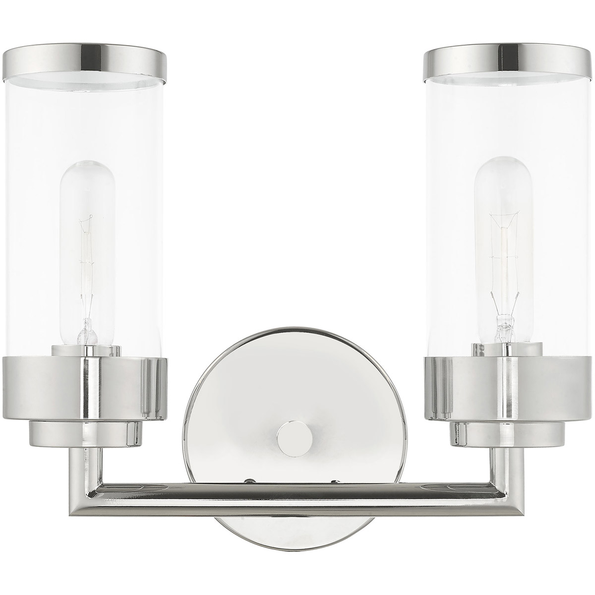 The two light bath vanity from the Hillcrest collection features a simple elegant polished chrome frame paired with clear glass shades. Each shade is accented with a banded polished chrome ring to carry through the theme of finely crafted metal fittings.