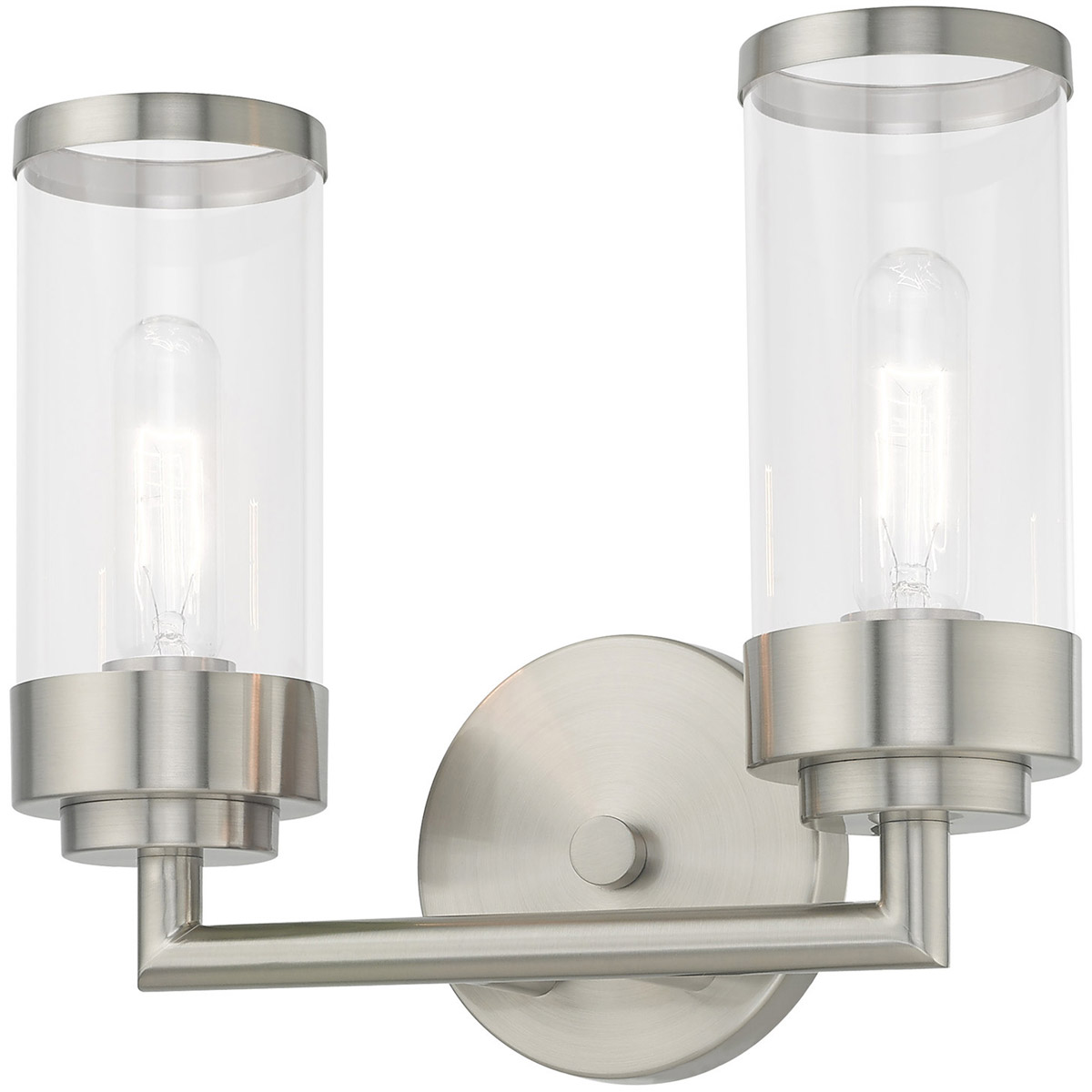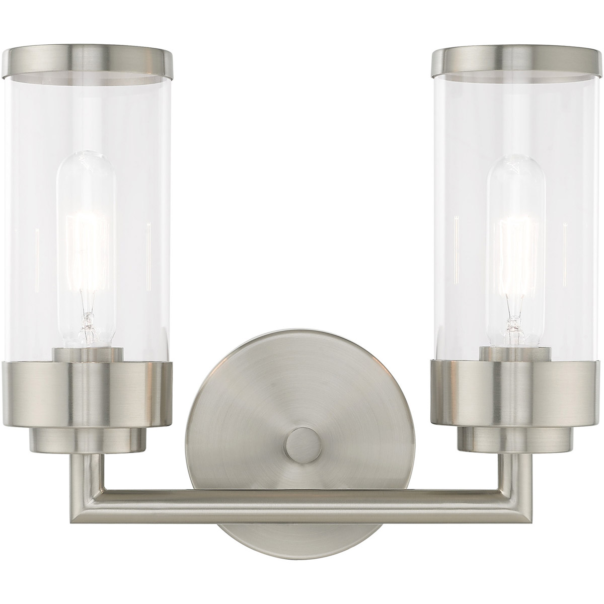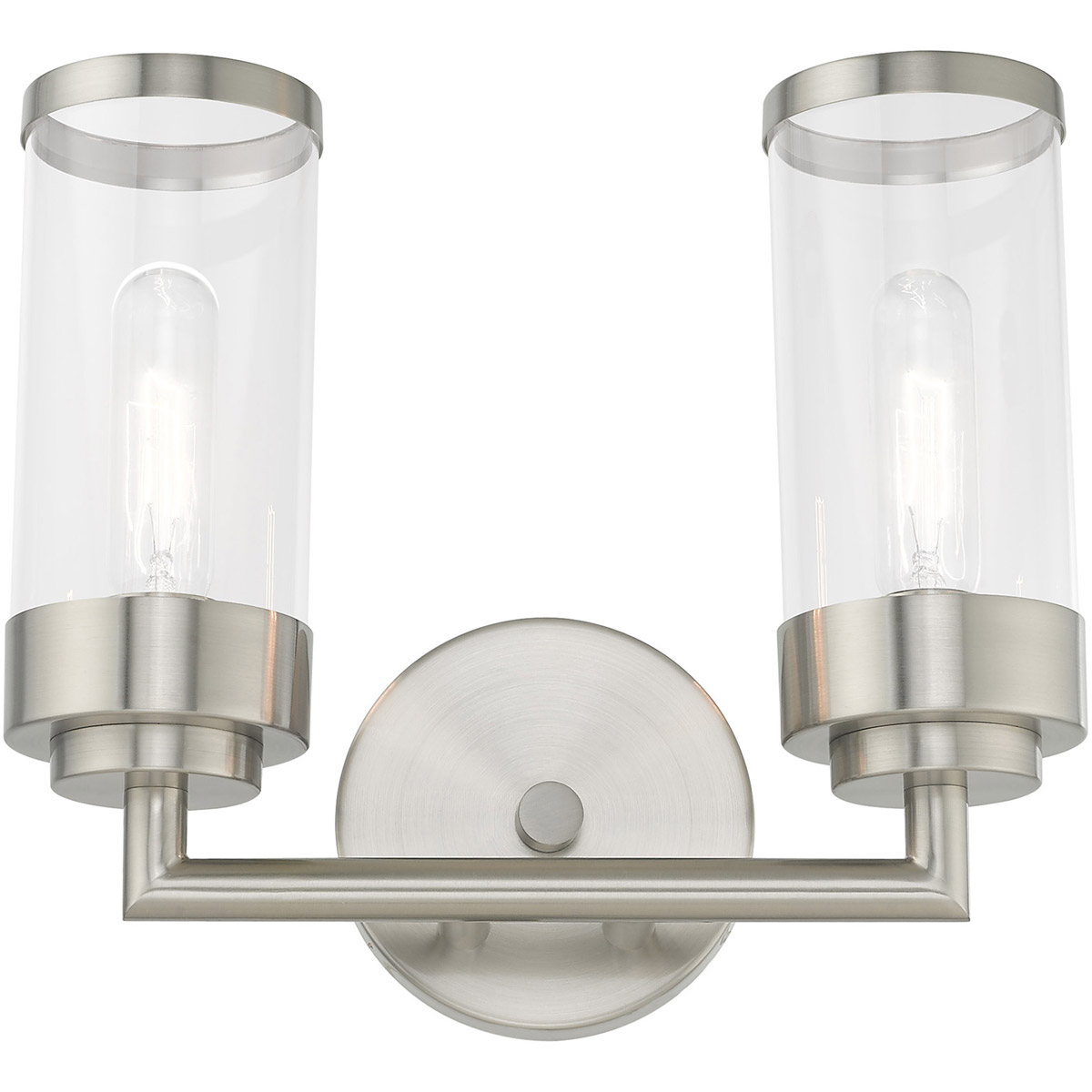 The two light bath vanity from the Hillcrest collection features a simple elegant brushed nickel frame paired with clear glass shades. Each shade is accented with a banded brushed nickel ring to carry through the theme of finely crafted metal fittings.