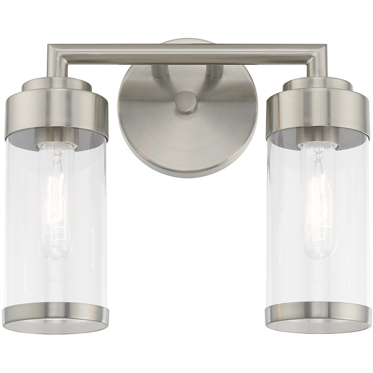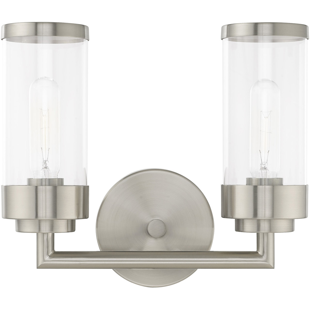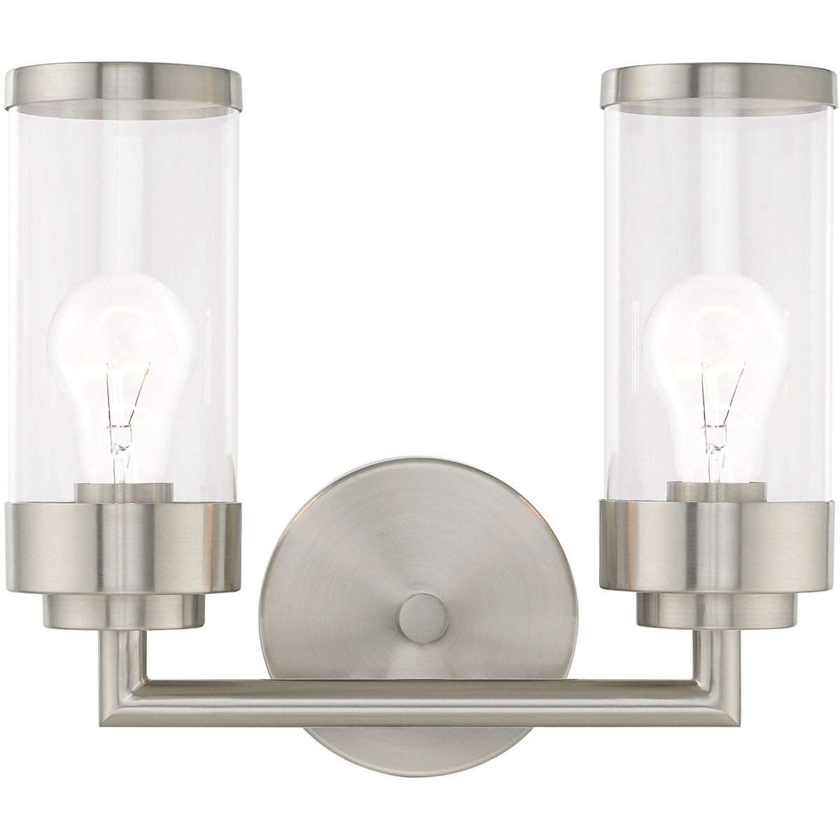 The two light bath vanity from the Hillcrest collection features a simple elegant brushed nickel frame paired with clear glass shades. Each shade is accented with a banded brushed nickel ring to carry through the theme of finely crafted metal fittings.