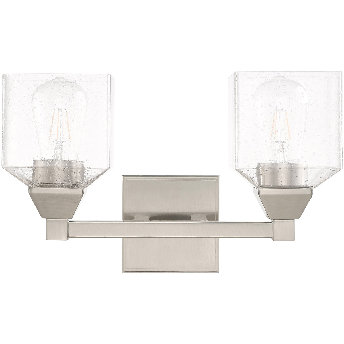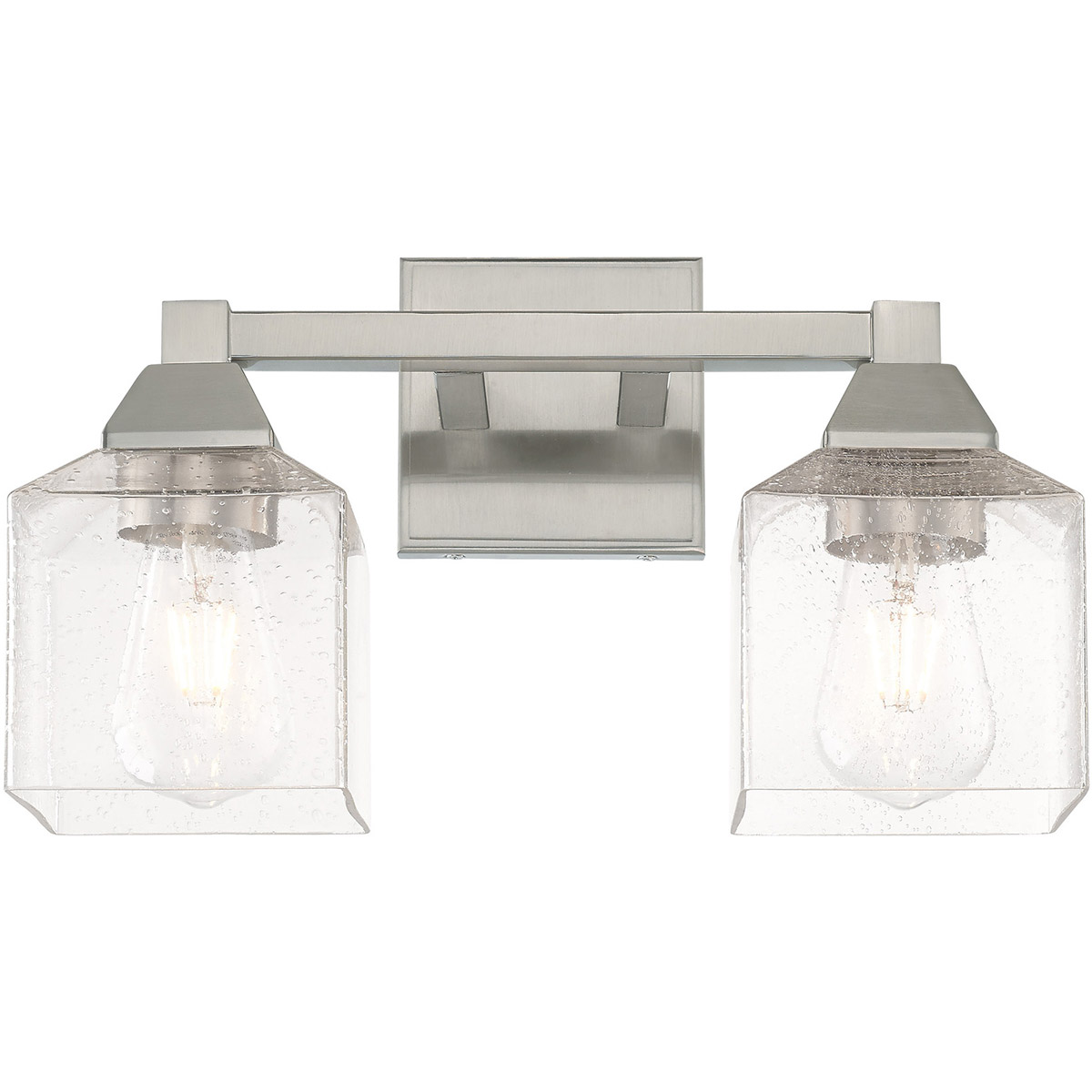 This bath vanity light is sure to provide reliable illumination without sacrificing style. It features two clear seeded glass shades with an open bottom, exposing the bulbs inside. A brushed nickel finish covers the backplate and accents the light.