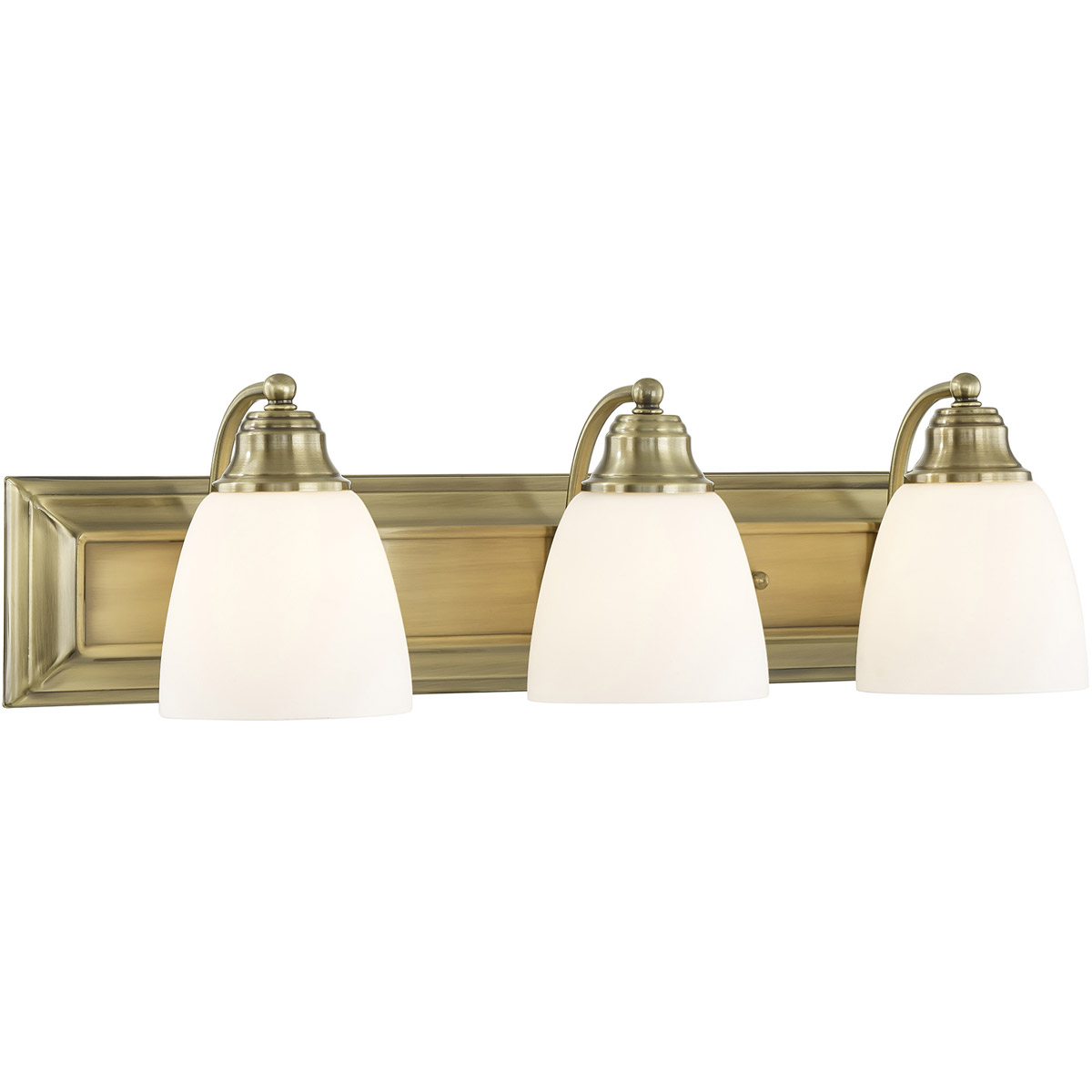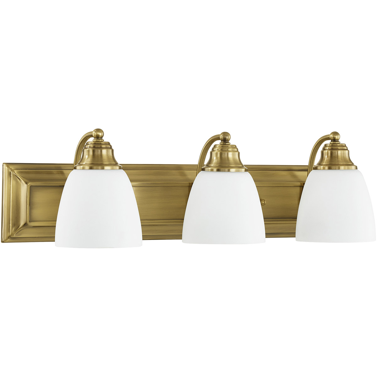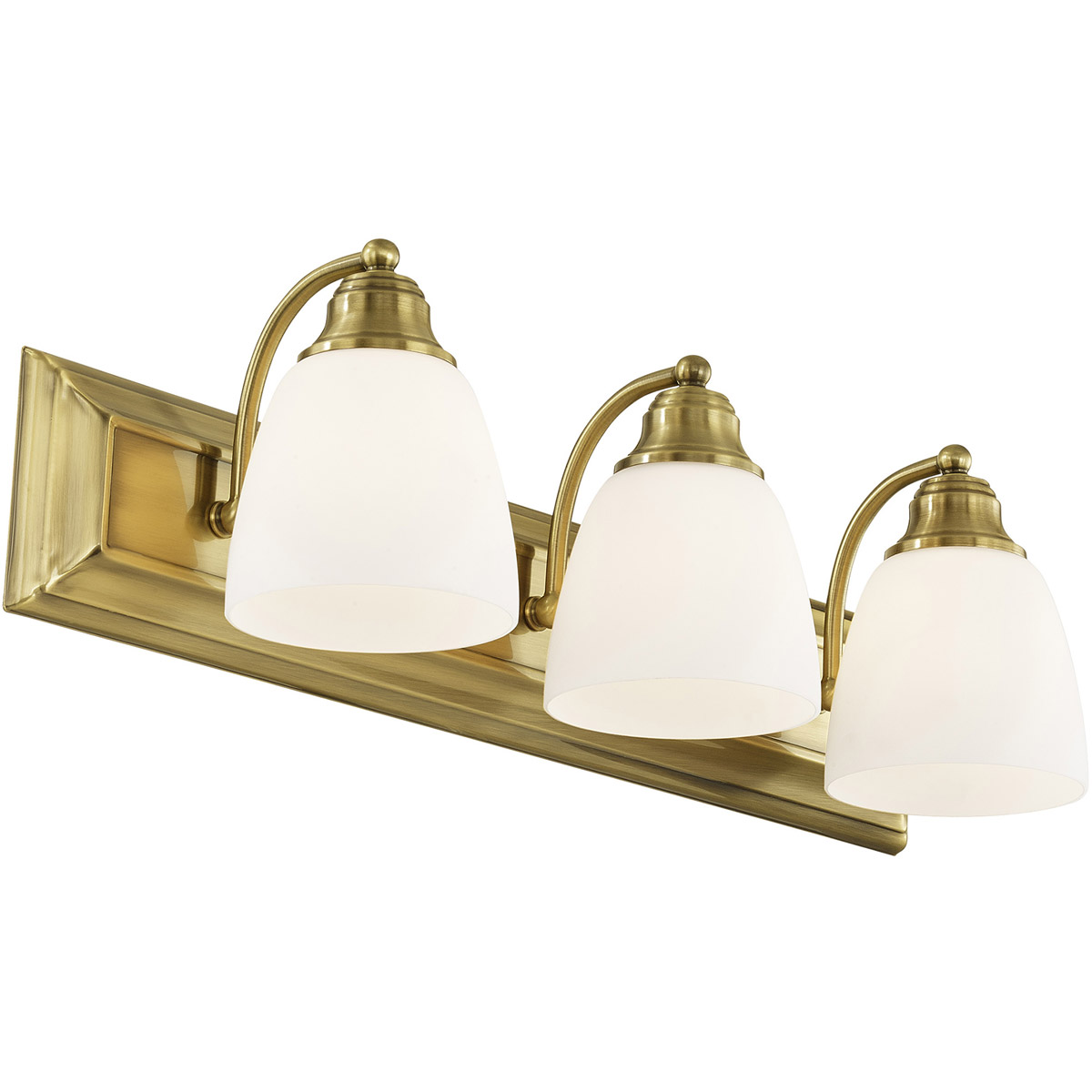 Bring a beautiful new look to your bathroom or vanity area with this charming three light bath fixture. A wide rectangular backplate in antique brass finish supports three simple arms that hold three glass shades in hand blown satin opal white glass.