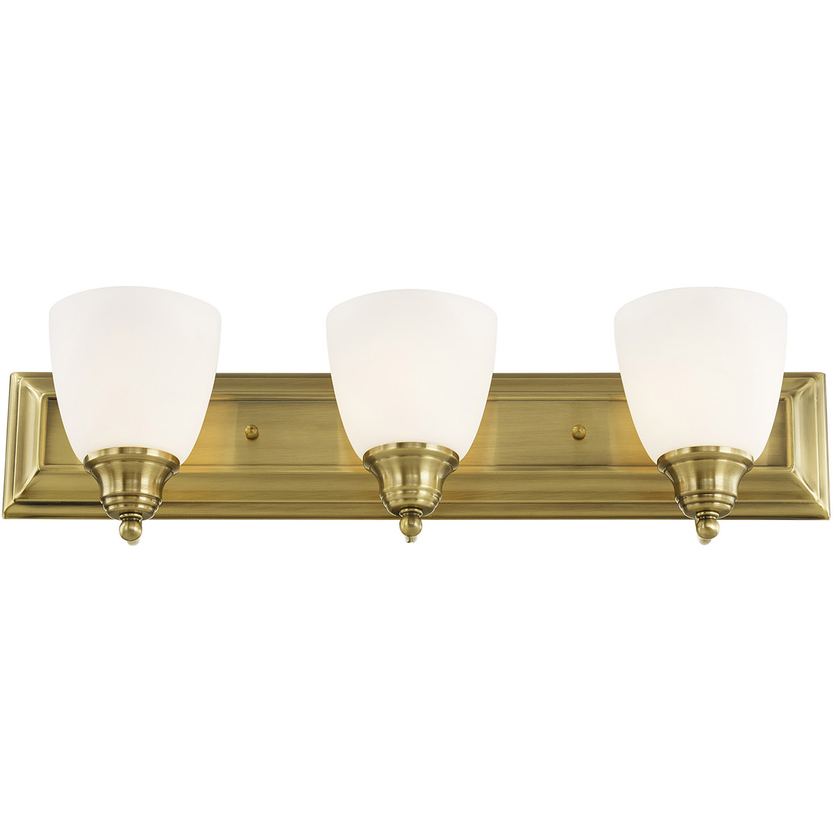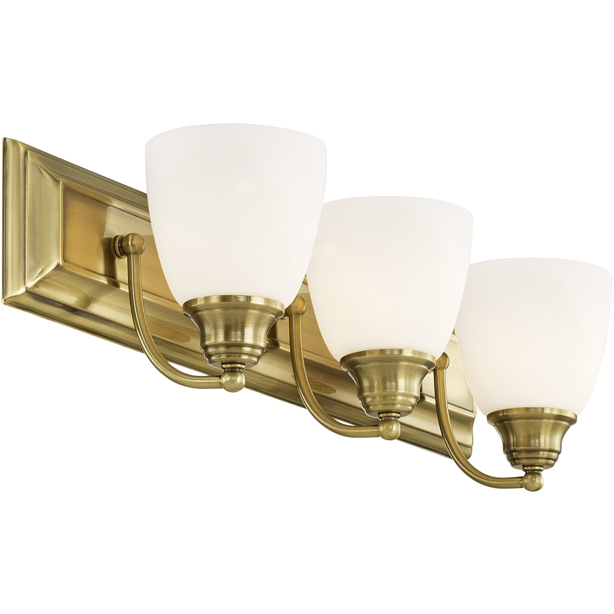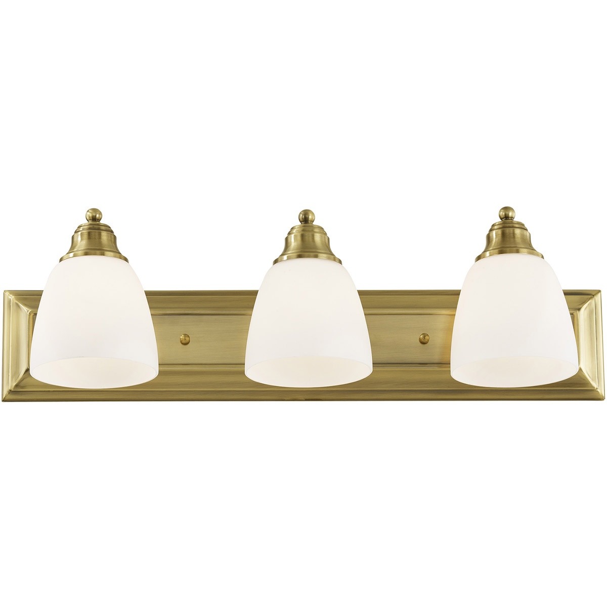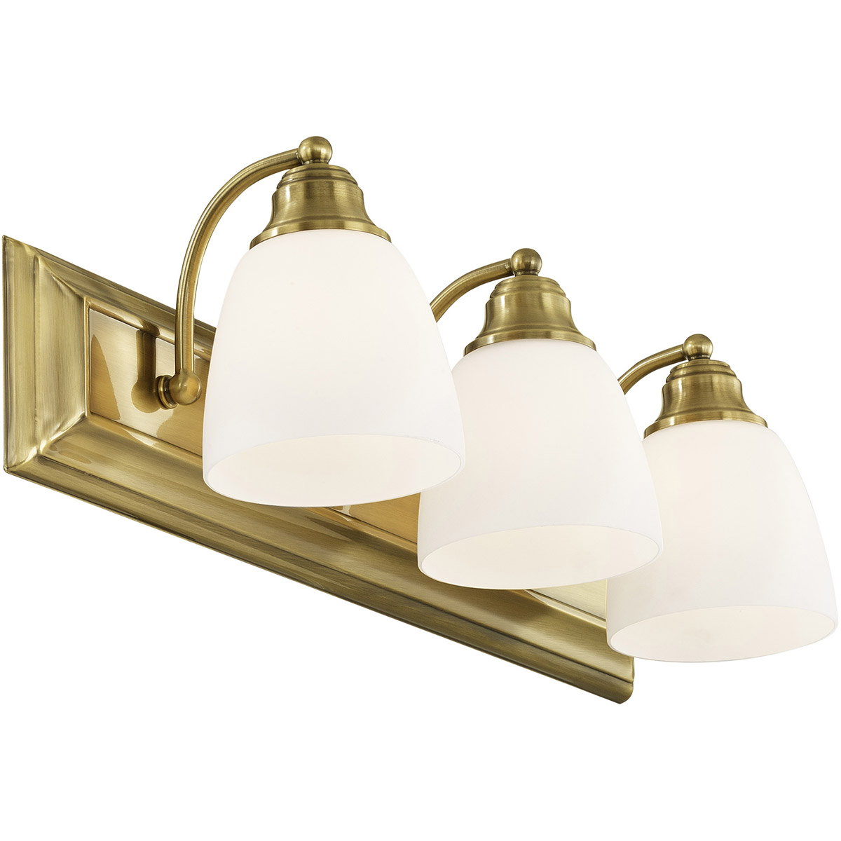 Bring a beautiful new look to your bathroom or vanity area with this charming three light bath fixture. A wide rectangular backplate in antique brass finish supports three simple arms that hold three glass shades in hand blown satin opal white glass.