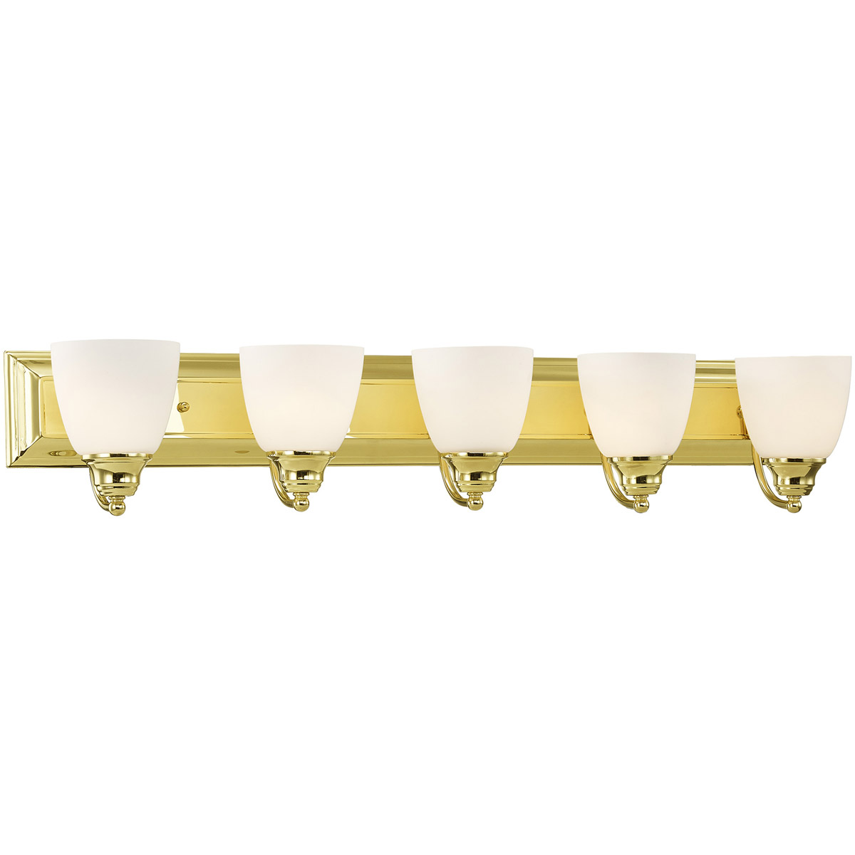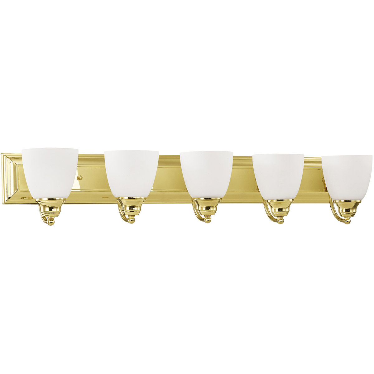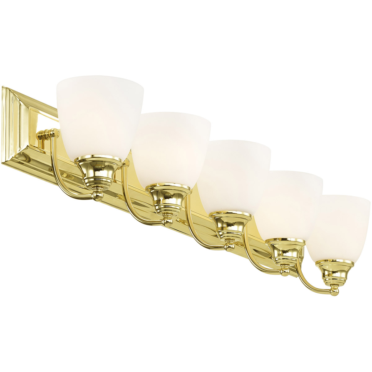 Bring a beautiful new look to your bathroom or vanity area with this charming five light bath fixture. A wide rectangular backplate in polished brass finish supports five simple arms that hold five glass shades in hand blown satin opal white glass.