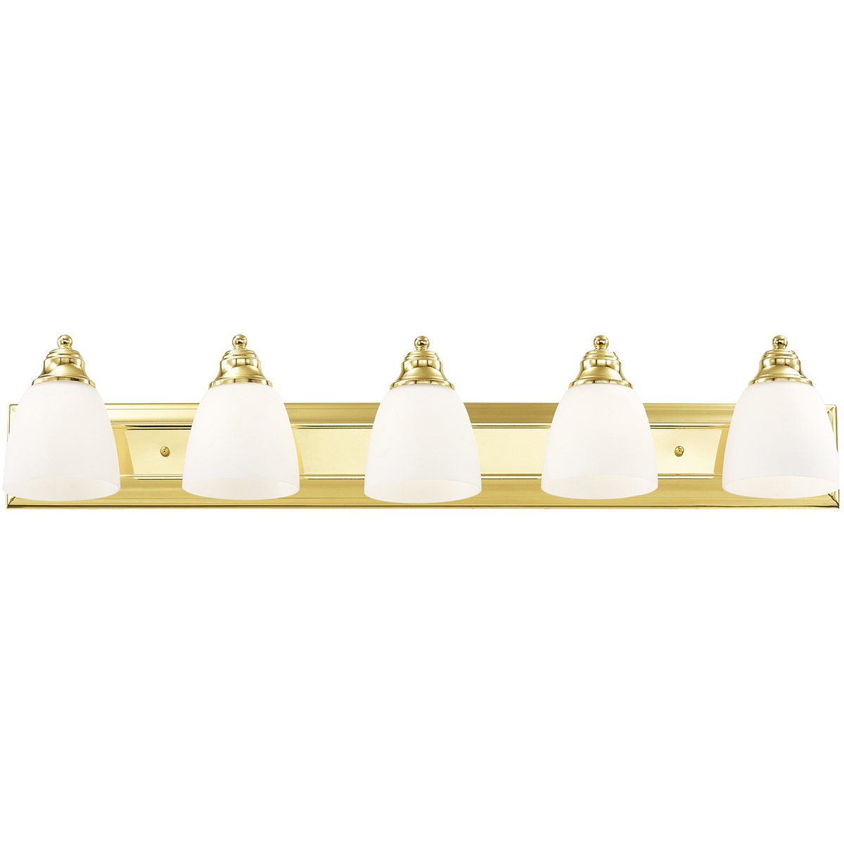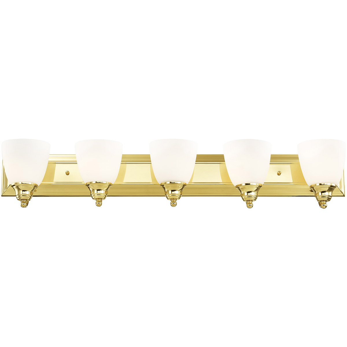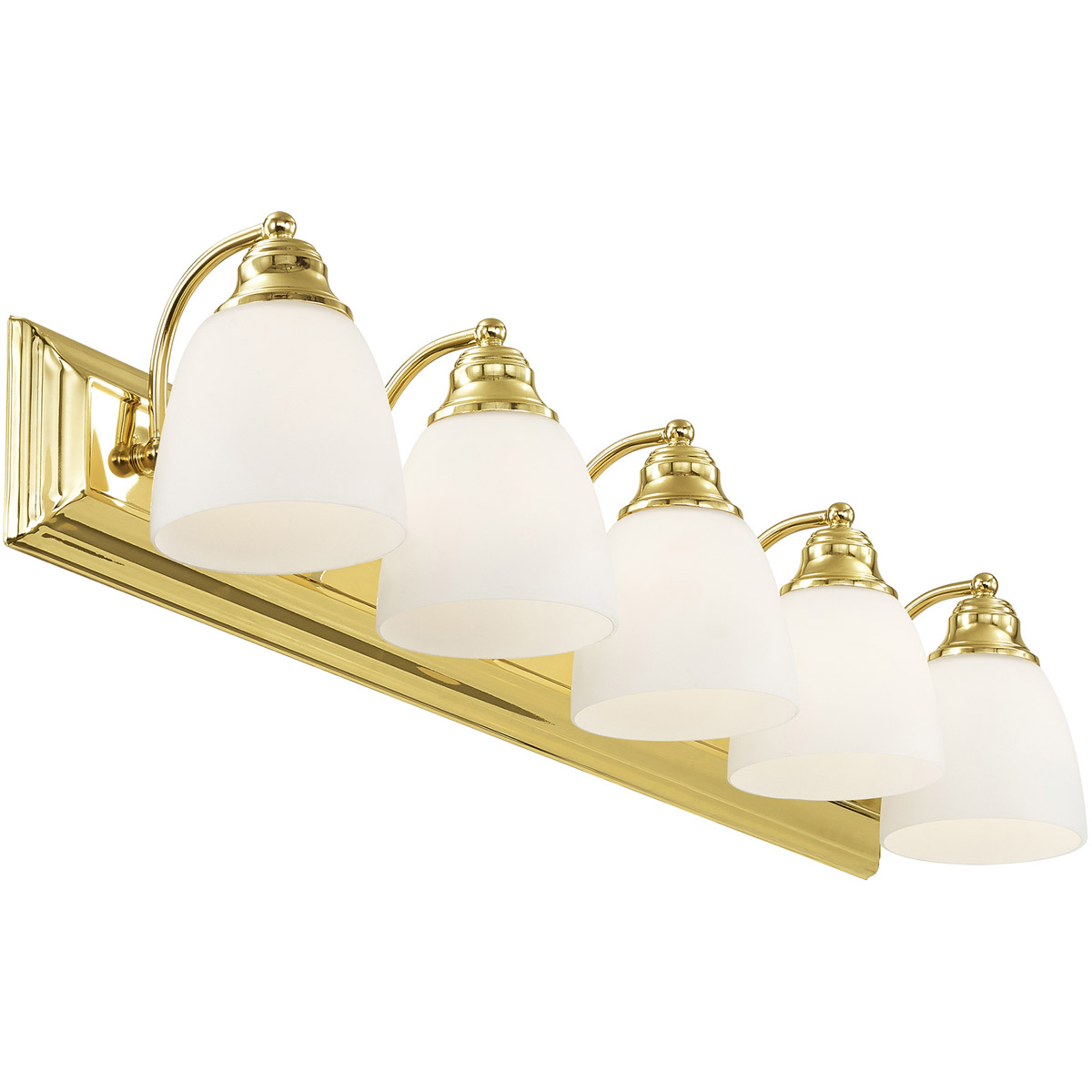 Bring a beautiful new look to your bathroom or vanity area with this charming five light bath fixture. A wide rectangular backplate in polished brass finish supports five simple arms that hold five glass shades in hand blown satin opal white glass.
