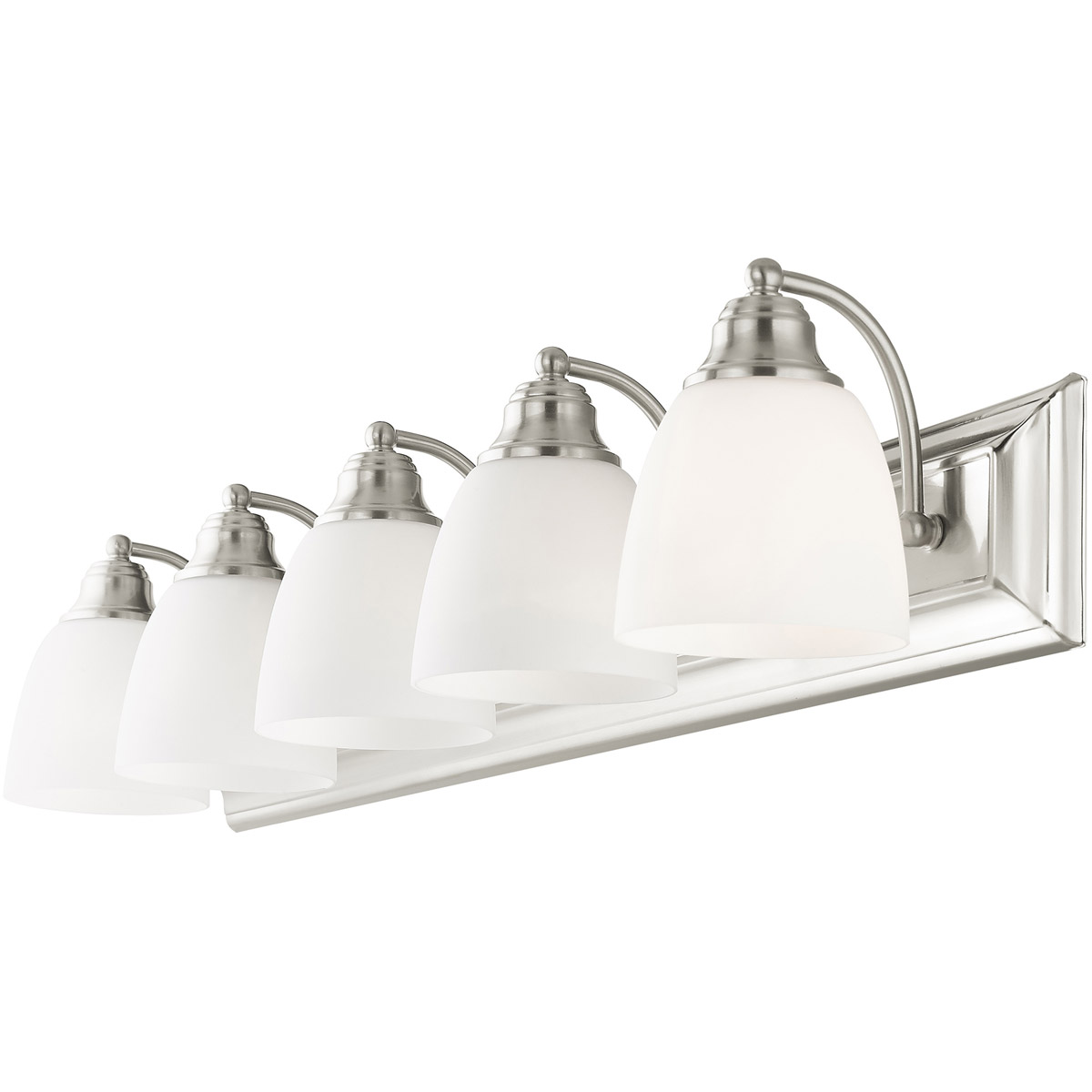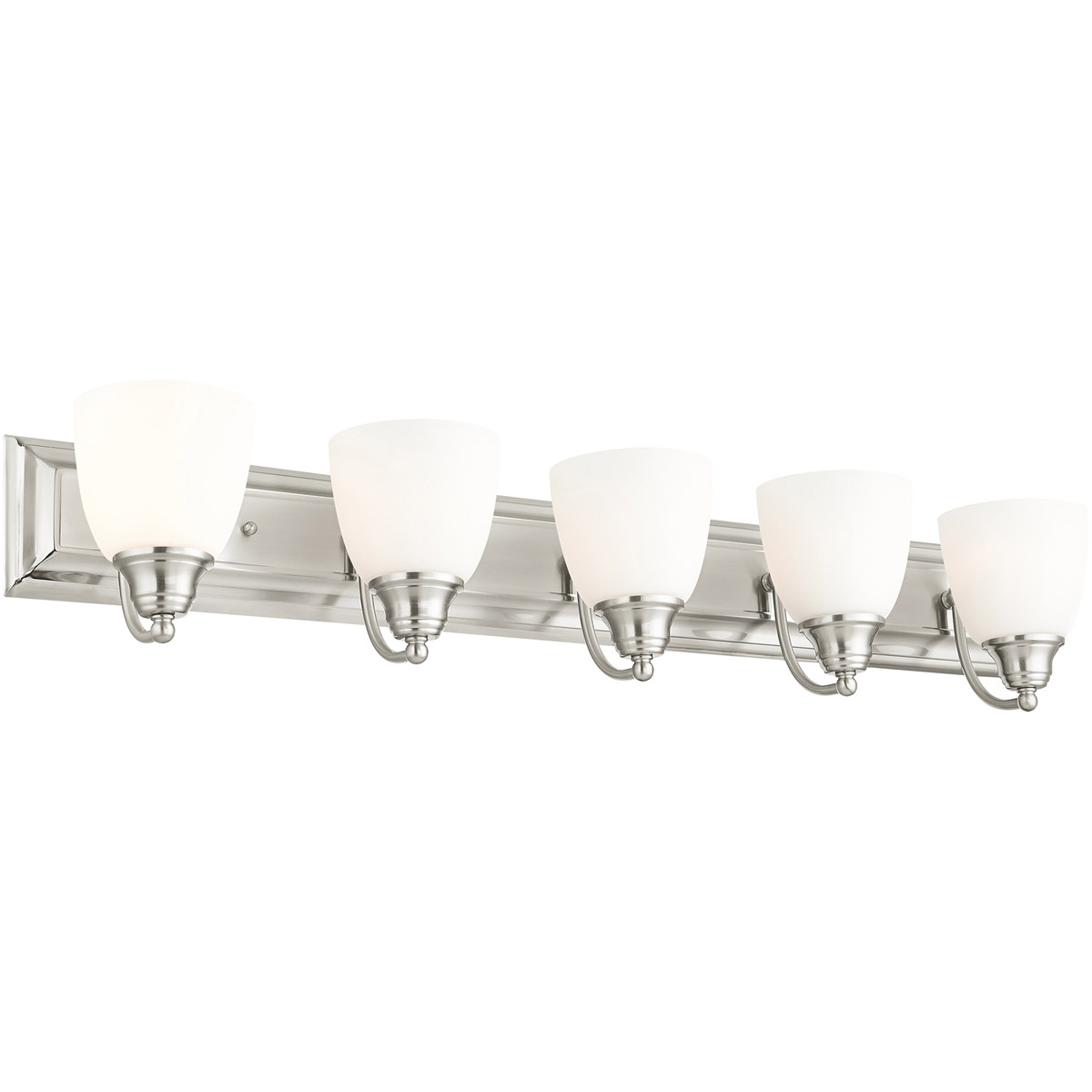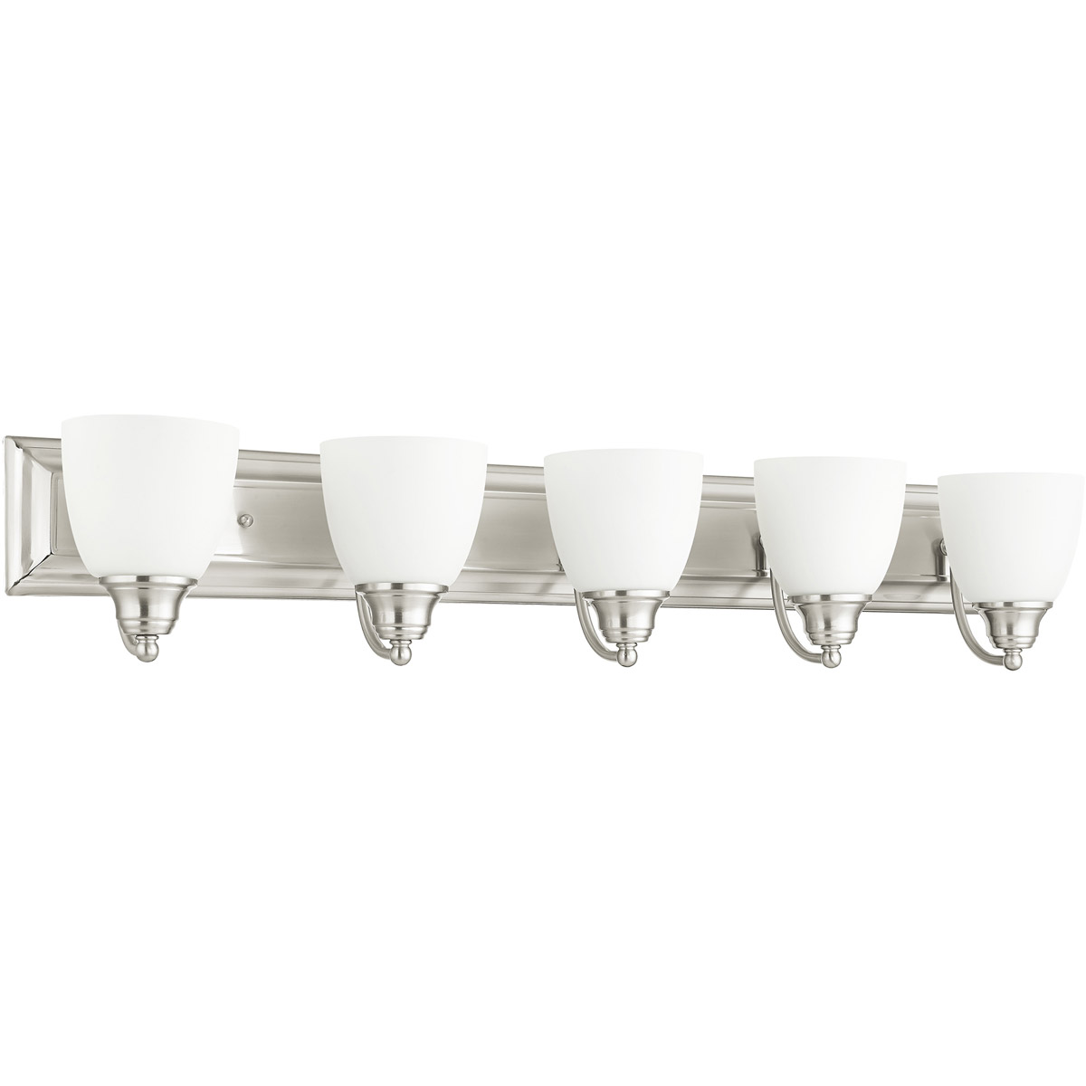 Bring a beautiful new look to your bathroom or vanity area with this charming five light bath fixture. A wide rectangular backplate in brushed nickel finish supports three simple arms that hold three glass shades in hand blown satin opal white glass.