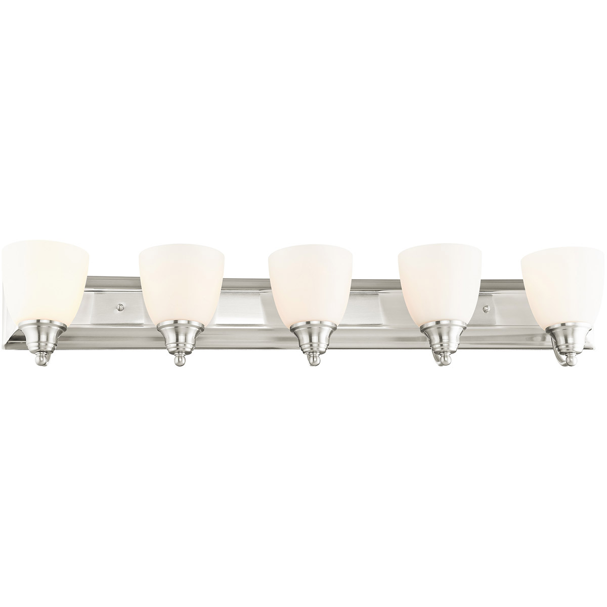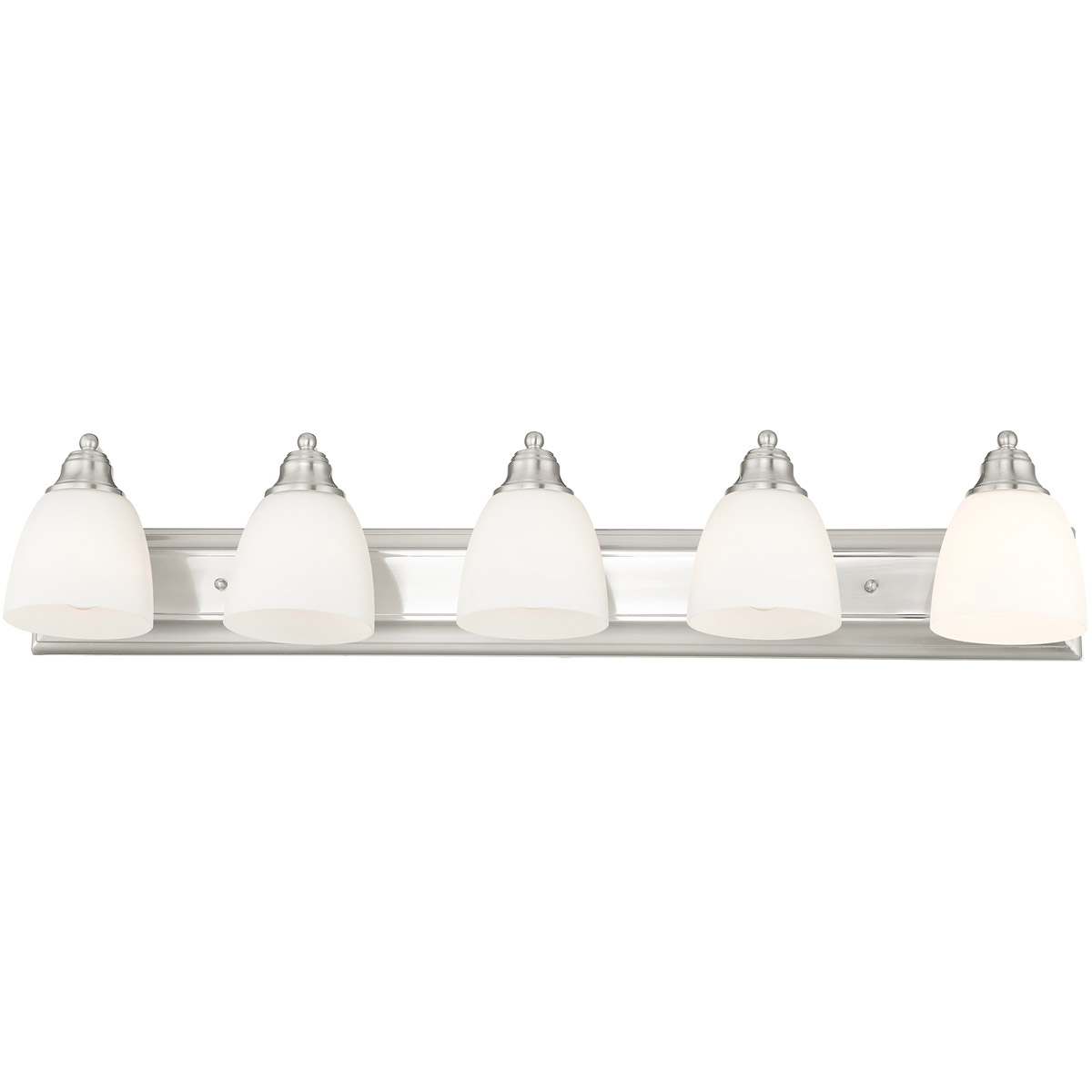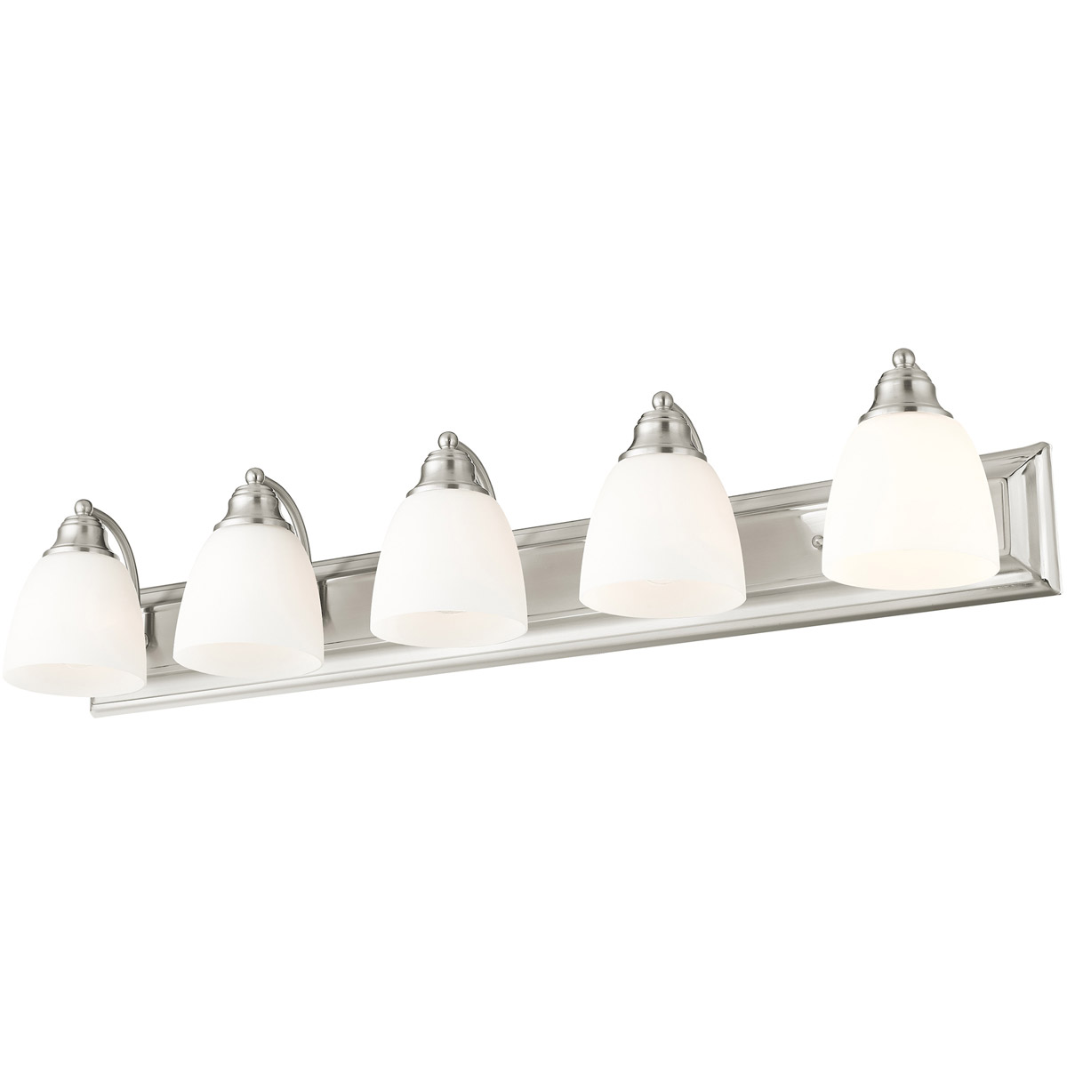 Bring a beautiful new look to your bathroom or vanity area with this charming five light bath fixture. A wide rectangular backplate in brushed nickel finish supports three simple arms that hold three glass shades in hand blown satin opal white glass.
