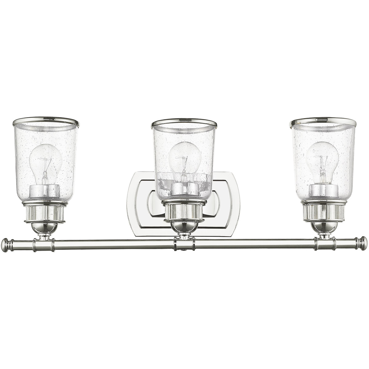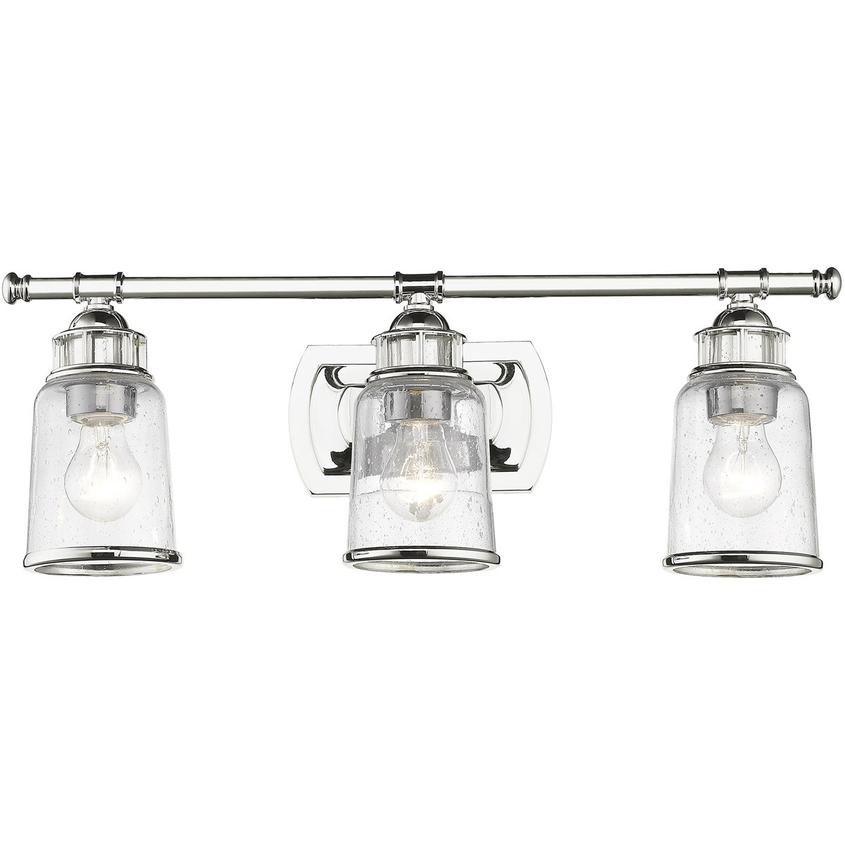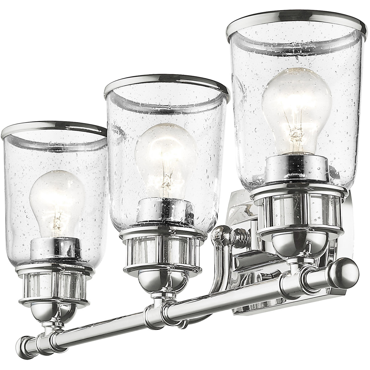 Our Lawrenceville collection features a retro industrial design, reminiscent of 19th century lighting. This three light bath vanity comes in a polished chrome finish and clear seeded glass.