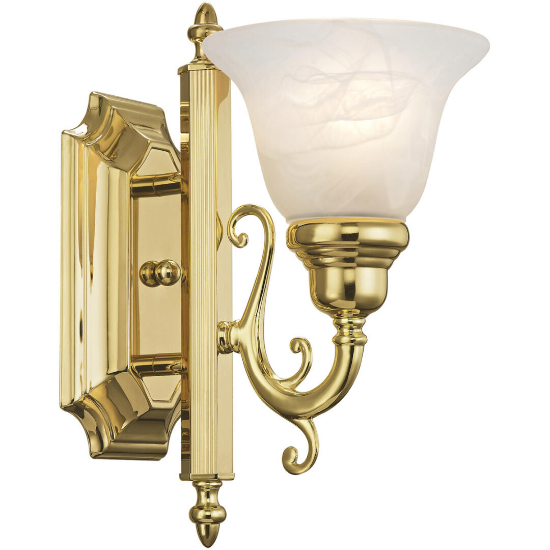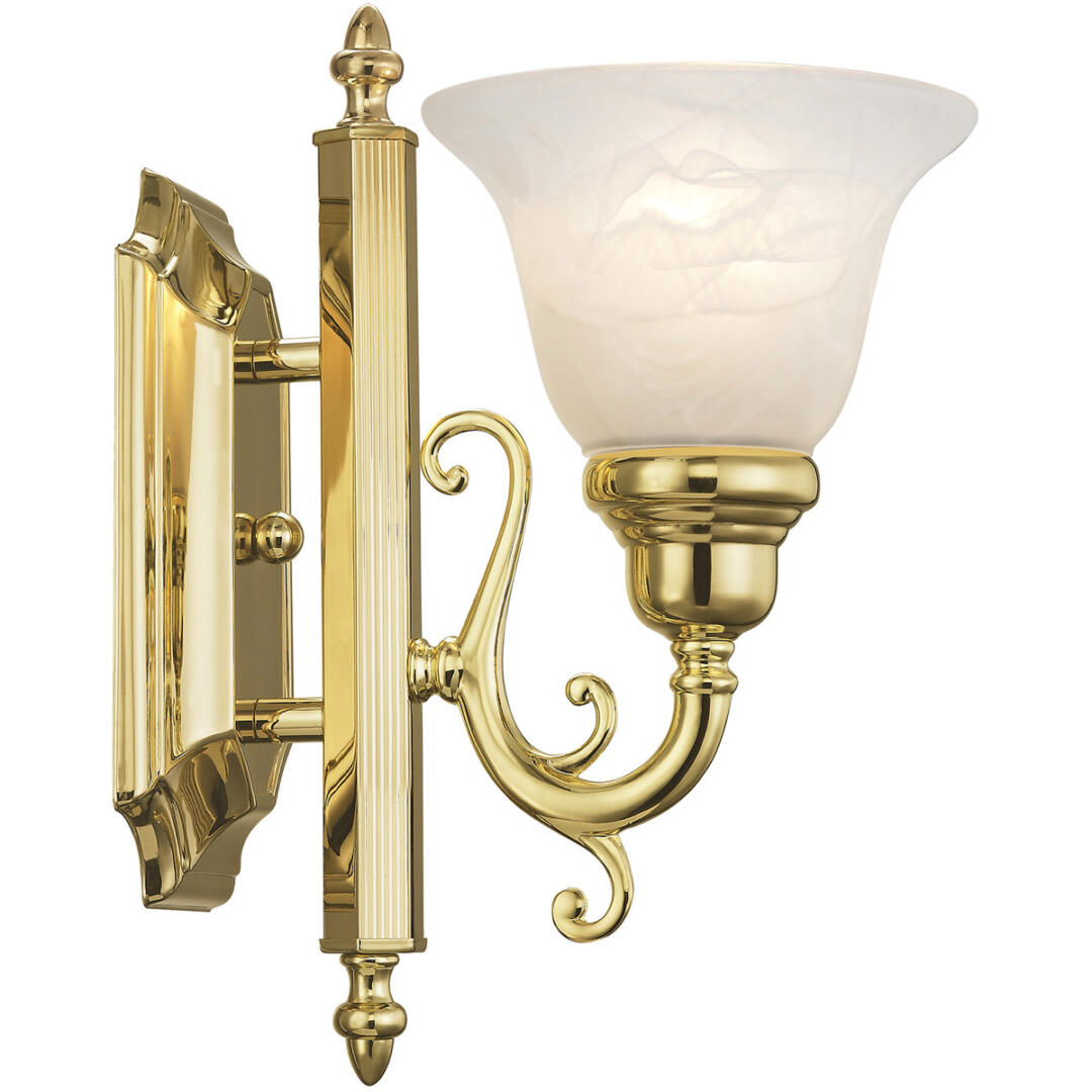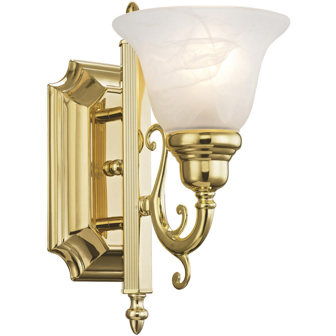 The French Regency collection is an artistic blend of traditional styling and beautiful materials. The glass shades are a white alabaster, and the backplate incorporates multiple bevels. This bathroom wall light features a magnificent polished brass finish. This fixture may be installed facing up or down.