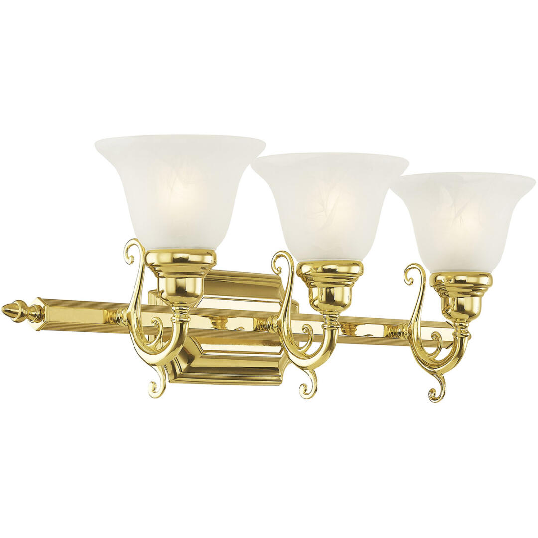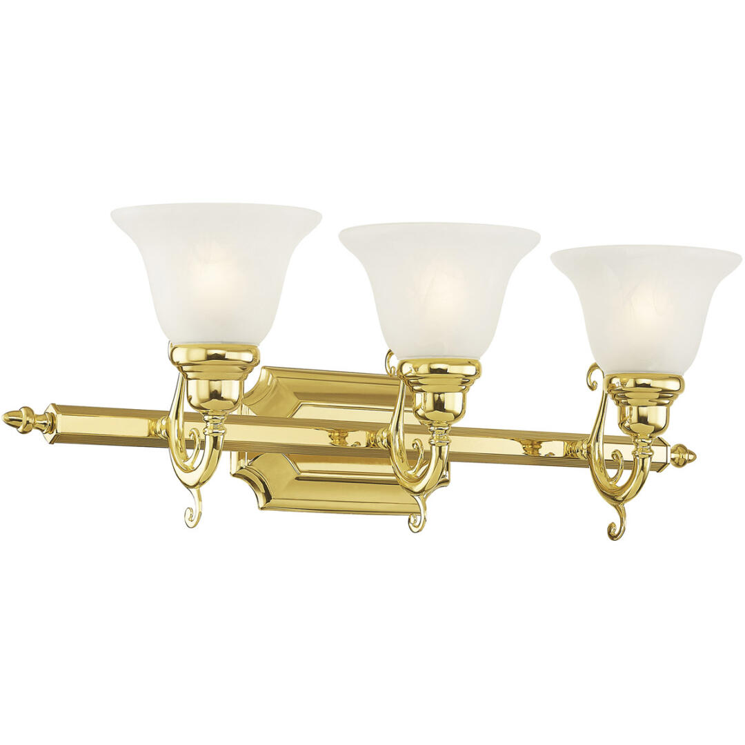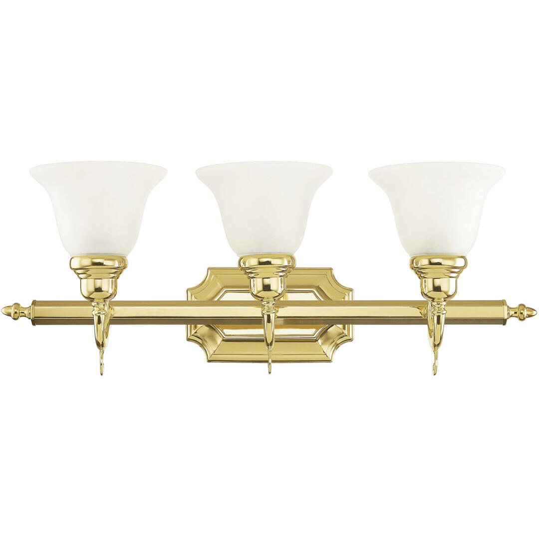 The French Regency collection is an artistic blend of traditional styling and beautiful materials. The glass shades are a white alabaster, and the backplate incorporates multiple bevels. This bathroom wall light features a magnificent polished brass finish. This fixture may be installed facing up or down.