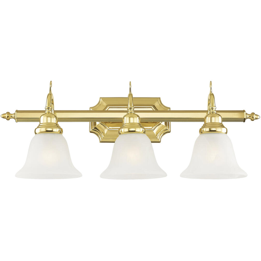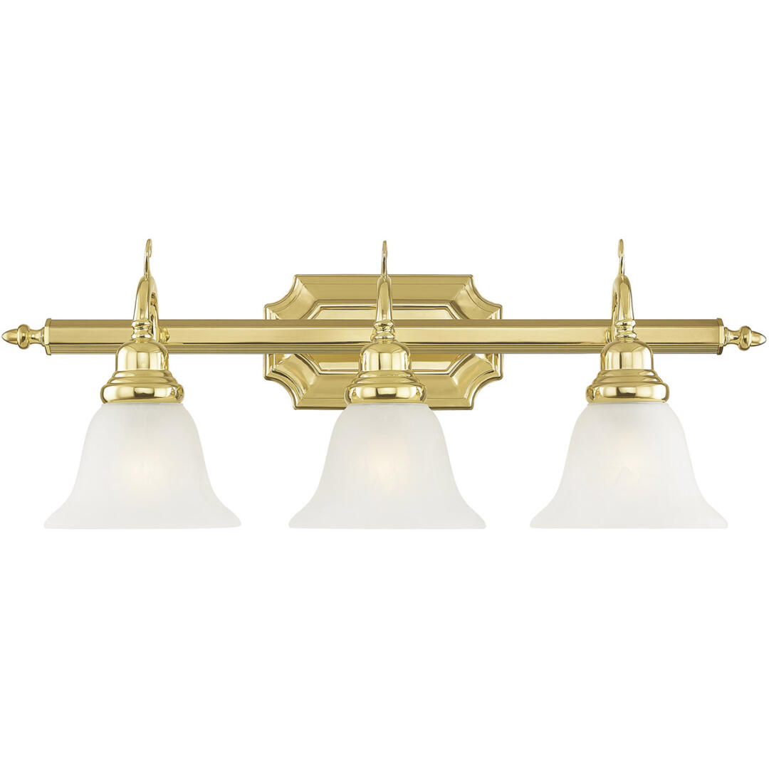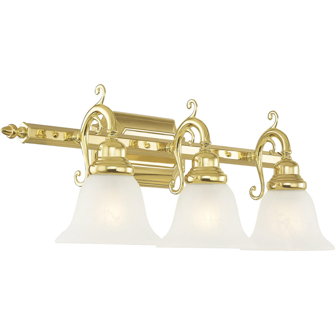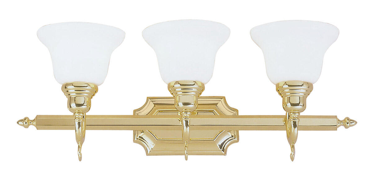 The French Regency collection is an artistic blend of traditional styling and beautiful materials. The glass shades are a white alabaster, and the backplate incorporates multiple bevels. This bathroom wall light features a magnificent polished brass finish. This fixture may be installed facing up or down.