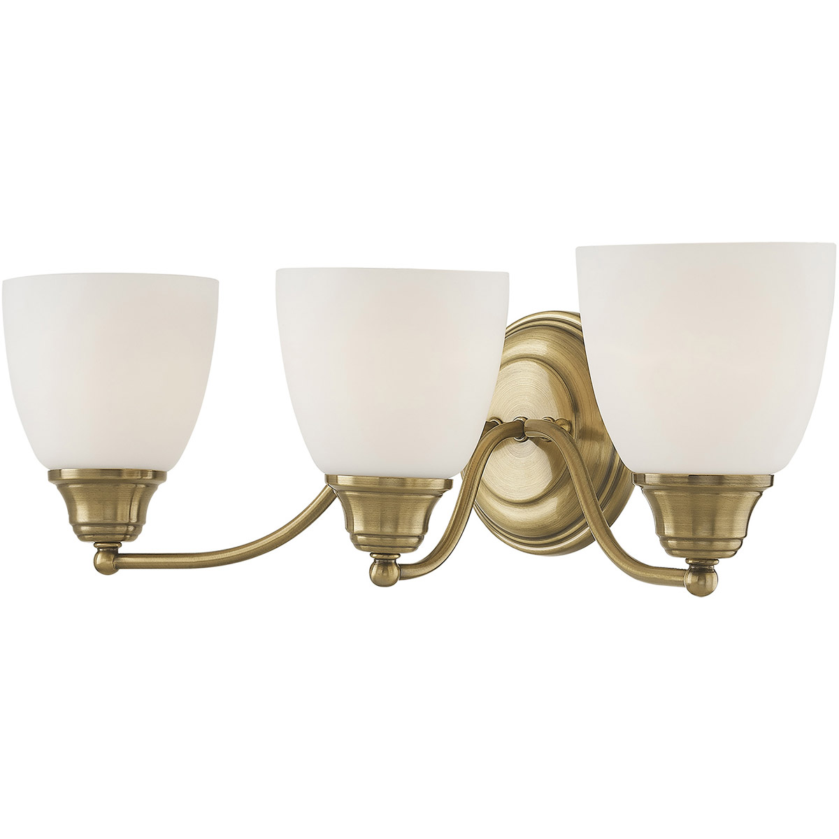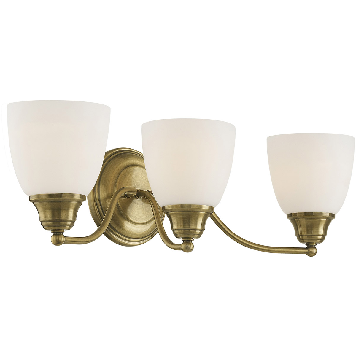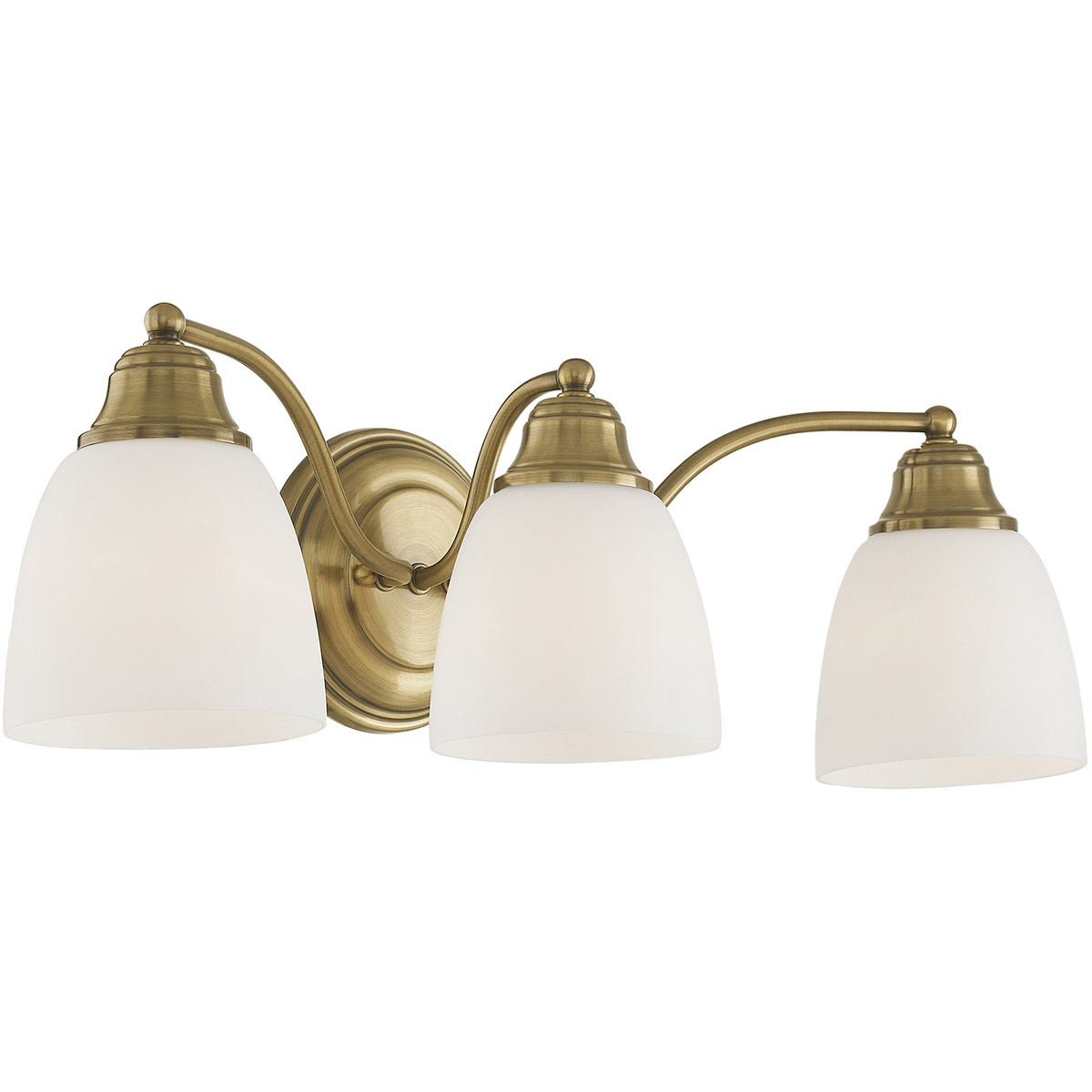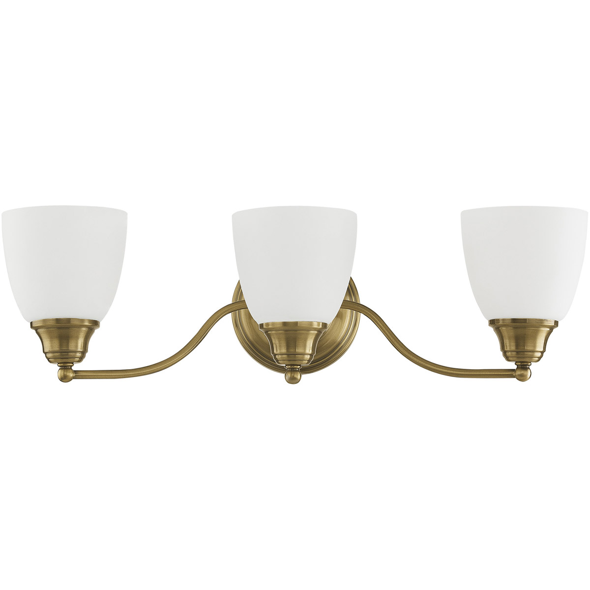 The hand blown satin opal white shades extend from gently curved arms reaching from the round backplate and are finished with small, orb finials at both ends to reinforce the curvaceous motif.