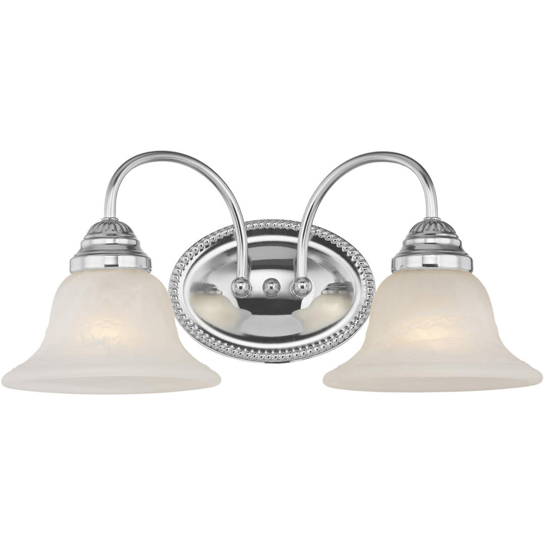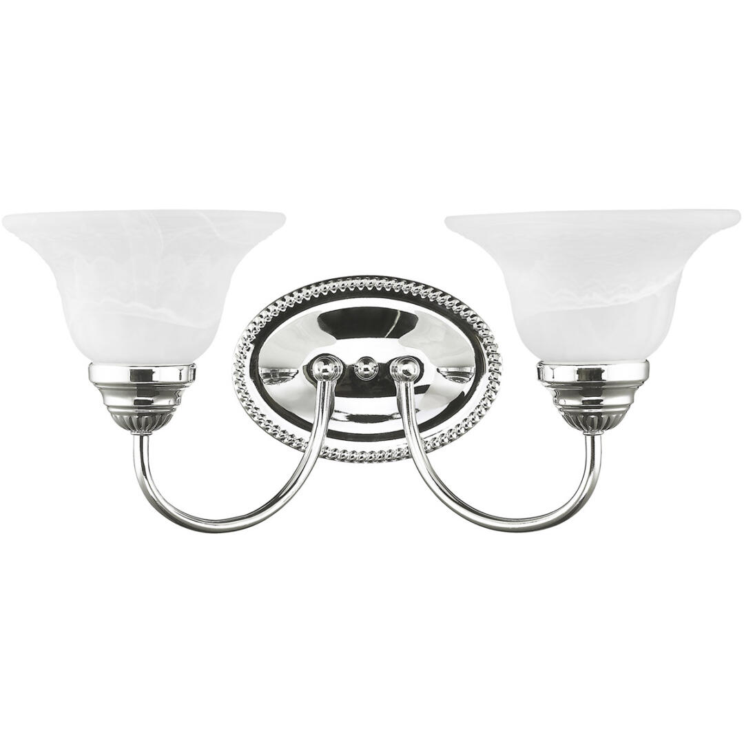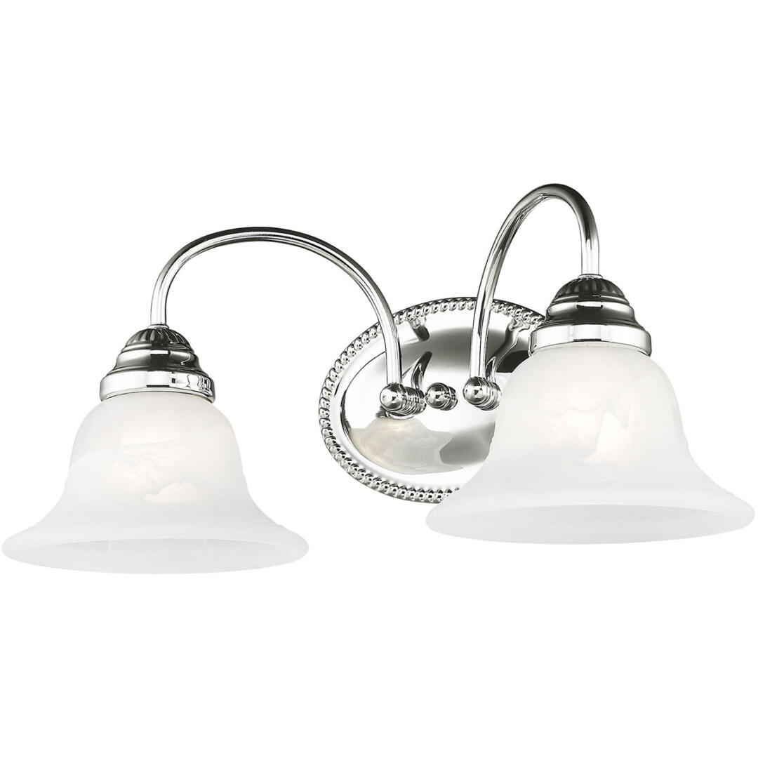 This two light bath vanity from the Edgemont collection is a fine and handsome fixture that features white alabaster glass. Edgemont is comprised of traditional iron forms in a polished chrome finish.