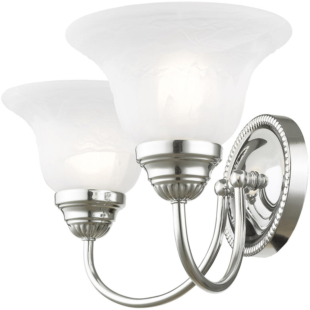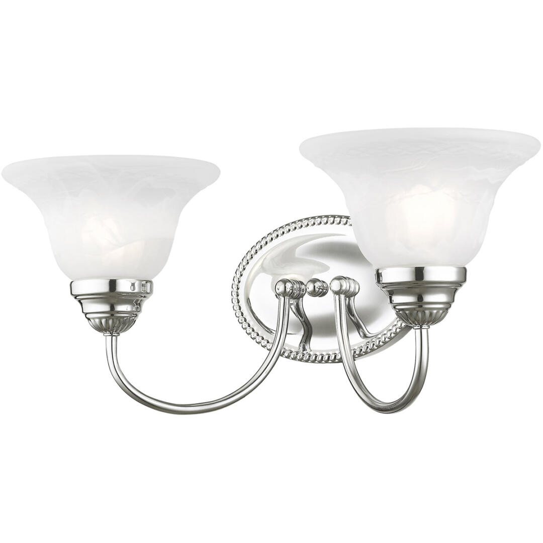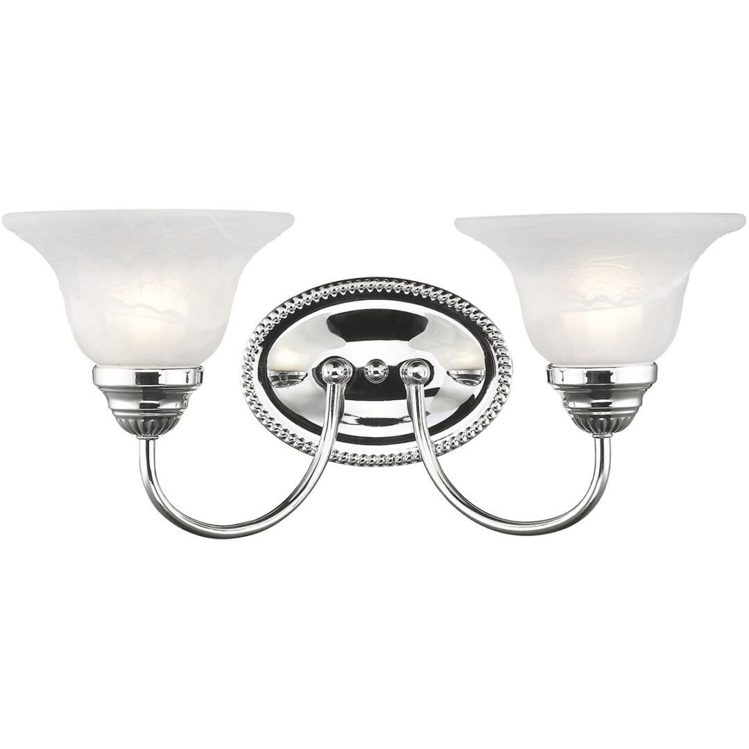 This two light bath vanity from the Edgemont collection is a fine and handsome fixture that features white alabaster glass. Edgemont is comprised of traditional iron forms in a polished chrome finish.