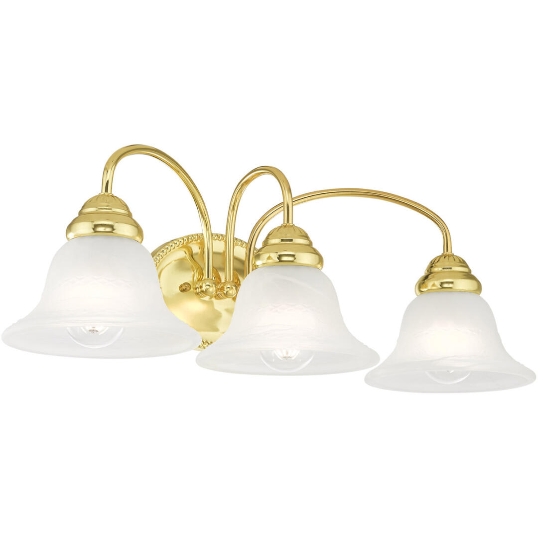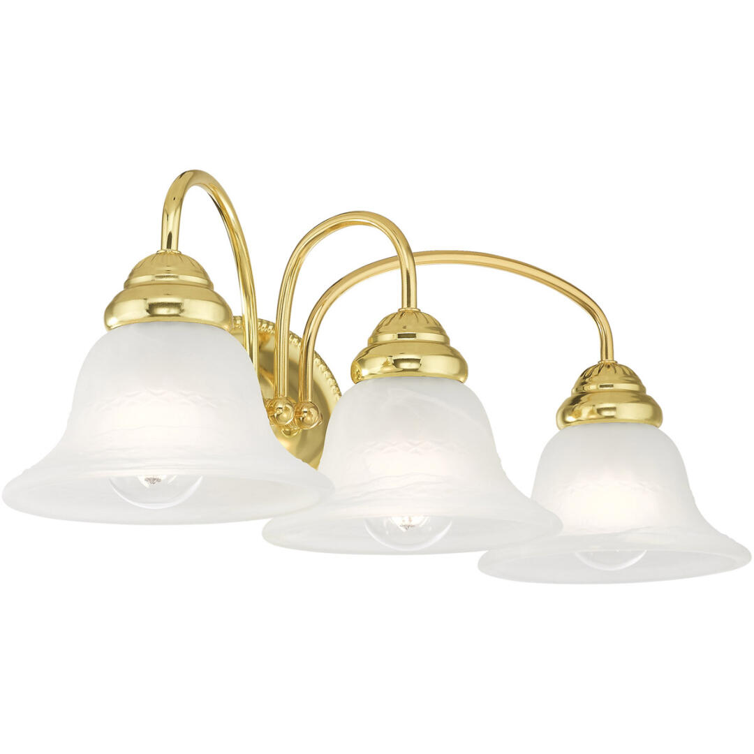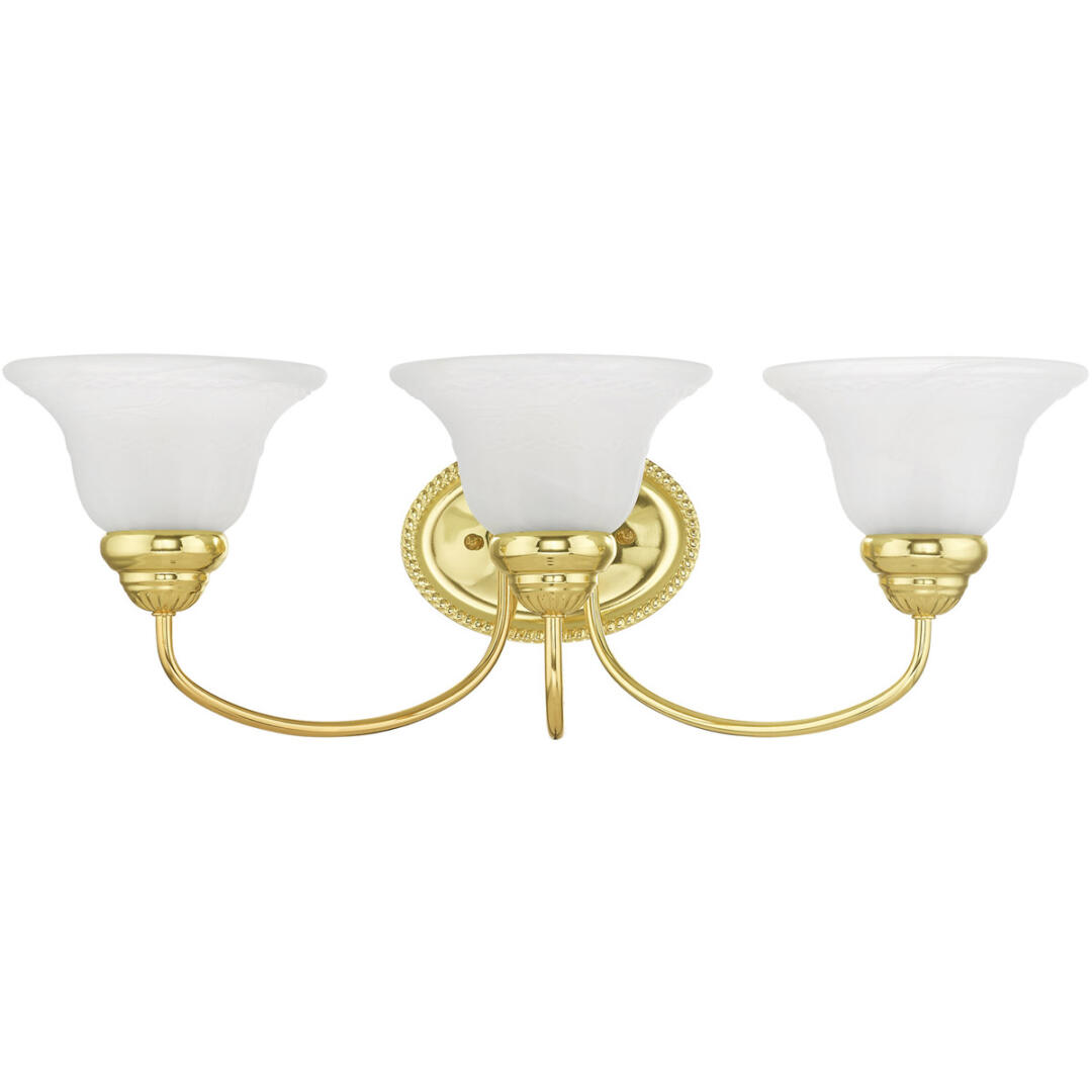 This three light bath vanity from the Edgemont collection is a fine and handsome fixture that features white alabaster glass. Edgemont is comprised of traditional iron forms in an polished brass finish.