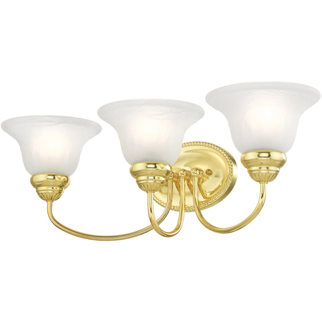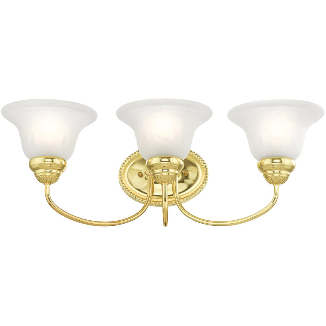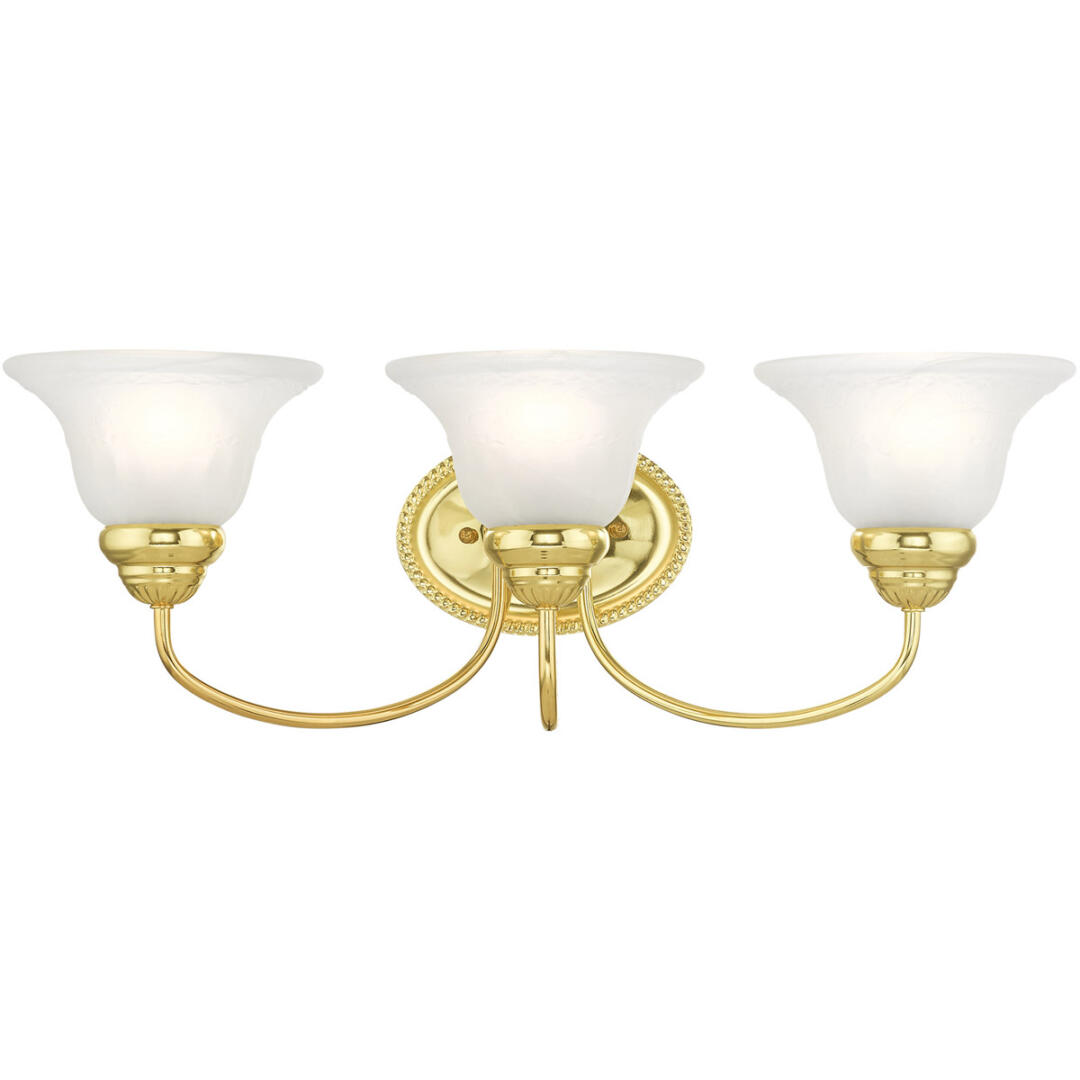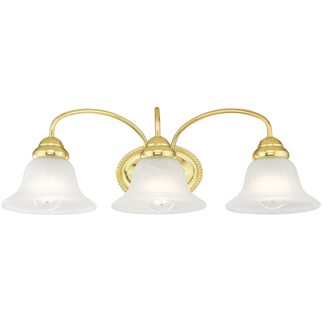 This three light bath vanity from the Edgemont collection is a fine and handsome fixture that features white alabaster glass. Edgemont is comprised of traditional iron forms in an polished brass finish.