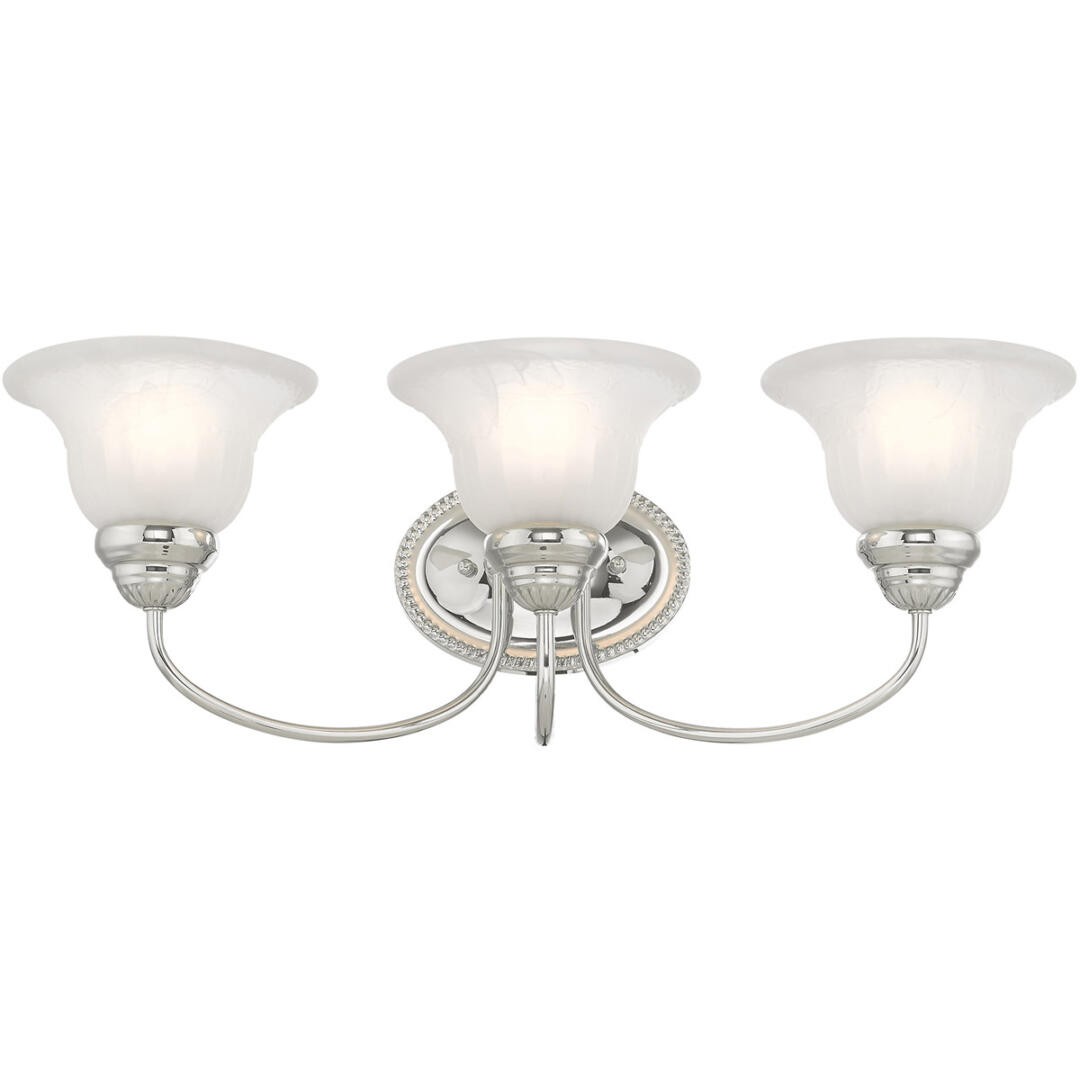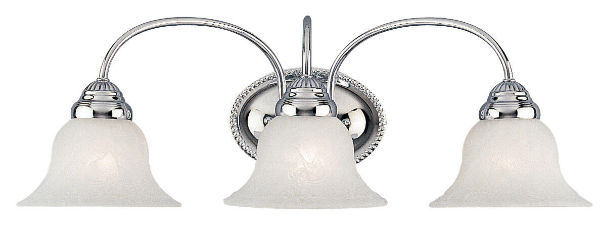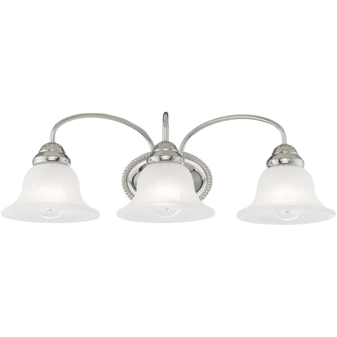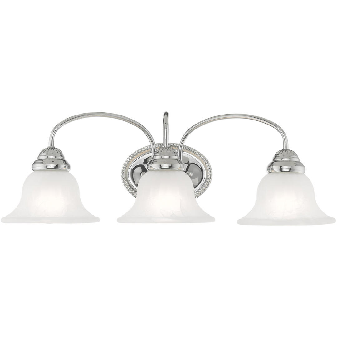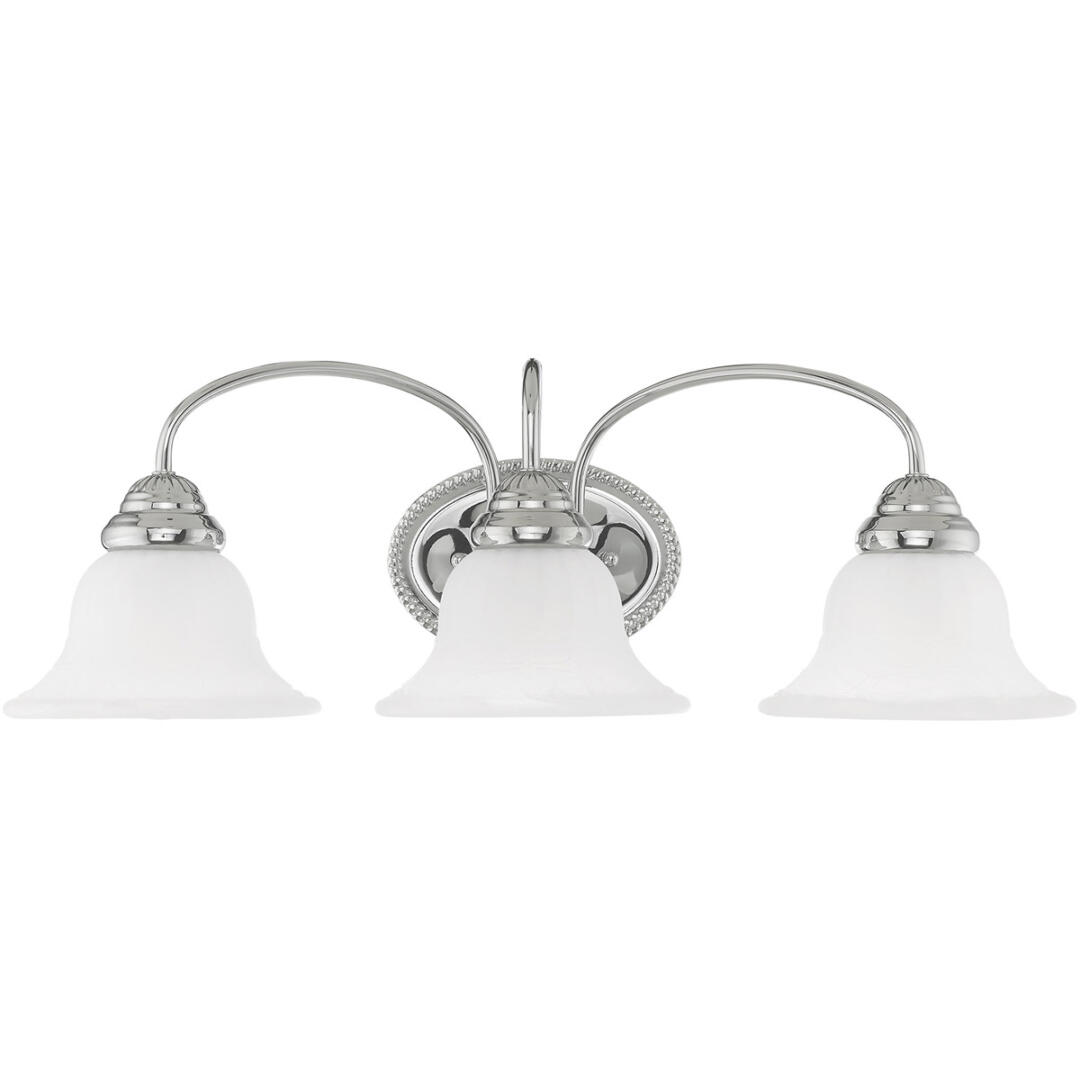 This three light bath vanity from the Edgemont collection is a fine and handsome fixture that features white alabaster glass. Edgemont is comprised of traditional iron forms in an polished chrome finish.