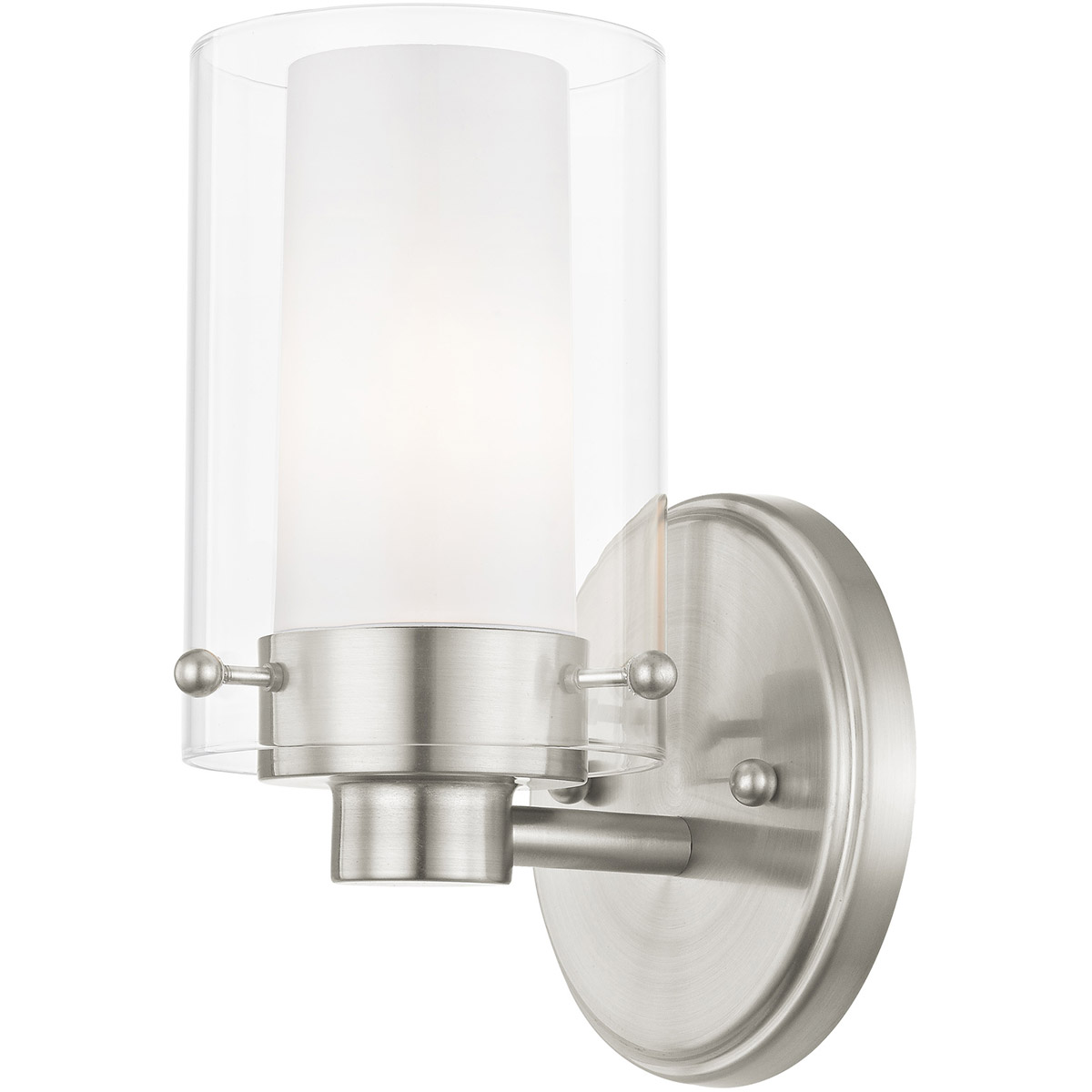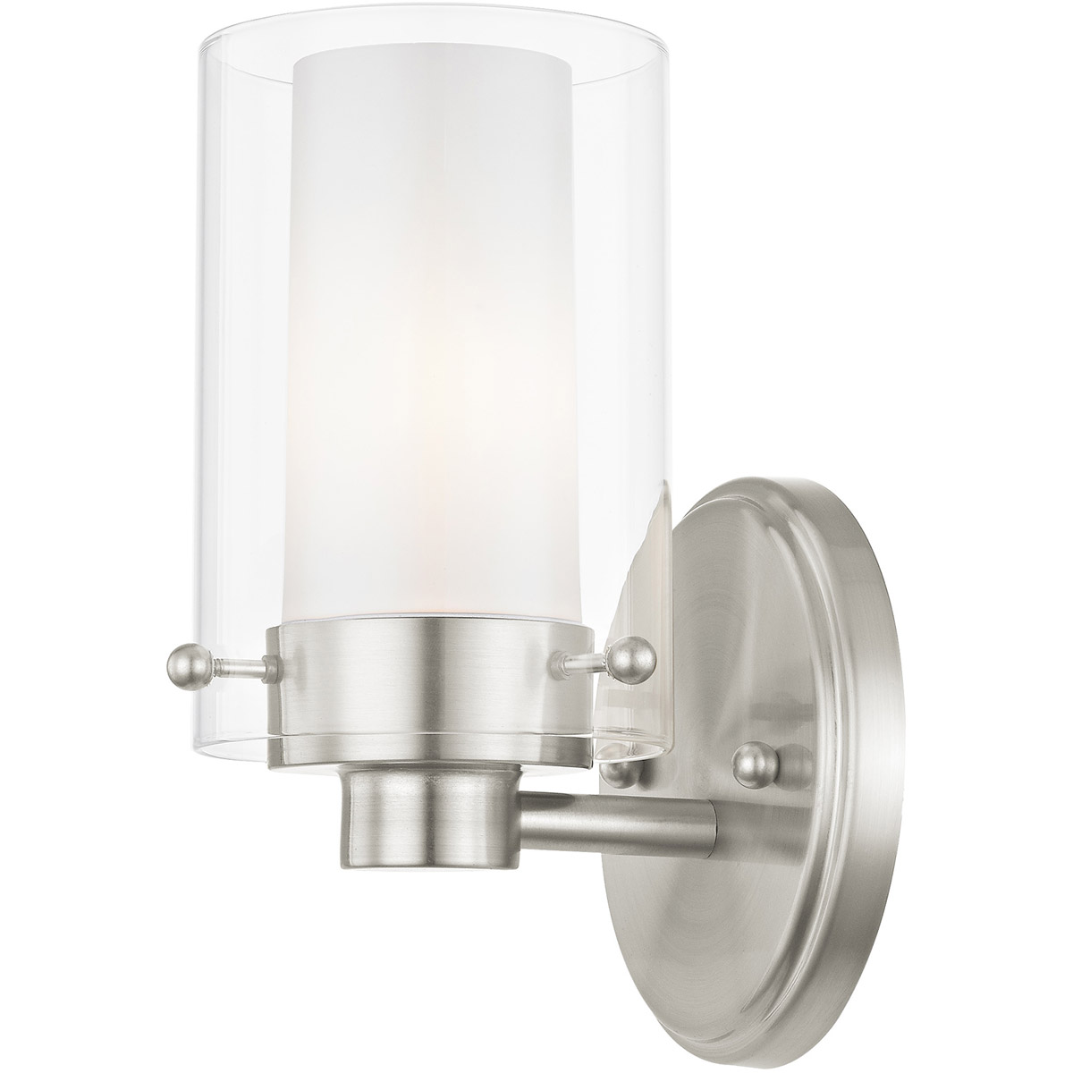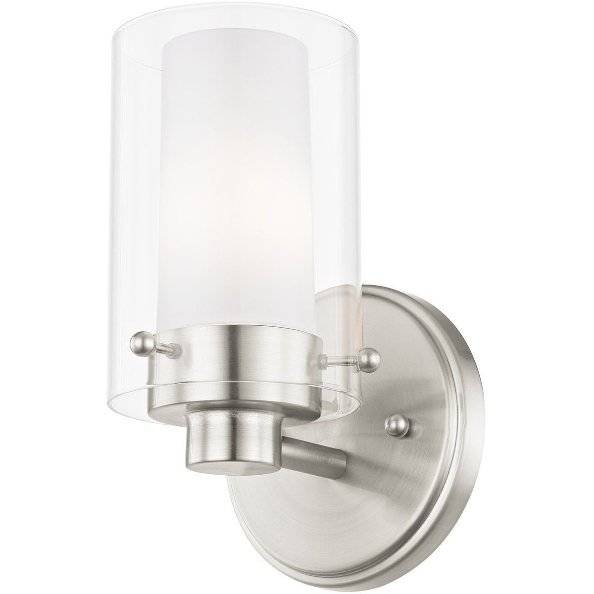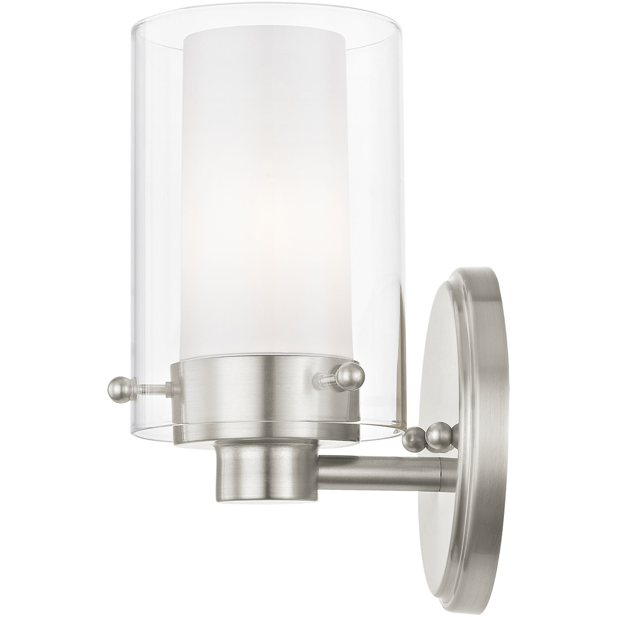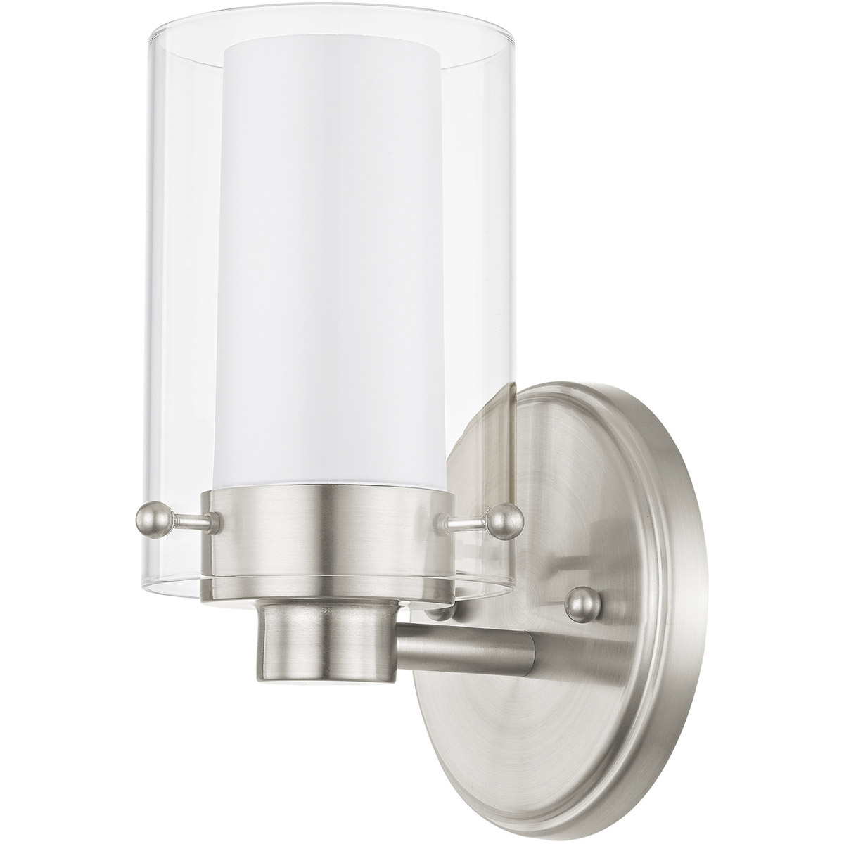 This transitional one light bathroom fixture will bring posh sophistication to your decor. The backplate and simple metal arms give this brushed nickel finish a sleek, contemporary look. Opal etched glass surrounds each light, encased in clear glass cylinders for a stunning double-glass effect.