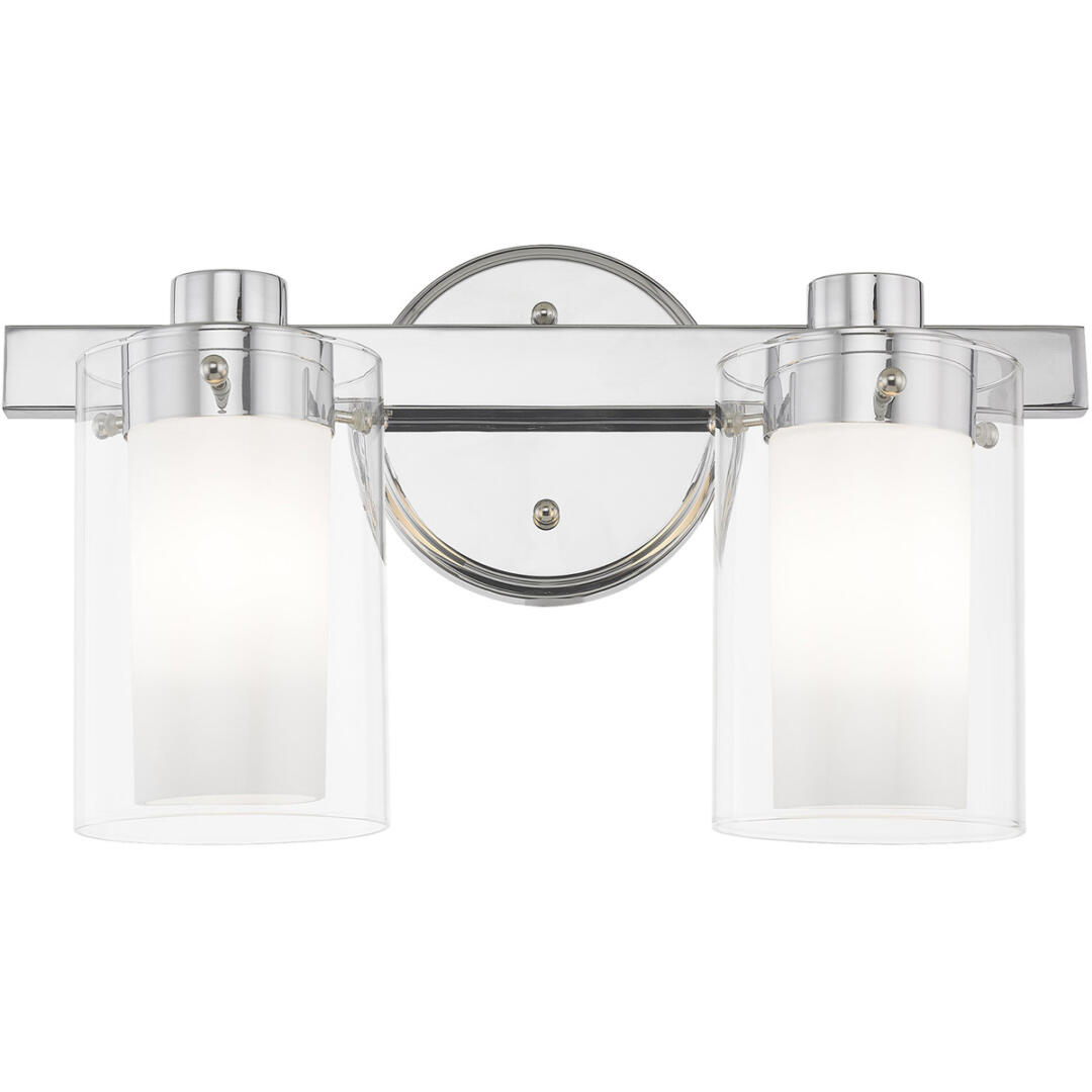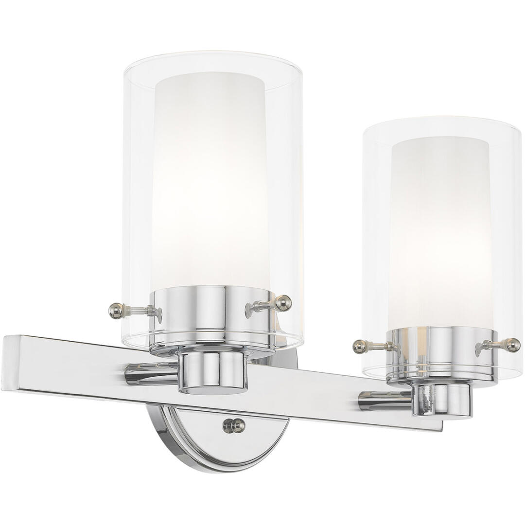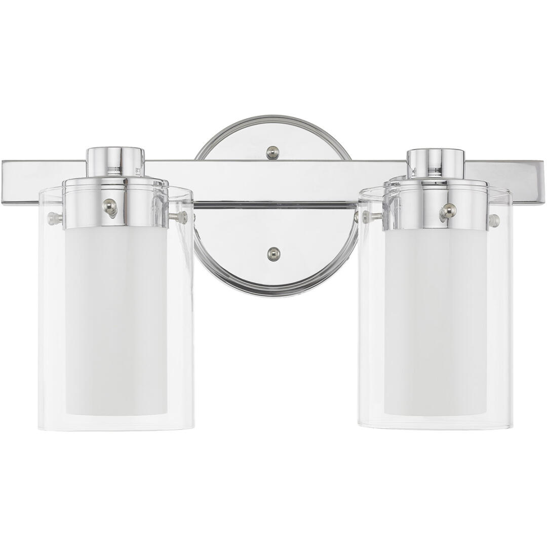 This transitional two light bathroom fixture will bring posh sophistication to your decor. The backplate and simple metal arms give this polished chrome finish a sleek, contemporary look. Opal etched glass surrounds each light, encased in clear glass cylinders for a stunning double-glass effect.