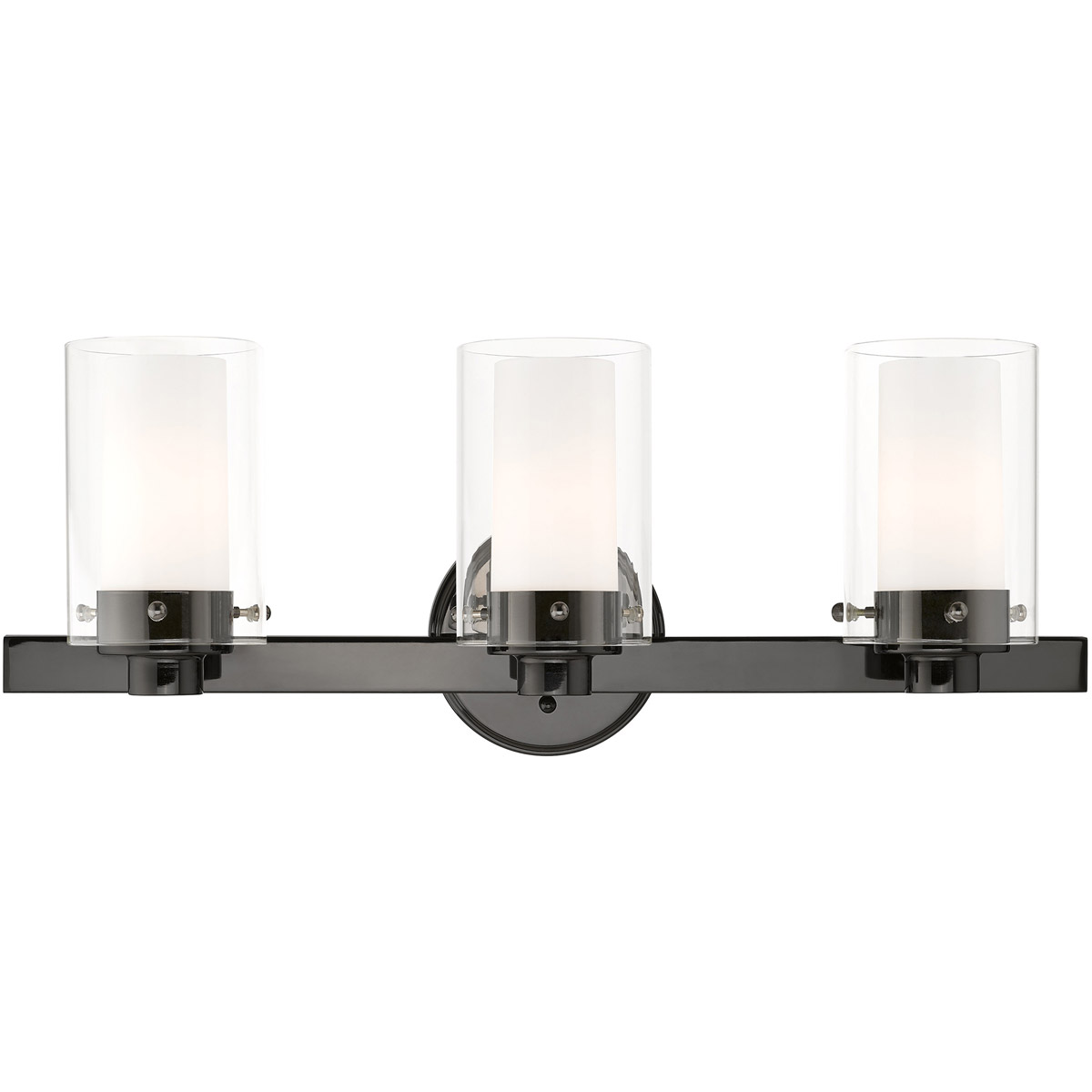 This transitional three-light Manhattan collection vanity sconce will bring posh sophistication to your decor. The backplate and simple metal arms give this polished black chrome finish a sleek, contemporary look. Opal etched glass surrounds each light, encased in clear glass cylinders for a stunning double-glass effect.