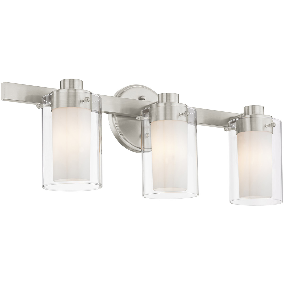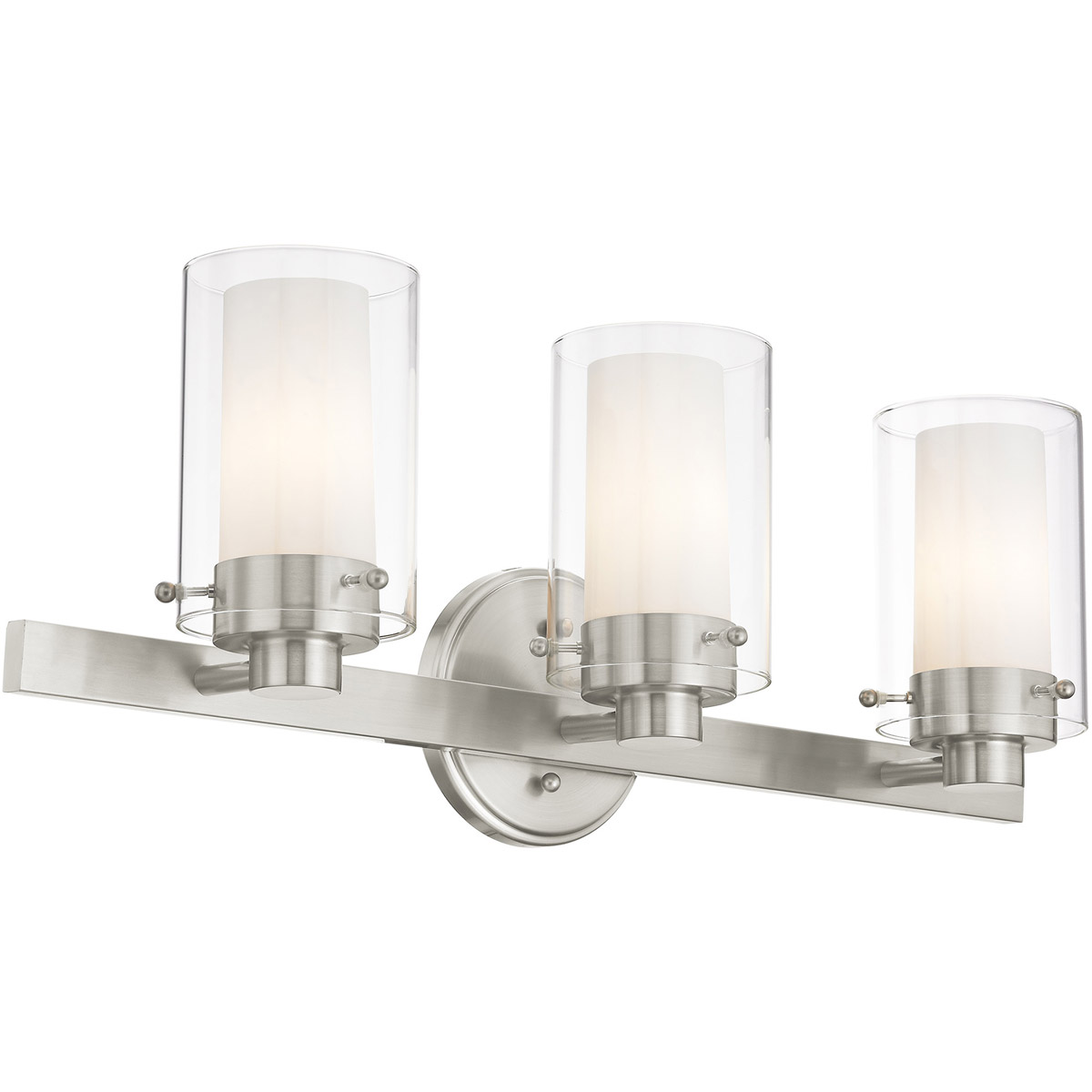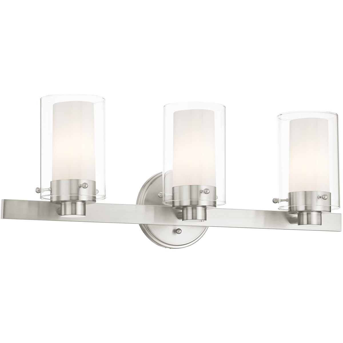 This transitional three light bathroom fixture will bring posh sophistication to your decor. The backplate and simple metal arms give this brushed nickel finish a sleek, contemporary look. Opal etched glass surrounds each light, encased in clear glass cylinders for a stunning double-glass effect.