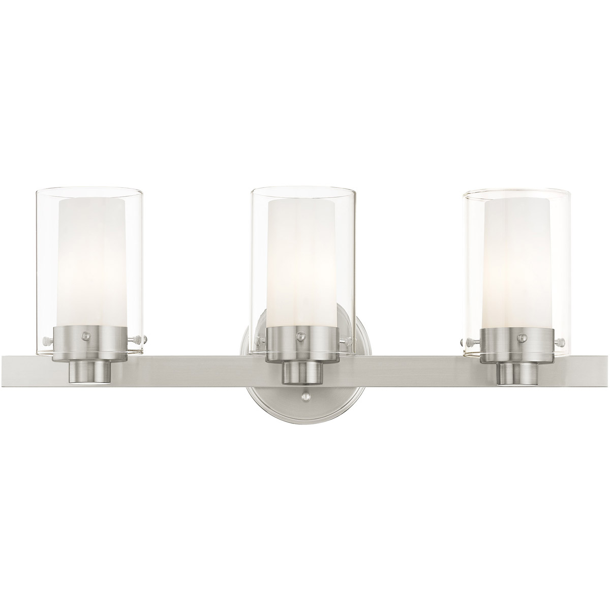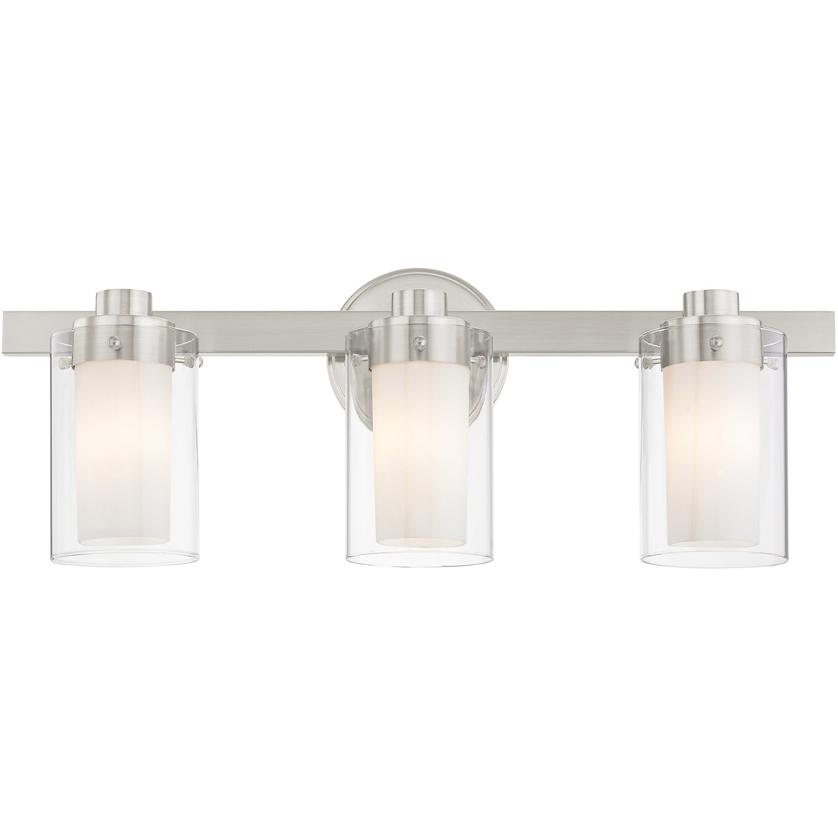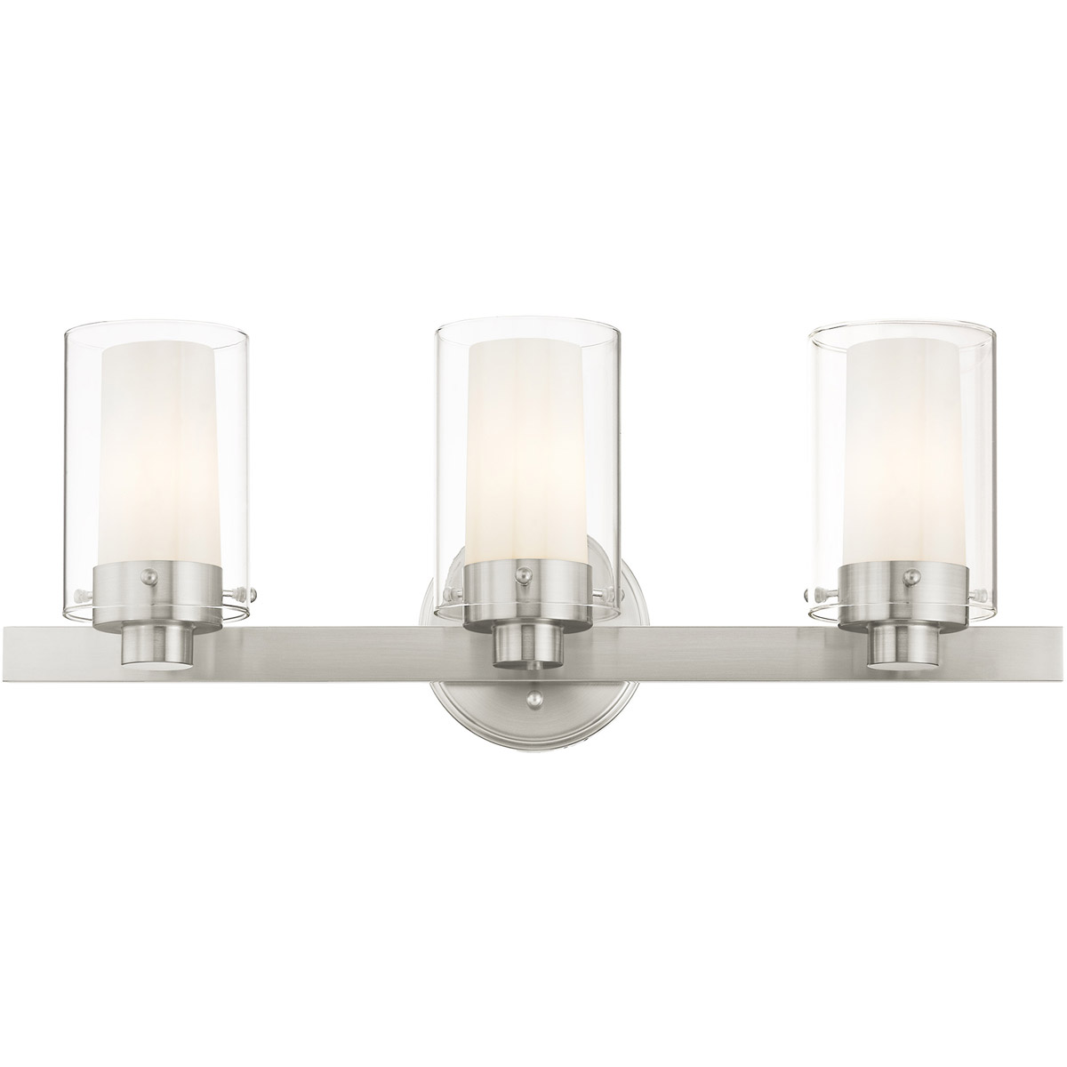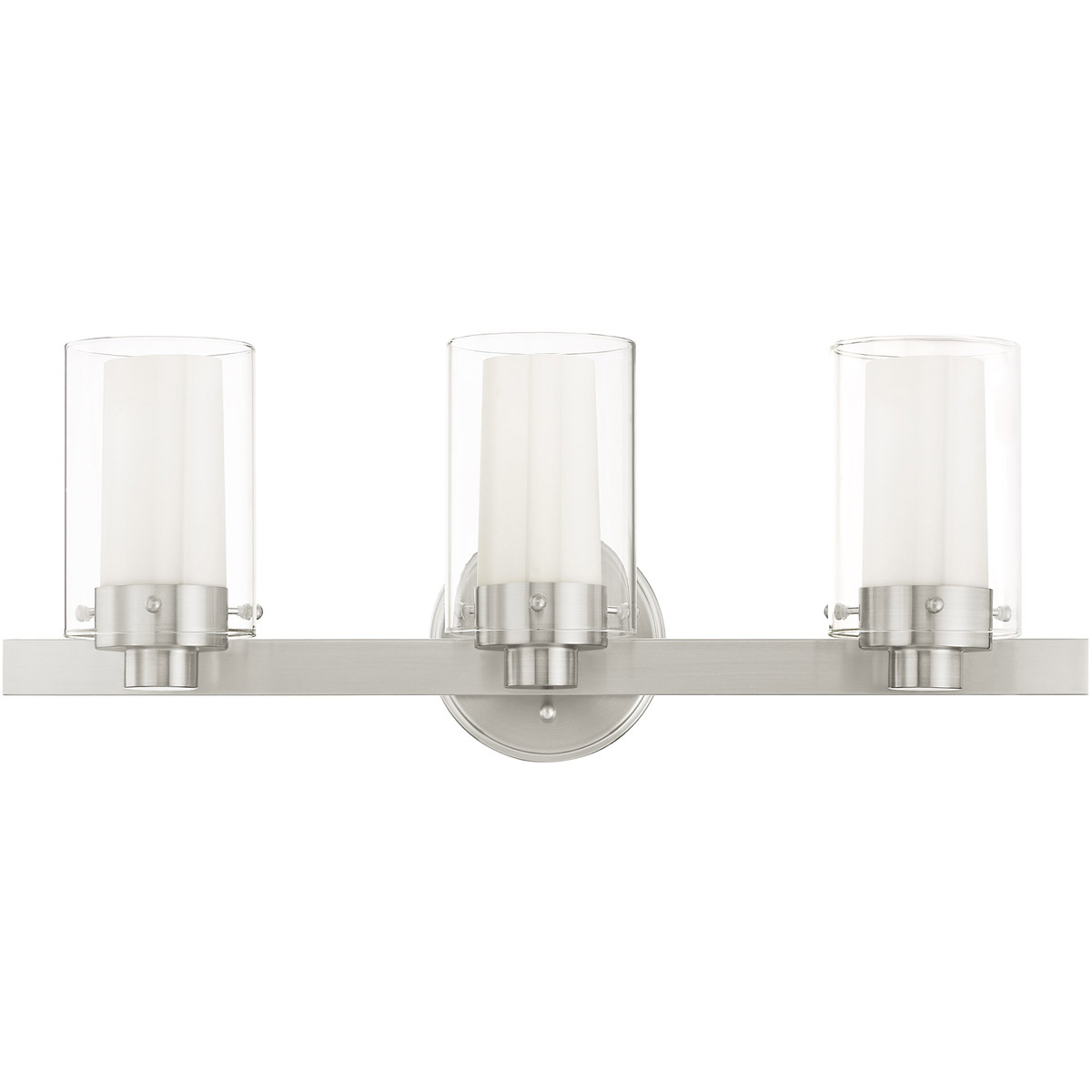 This transitional three light bathroom fixture will bring posh sophistication to your decor. The backplate and simple metal arms give this brushed nickel finish a sleek, contemporary look. Opal etched glass surrounds each light, encased in clear glass cylinders for a stunning double-glass effect.