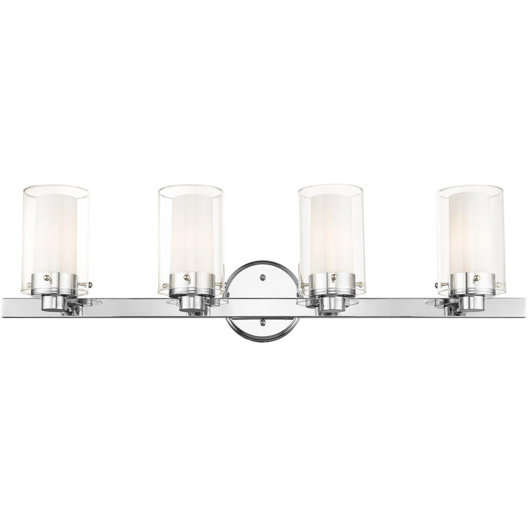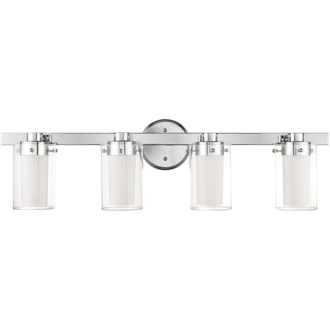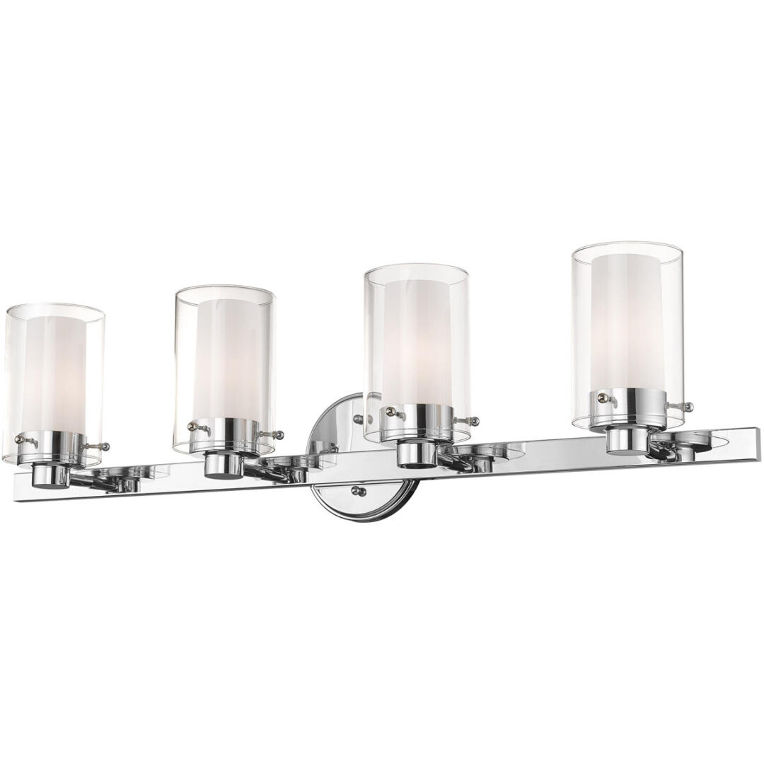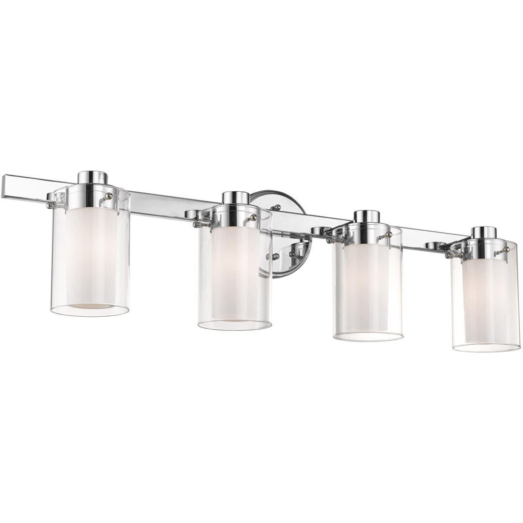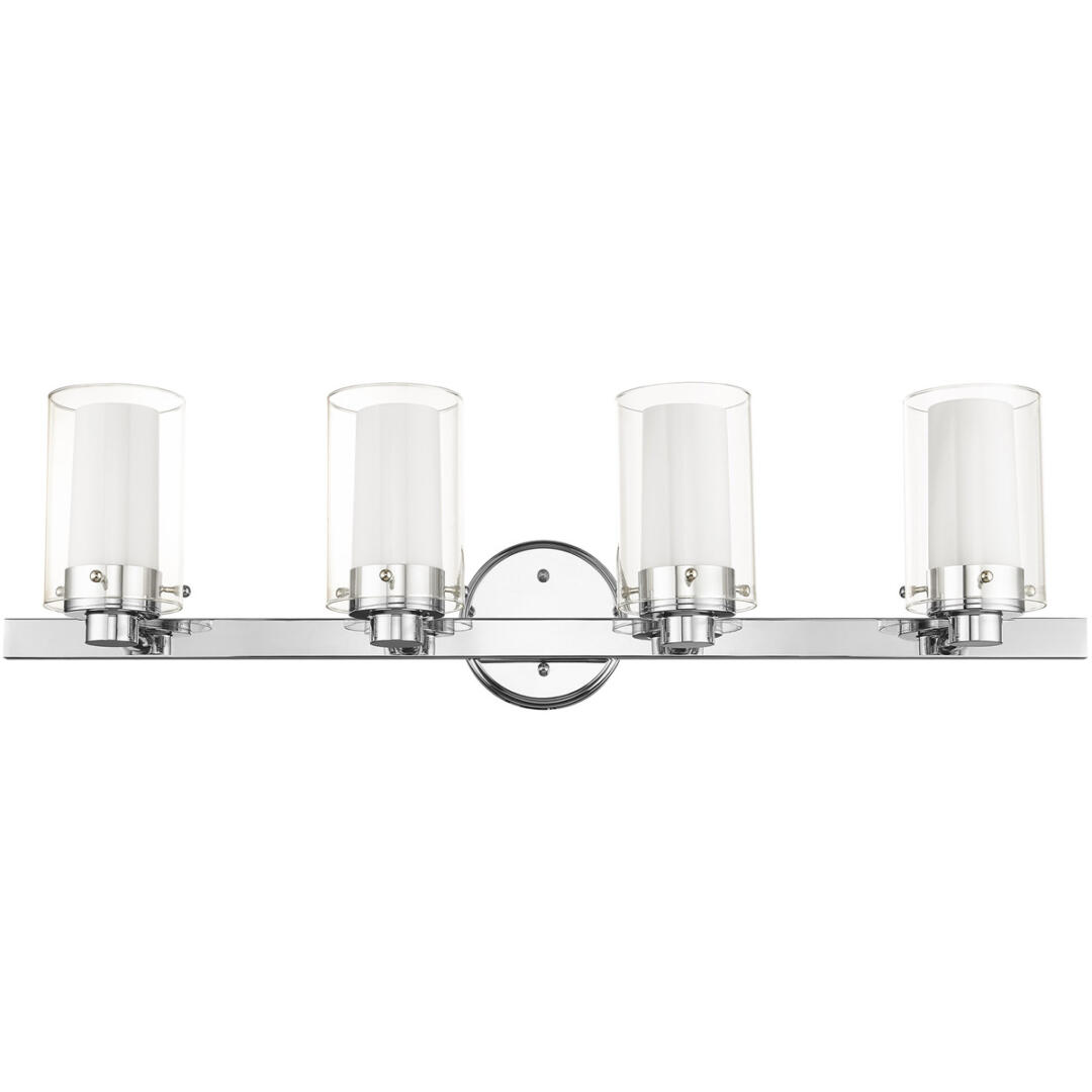 This transitional four light bathroom fixture will bring posh sophistication to your decor. The backplate and simple metal arms give this polished chrome finish a sleek, contemporary look. Opal etched glass surrounds each light, encased in clear glass cylinders for a stunning double-glass effect.