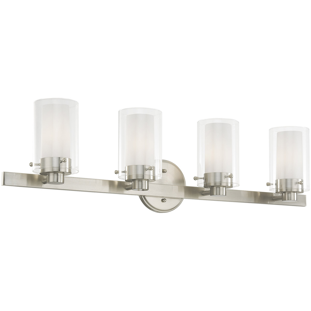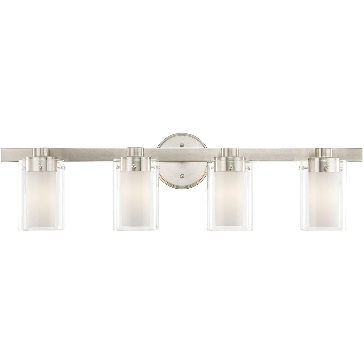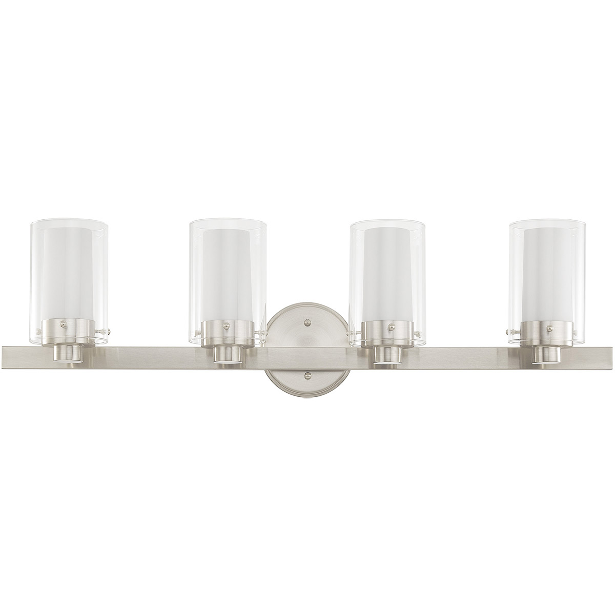 This transitional four light bathroom fixture will bring posh sophistication to your decor. The backplate and simple metal arms give this brushed nickel finish a sleek, contemporary look. Opal etched glass surrounds each light, encased in clear glass cylinders for a stunning double-glass effect.