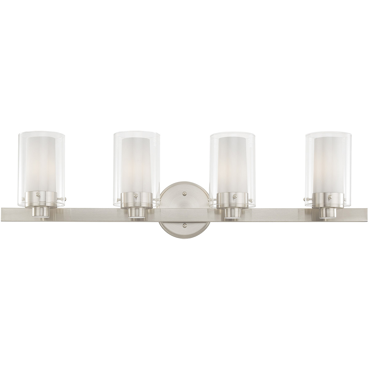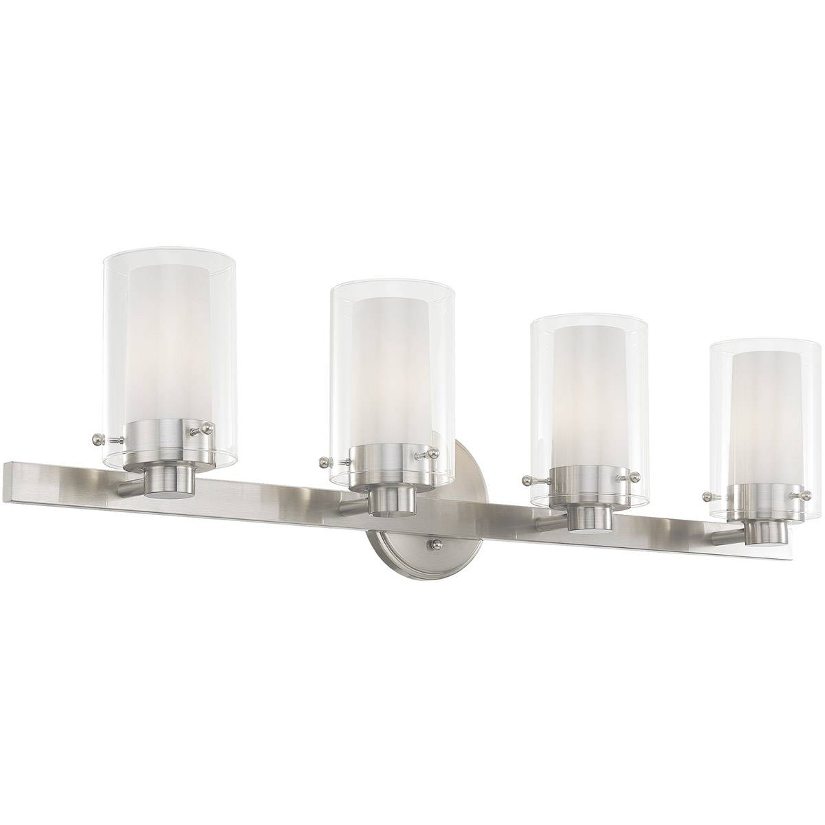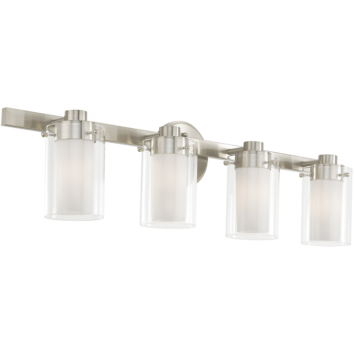 This transitional four light bathroom fixture will bring posh sophistication to your decor. The backplate and simple metal arms give this brushed nickel finish a sleek, contemporary look. Opal etched glass surrounds each light, encased in clear glass cylinders for a stunning double-glass effect.