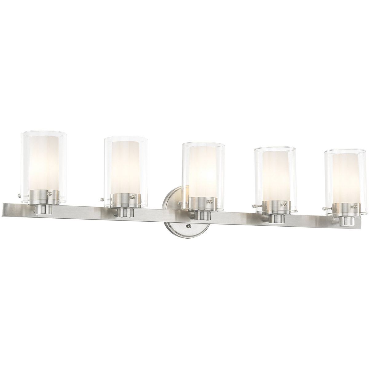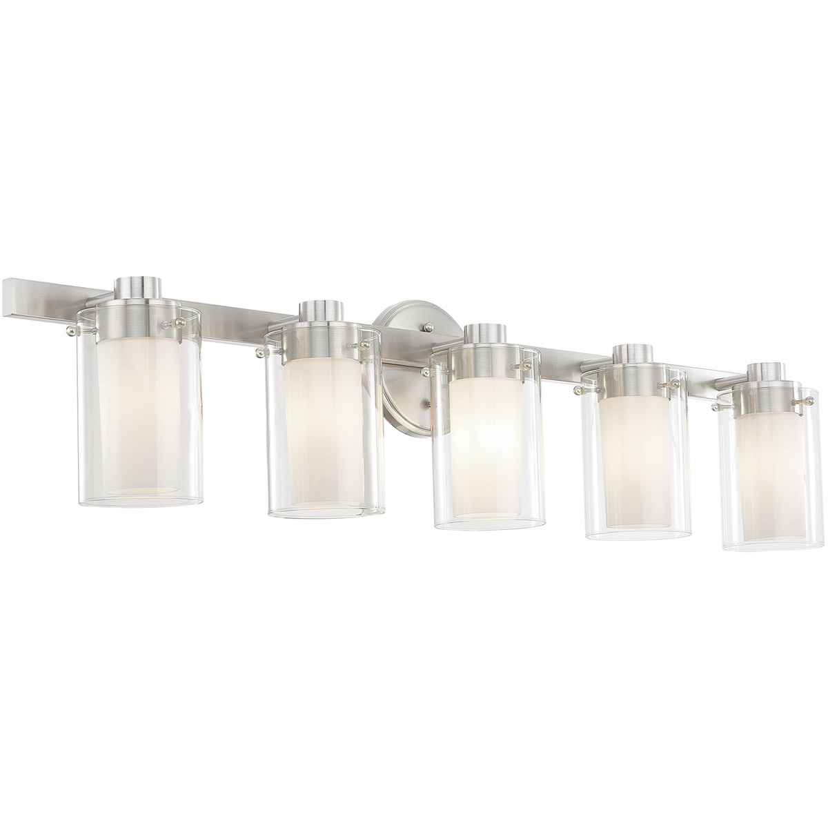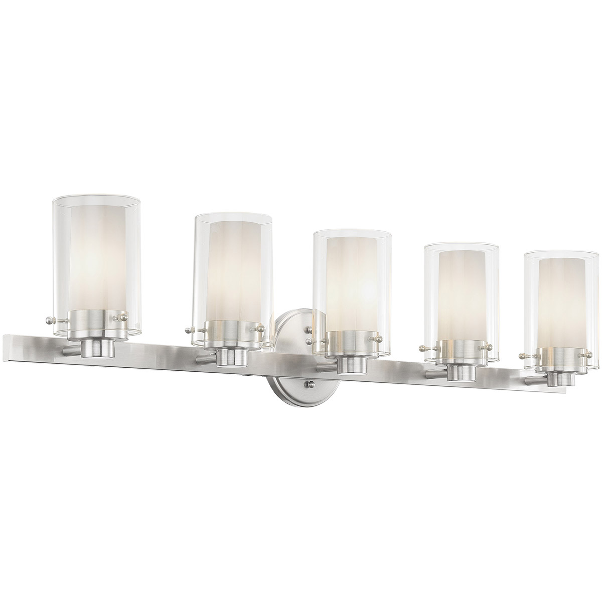 This transitional five light bathroom fixture will bring posh sophistication to your decor. The backplate and simple metal arms give this brushed nickel finish a sleek, contemporary look. Opal etched glass surrounds each light, encased in clear glass cylinders for a stunning double-glass effect.
