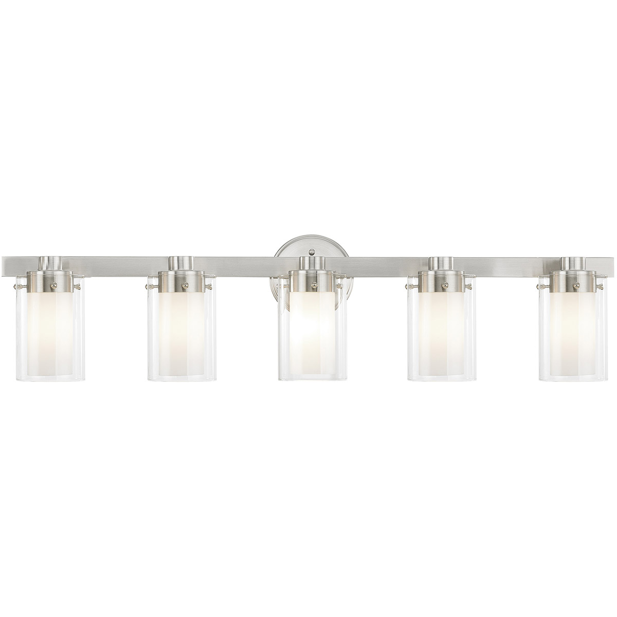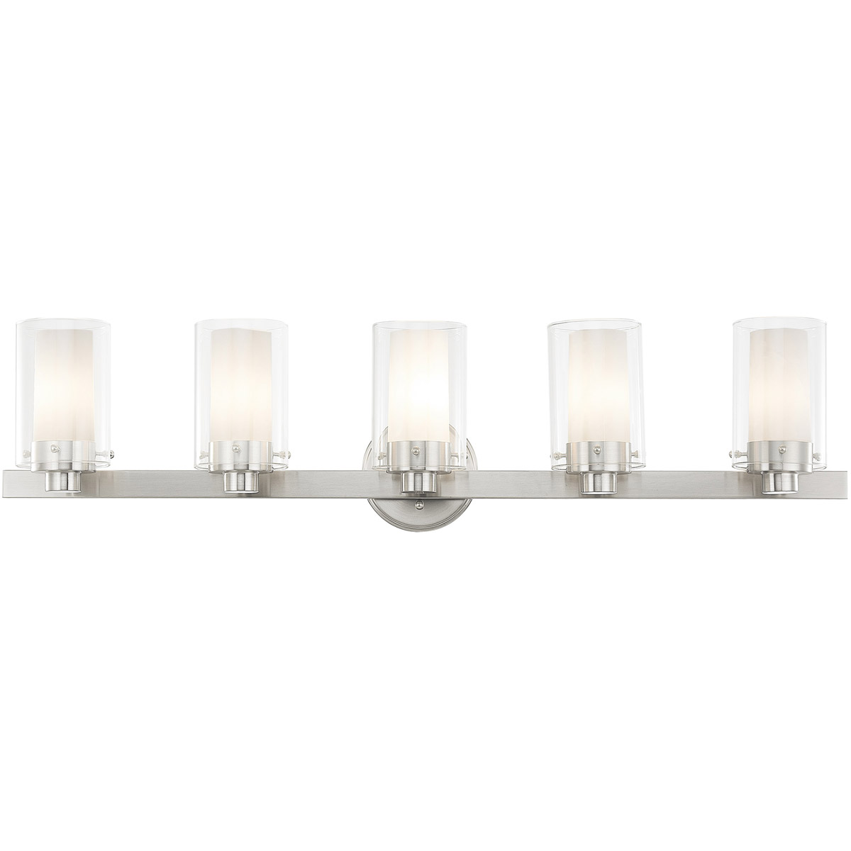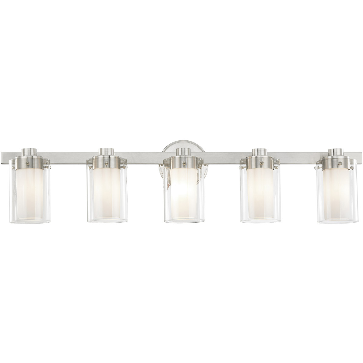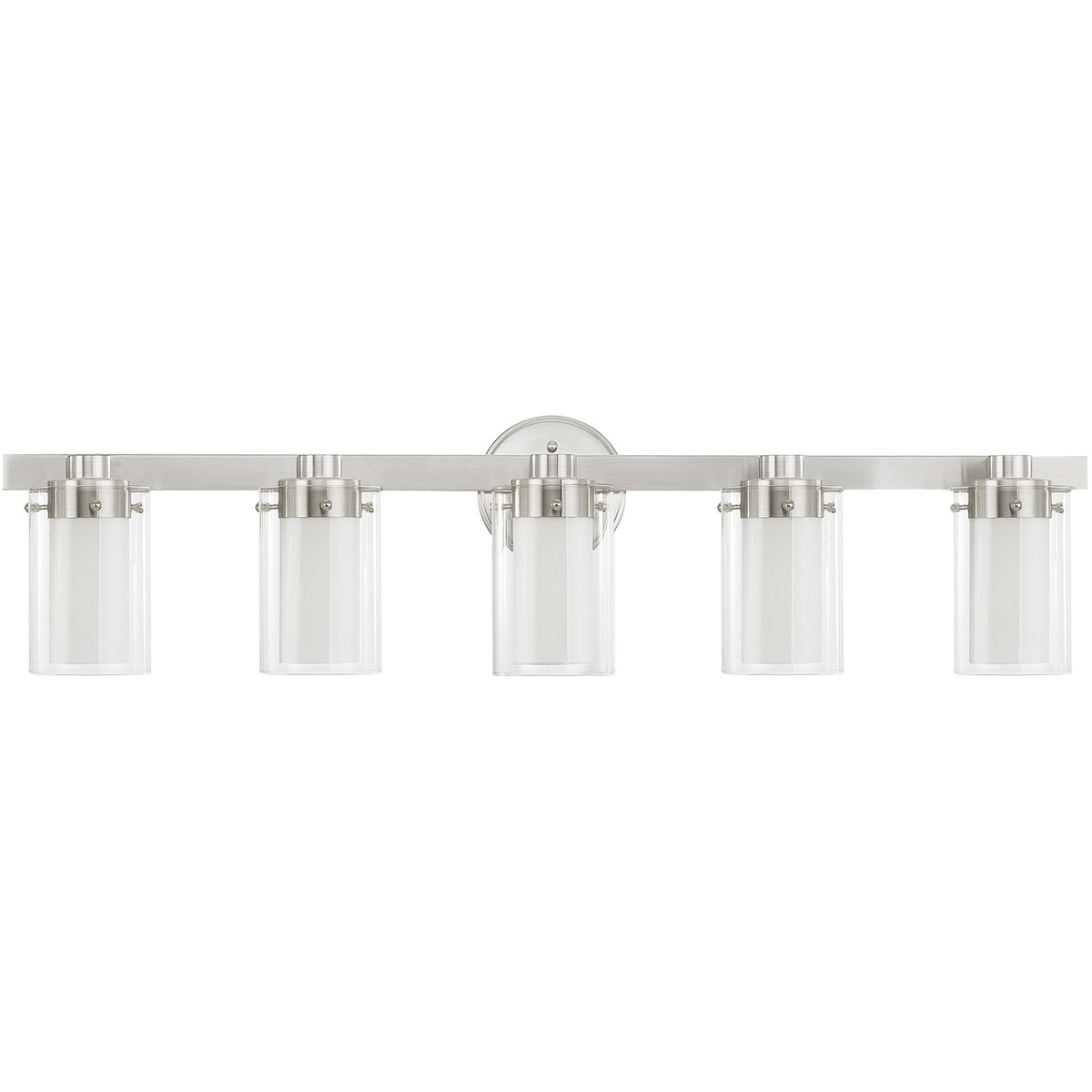 This transitional five light bathroom fixture will bring posh sophistication to your decor. The backplate and simple metal arms give this brushed nickel finish a sleek, contemporary look. Opal etched glass surrounds each light, encased in clear glass cylinders for a stunning double-glass effect.