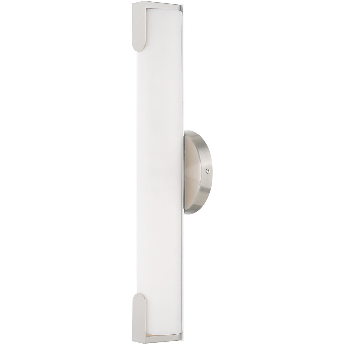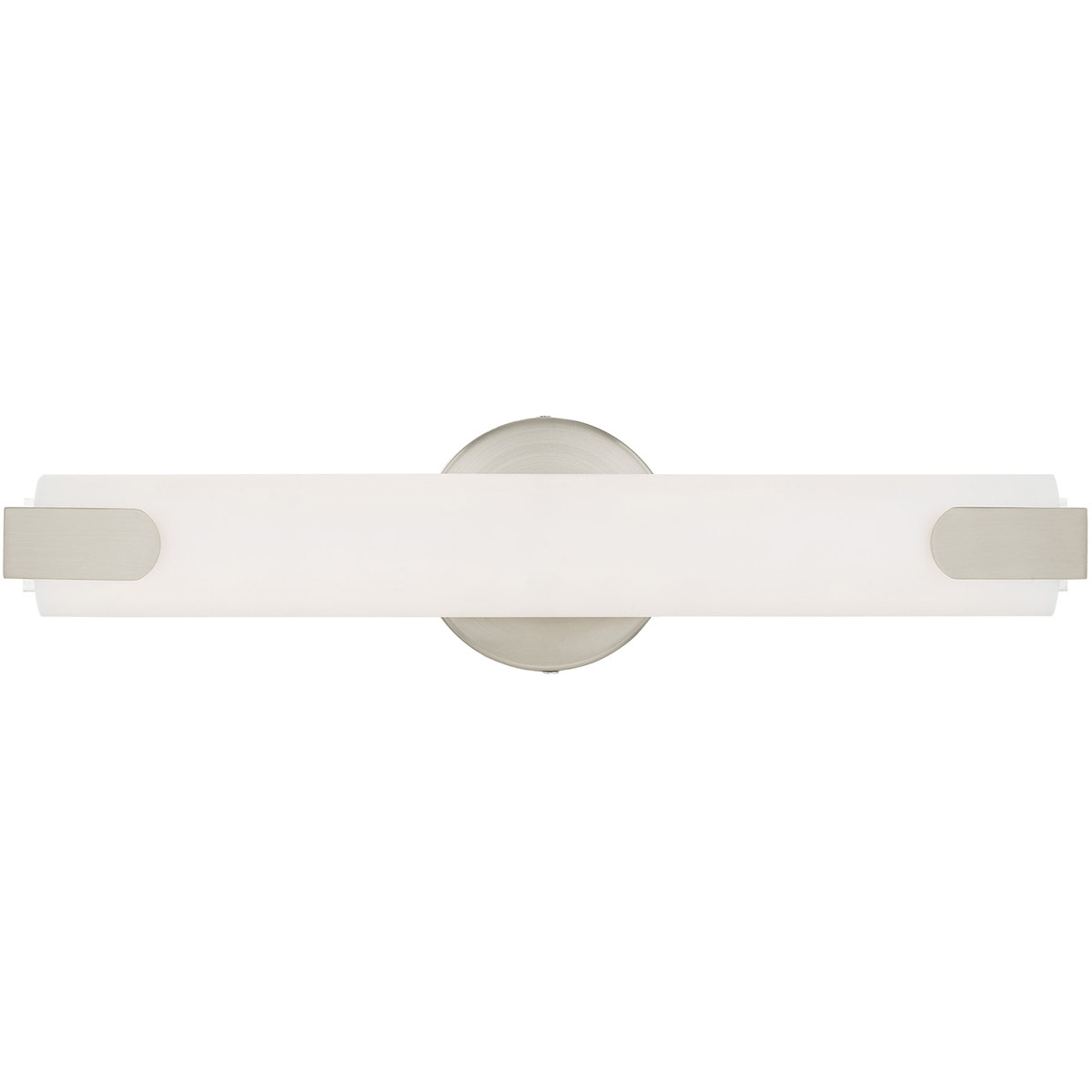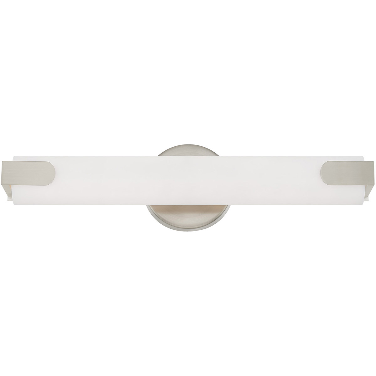 A simple satin white acrylic shade creates the bold appearance of this contemporary bath light. The brushed nickel frame encloses this energy-efficient design that glows with uniform light from an integrated LED module. Can be installed vertically or horizontally.