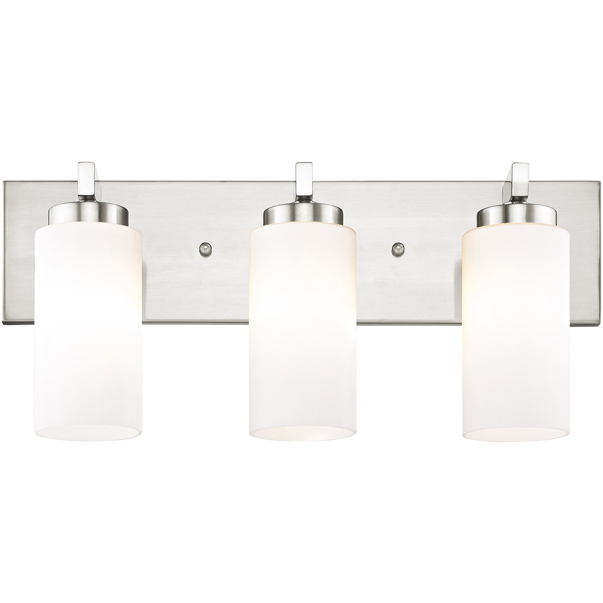 Tired of starting each day looking at the same, worn out bathroom lighting? Why not wake up to the brushed nickel finish and hand blown satin opal white cylinder glass of this three light bathroom fixture?