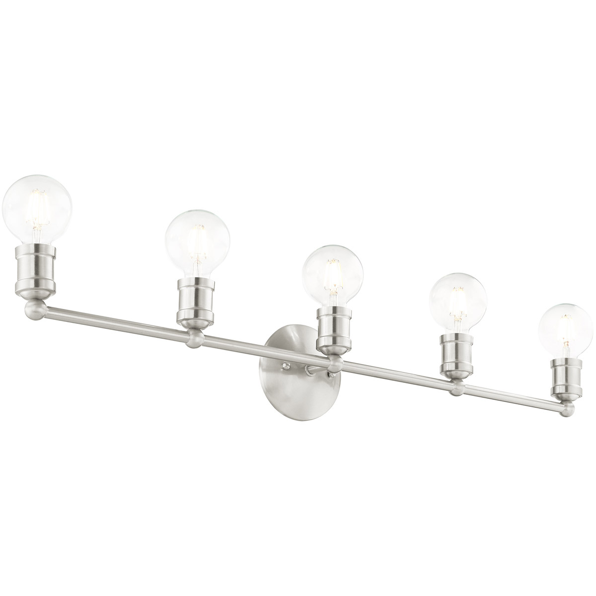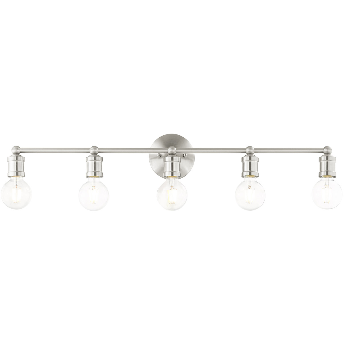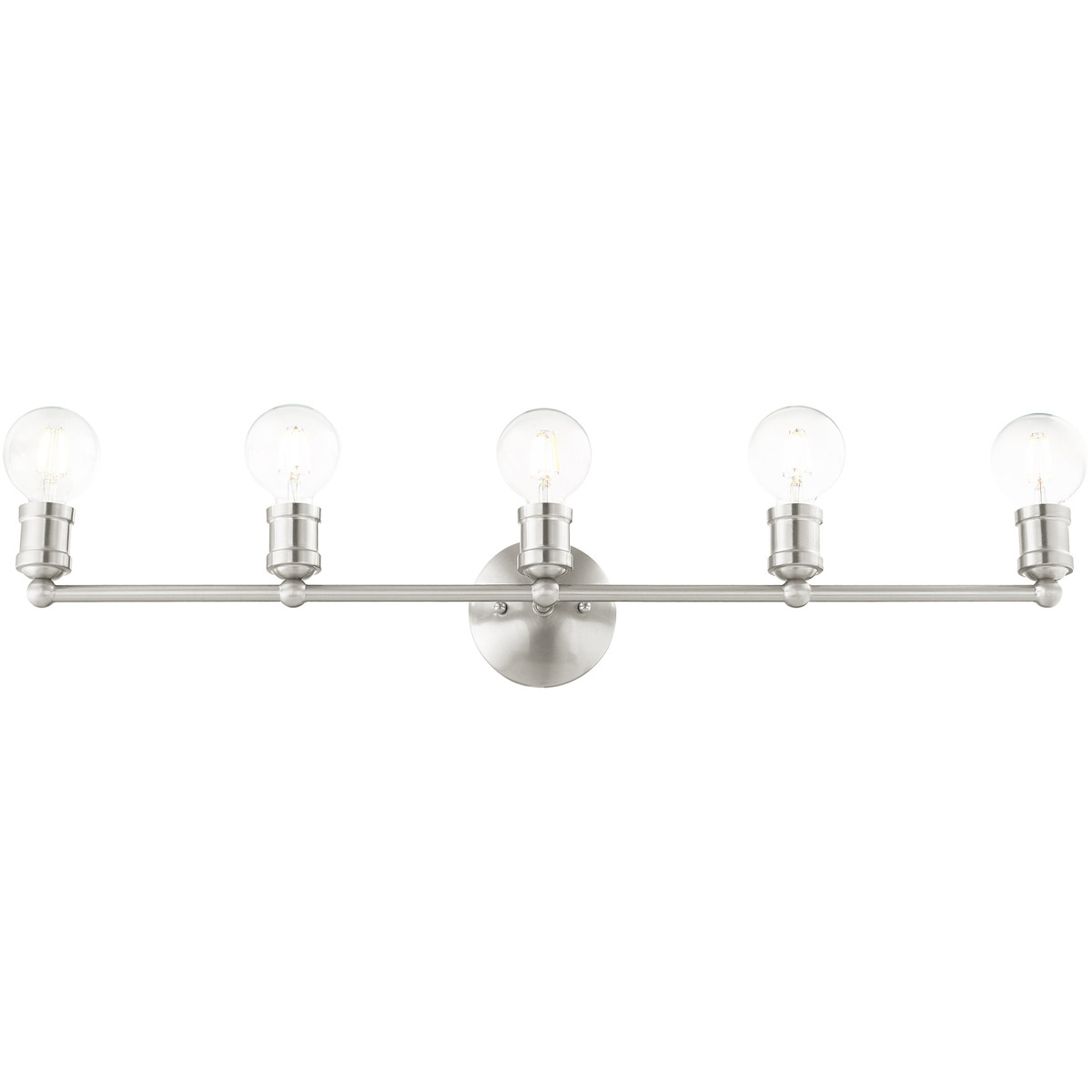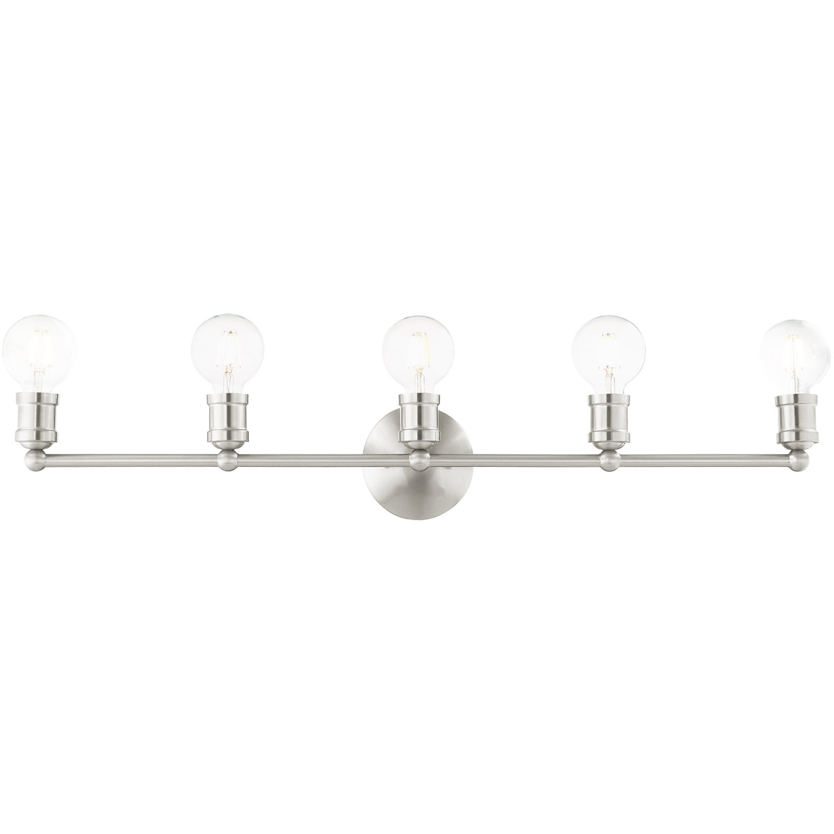 Clean lines and exposed bulb sockets make the Lansdale collection perfect for your mid-mod or transitional bath. The eclectic look is perfect for spaces wanting an urban, minimalistic or industrial touch. With superb craftsmanship and affordable price, this brushed nickel five-light vanity sconce is sure to tastefully indulge your extravagant side.