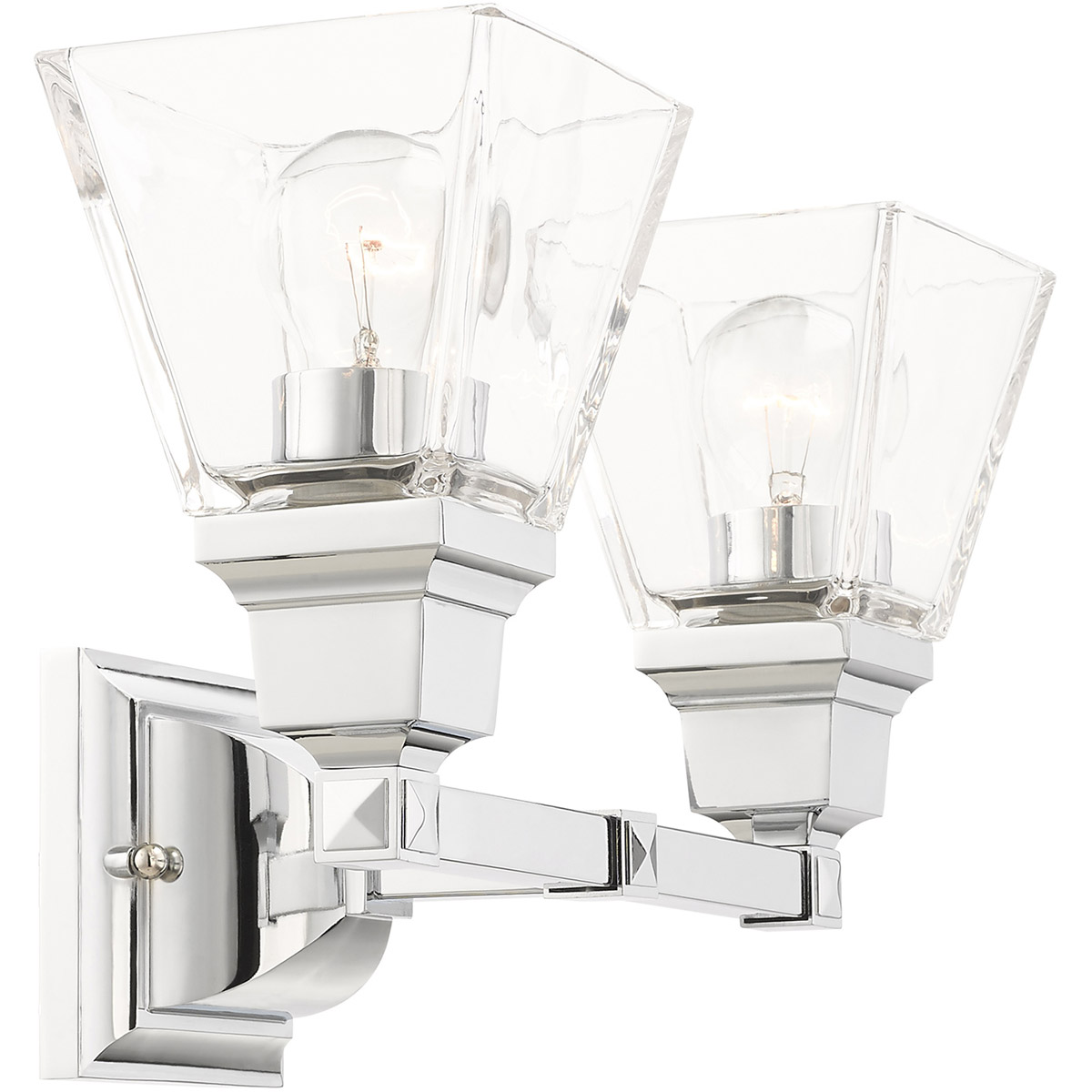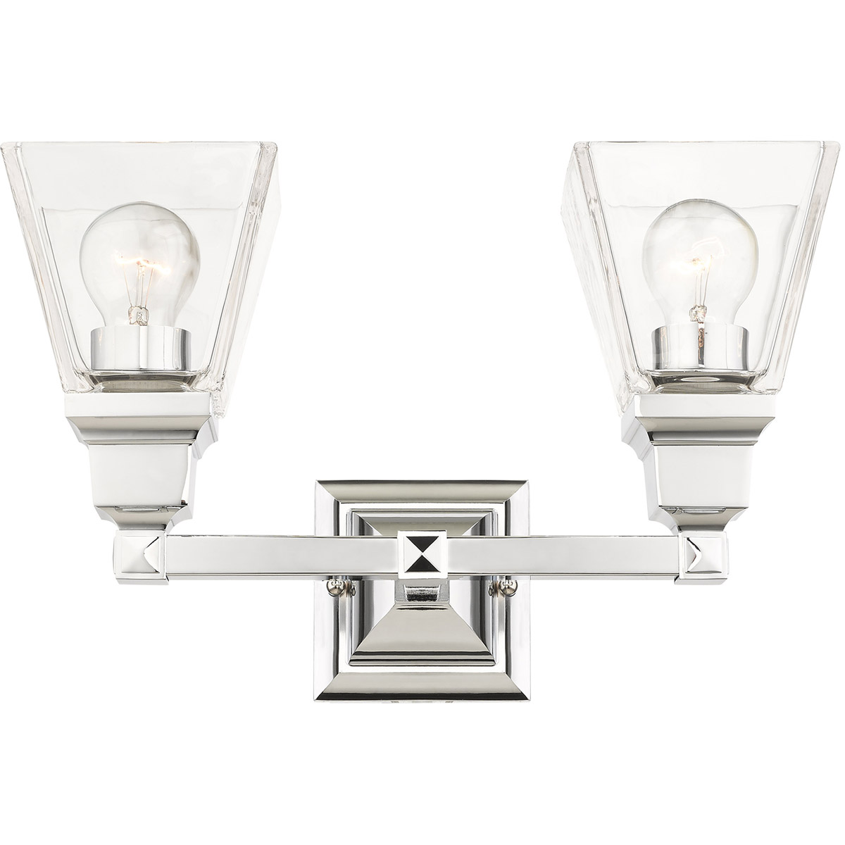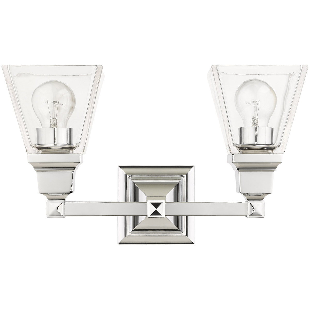The Mission collection has clean lines with geometric forms. This two light bath vanity light features clear glass on polished chrome, square style arms that elevates the classic look.