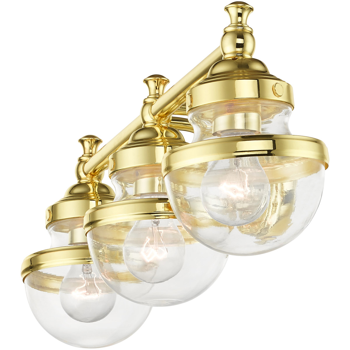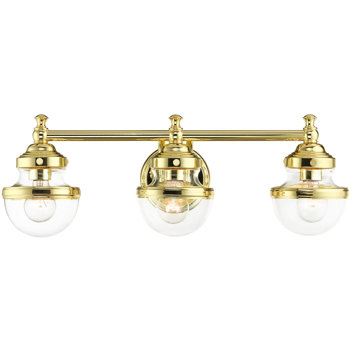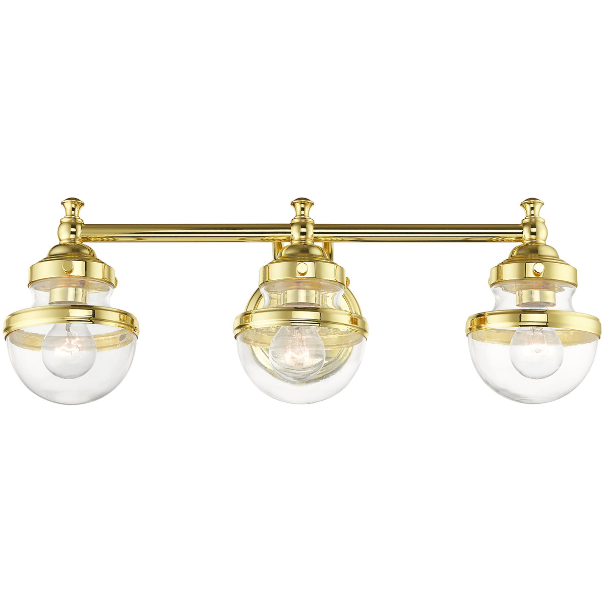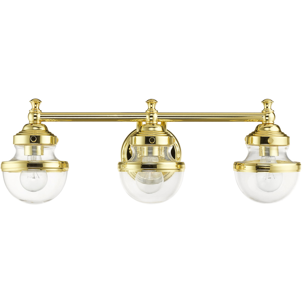 Sleek and simple lines define this beautiful polished brass finish three-light vanity sconce from the Oldwick collection. The clean, bold look of modernity blends with a raw industrial inspiration and hand blown clear glass give this design a versatile and eclectic look that works with nearly any style of home decor.