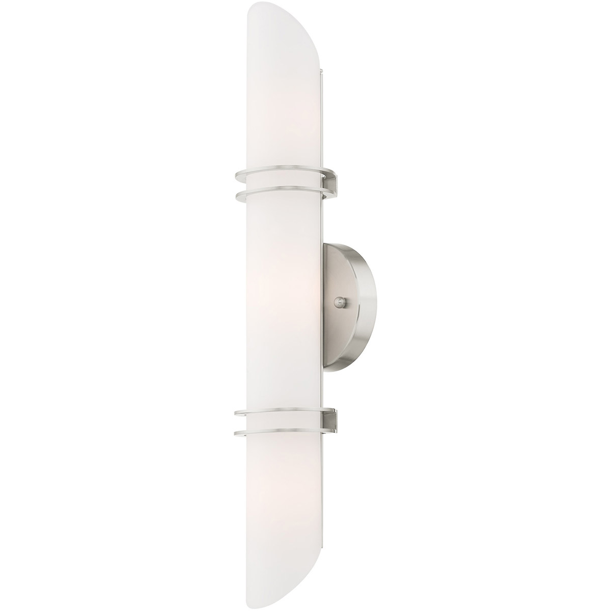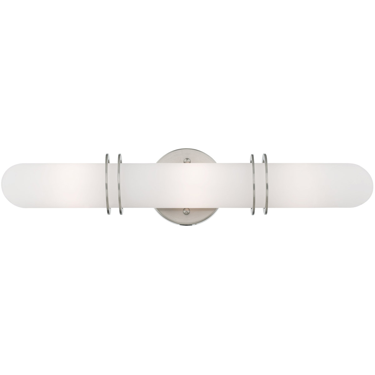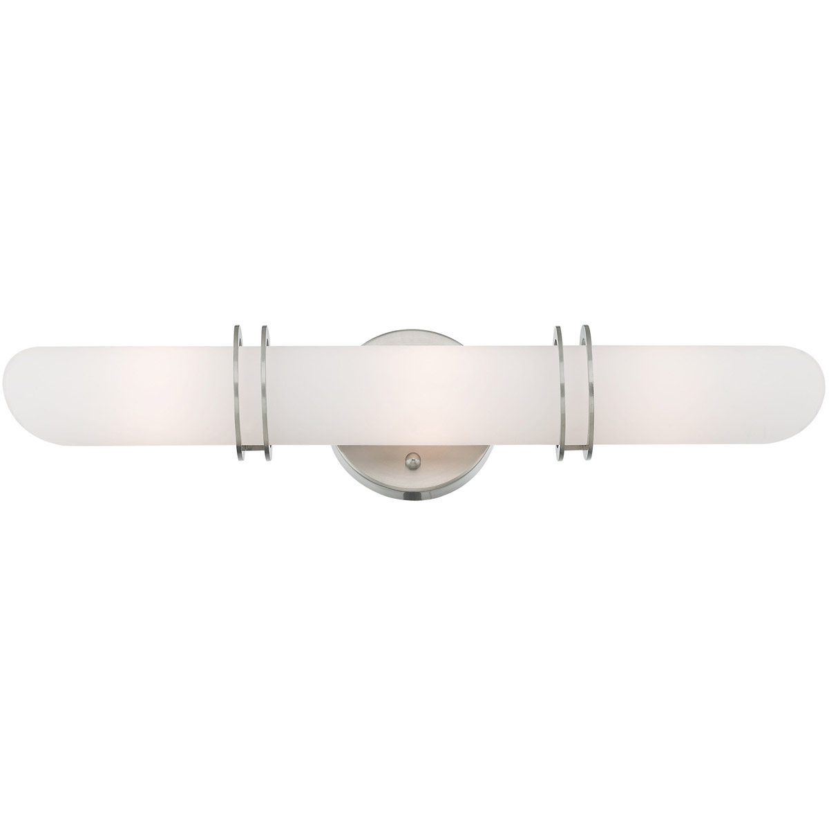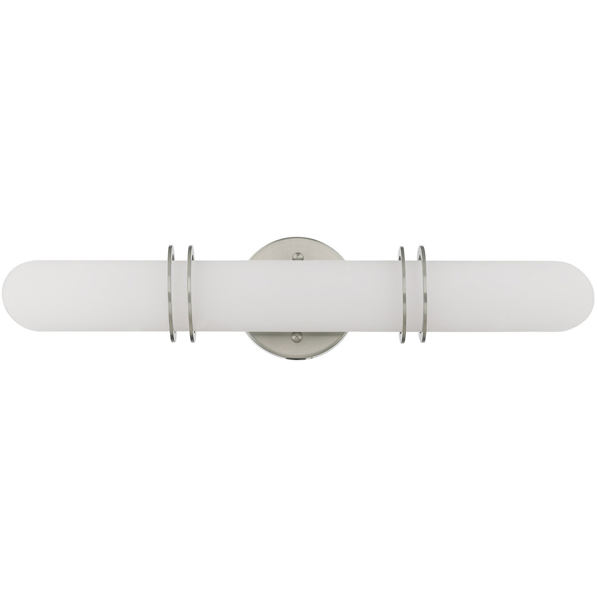 Create warm ambient lighting with this contemporary style bath fixture. It’s soft brushed nickel finish creates sleek lines in the frame. It features a hand blown satin opal white glass, ideal for giving your room a soft light. This fixture can be mounted vertically or horizontally.