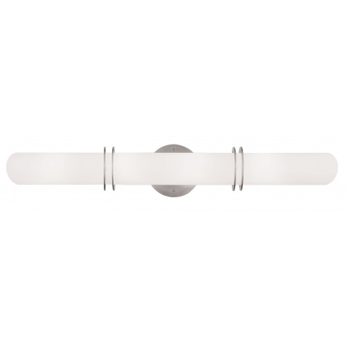 Create warm ambient lighting with this contemporary style bath fixture. It’s soft brushed nickel finish creates sleek lines in the frame. It features a hand blown satin opal white glass, ideal for giving your room a soft light. This fixture can be mounted vertically or horizontally.